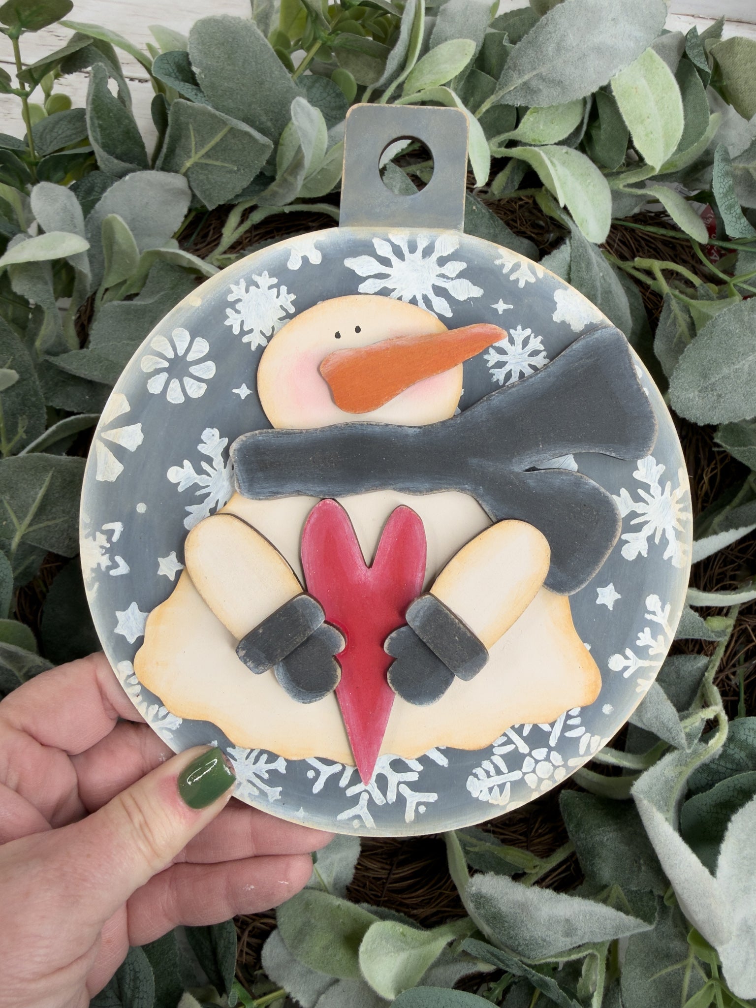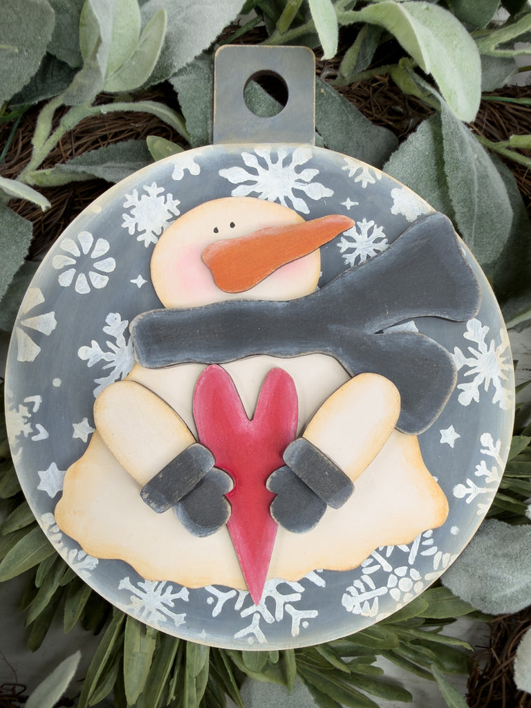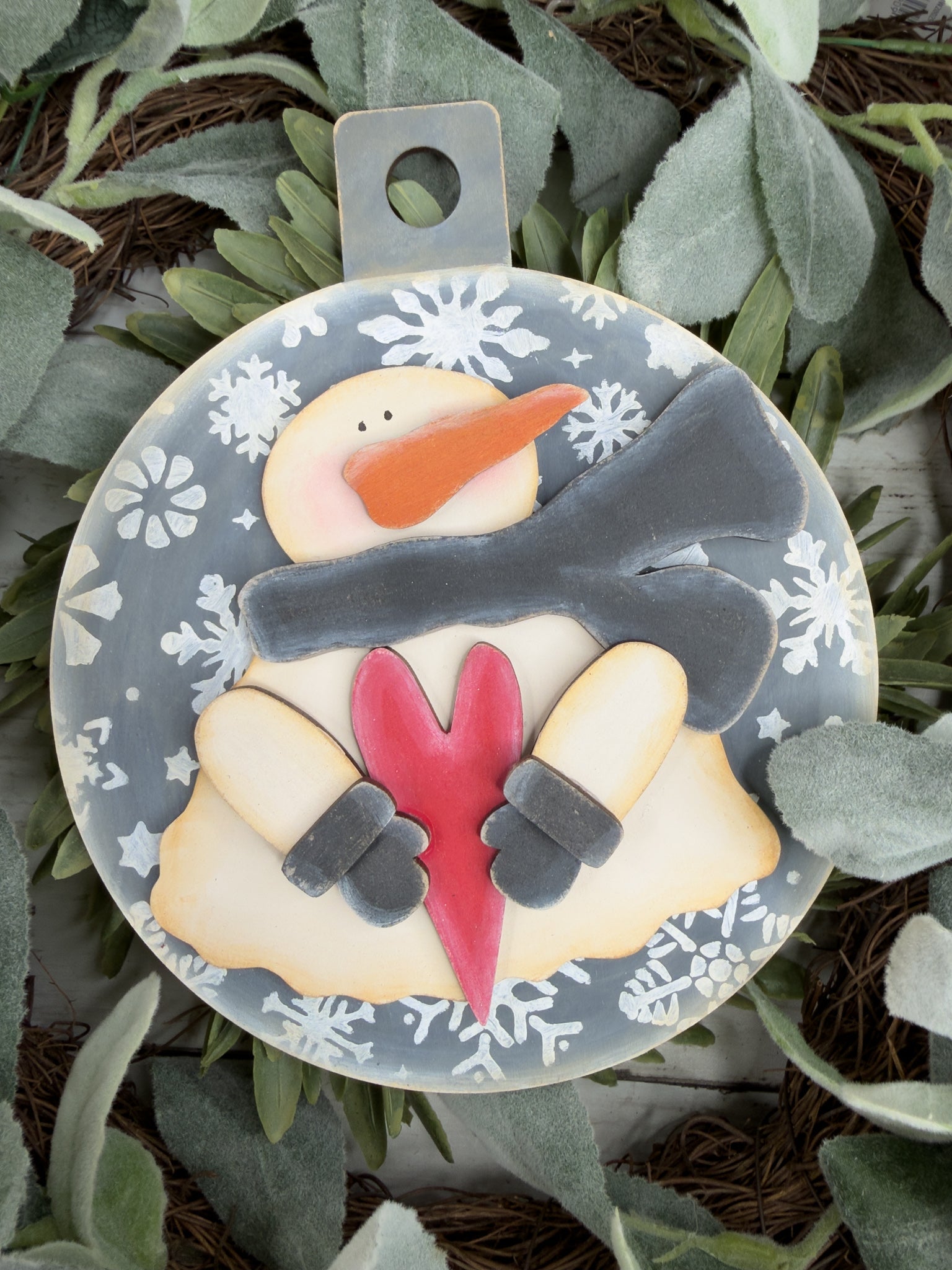 • Layered snowman design with scarf, mittens, nose, and round board base