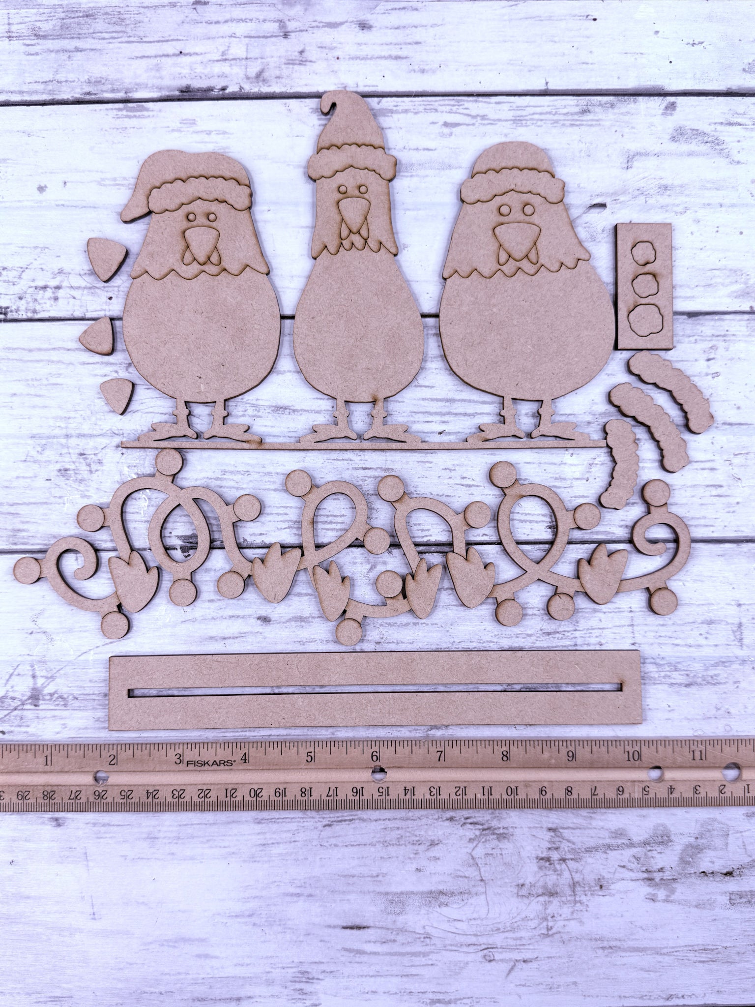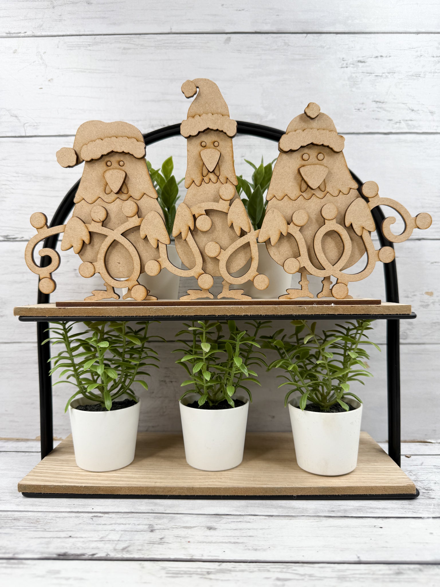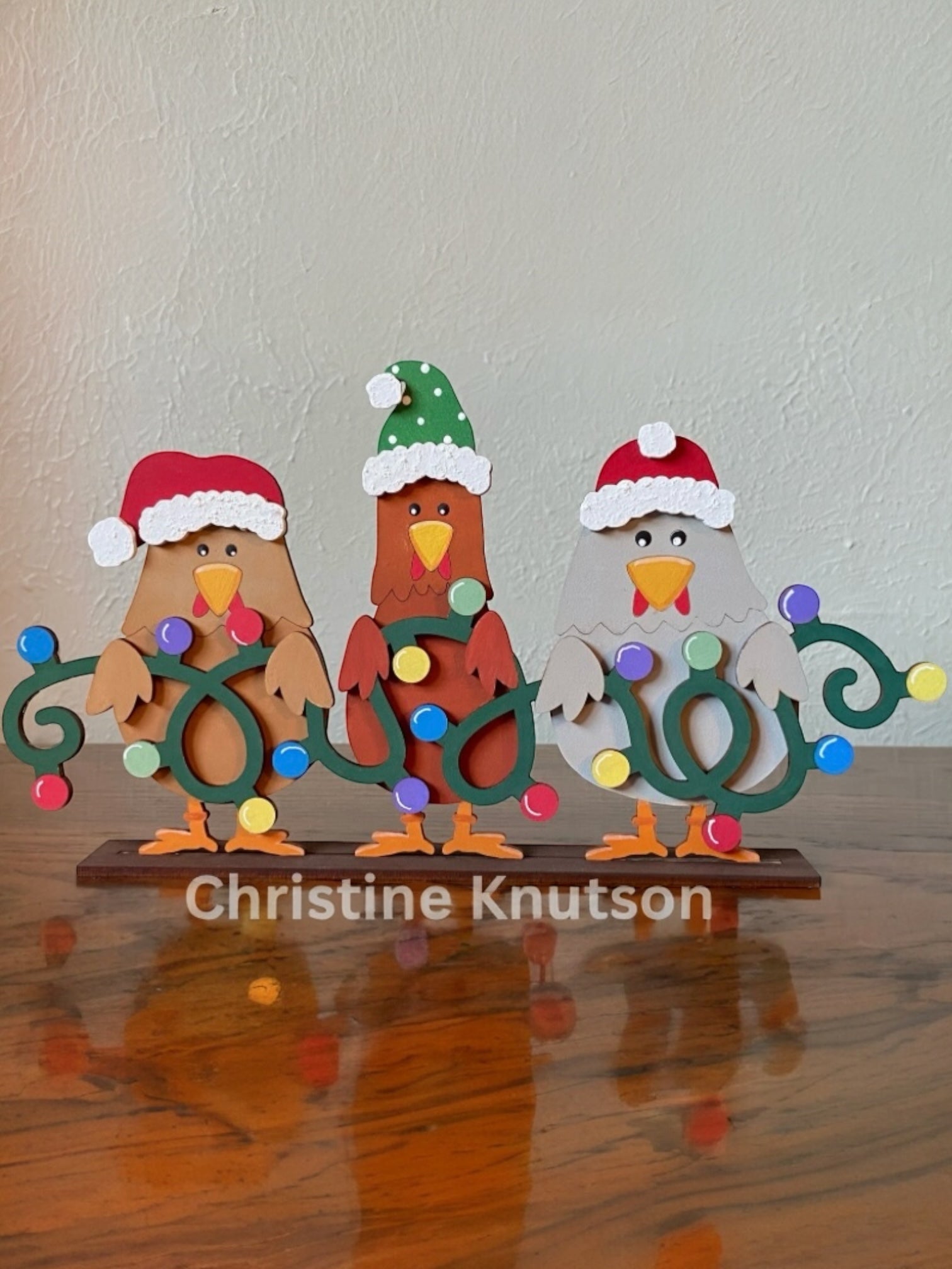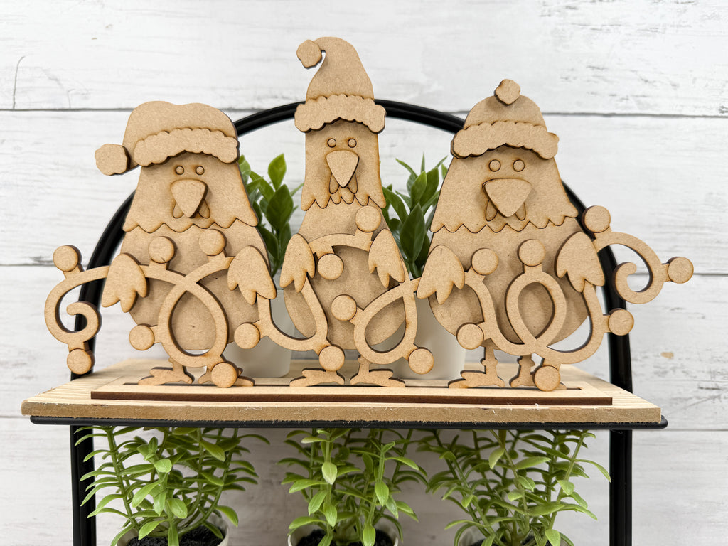 1 unfinished laser-cut wood cutout featuring 3 chickens with Santa hats and lights