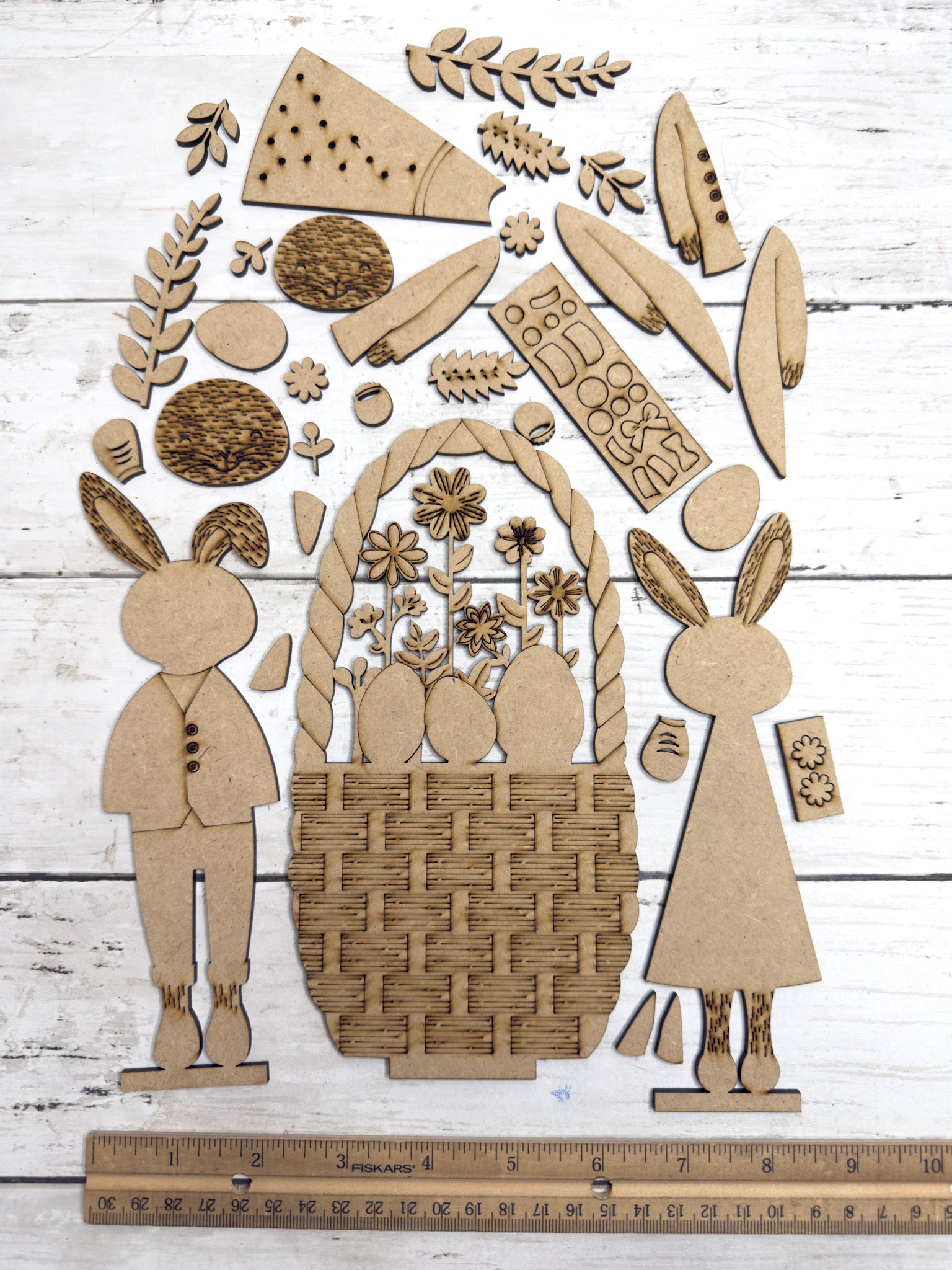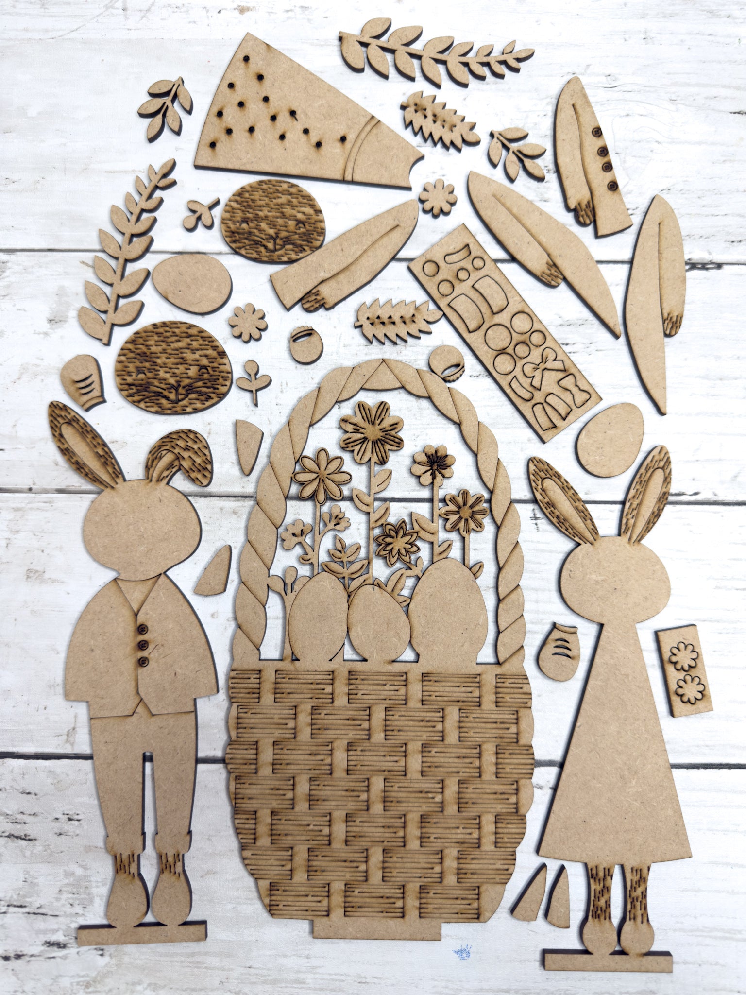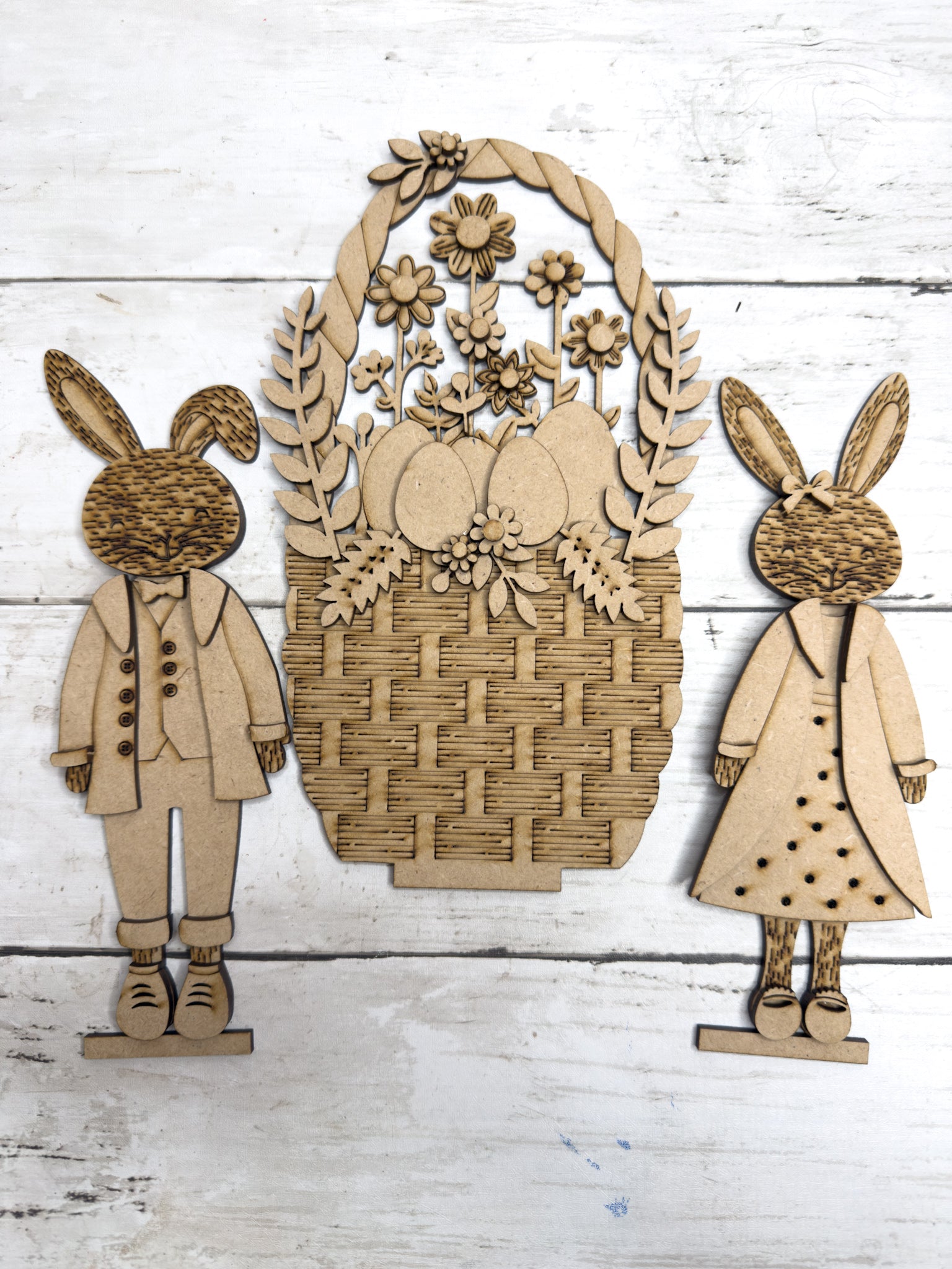 This charming Easter design features two adorable bunnies dressed in soft pastel clothing, a woven basket filled with colorful eggs, and floral accents in gentle spring tones—perfect for Easter and spring decorating.