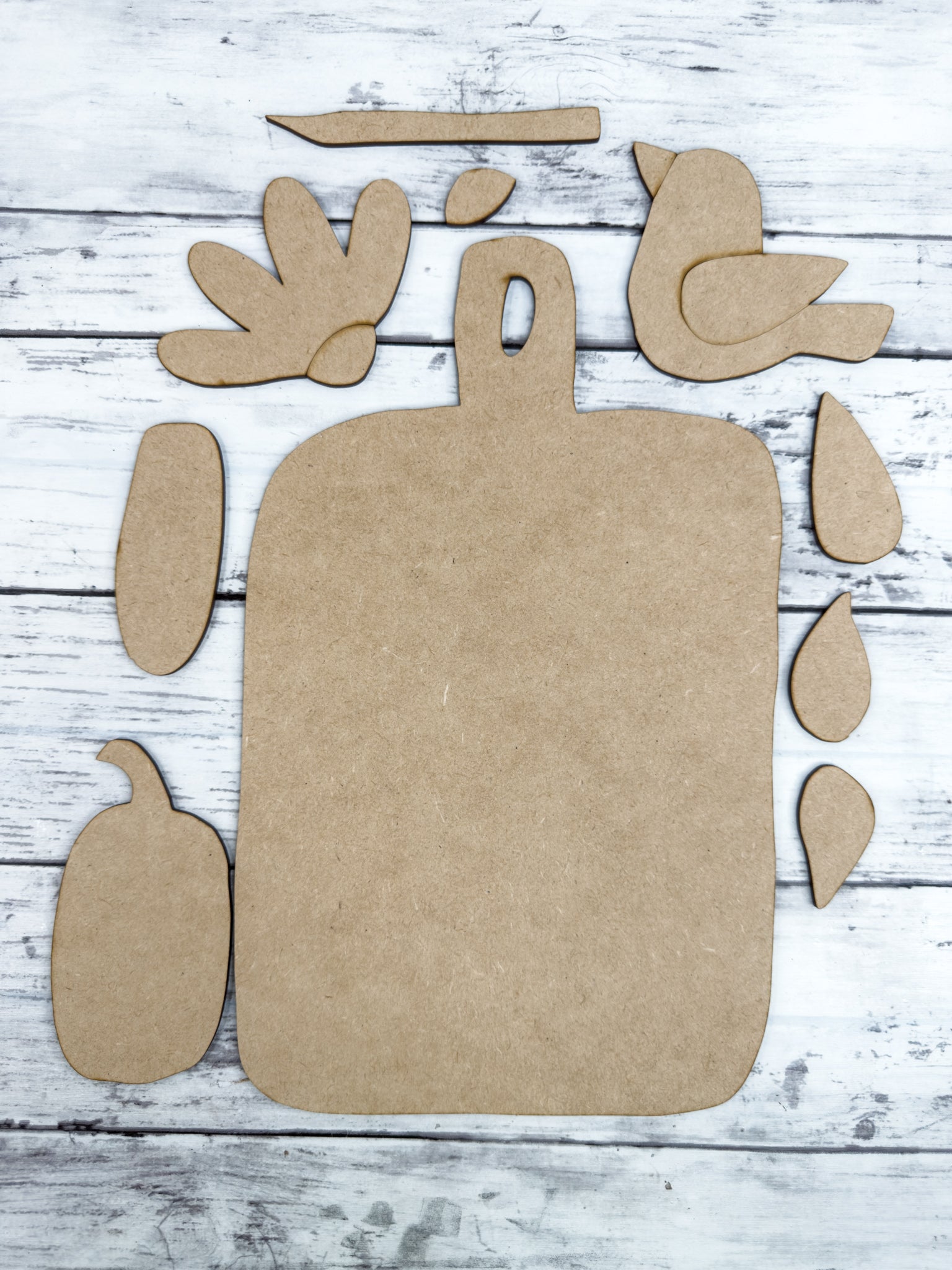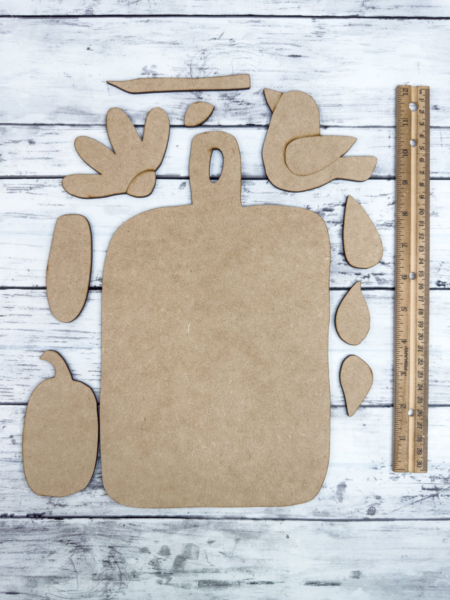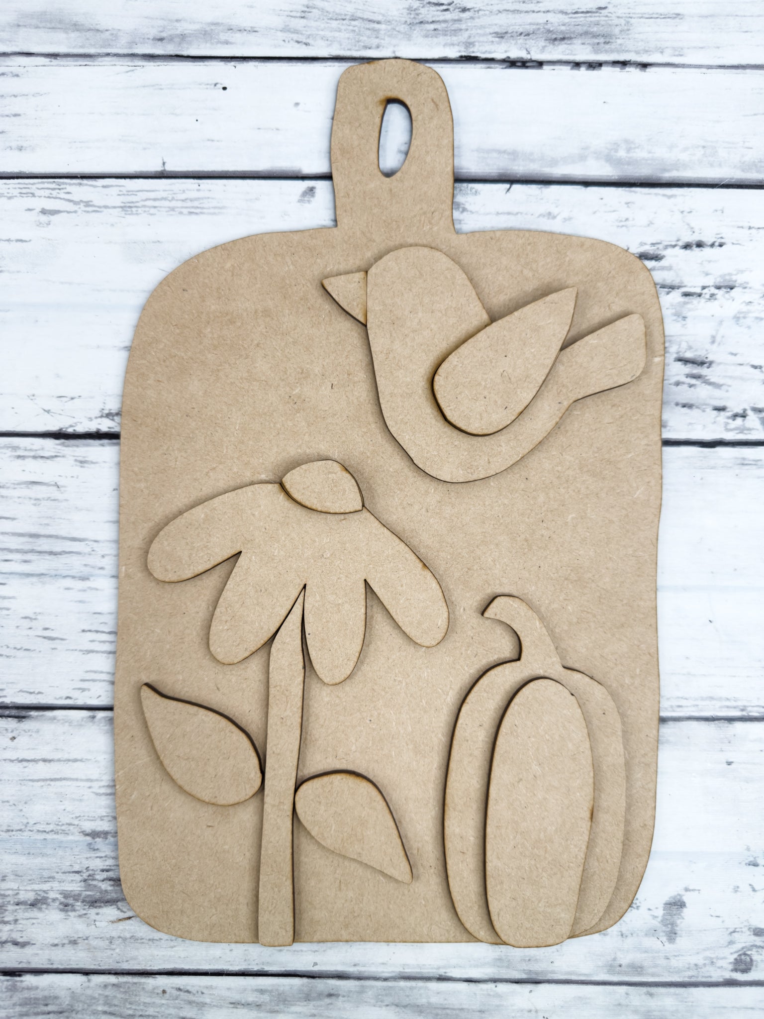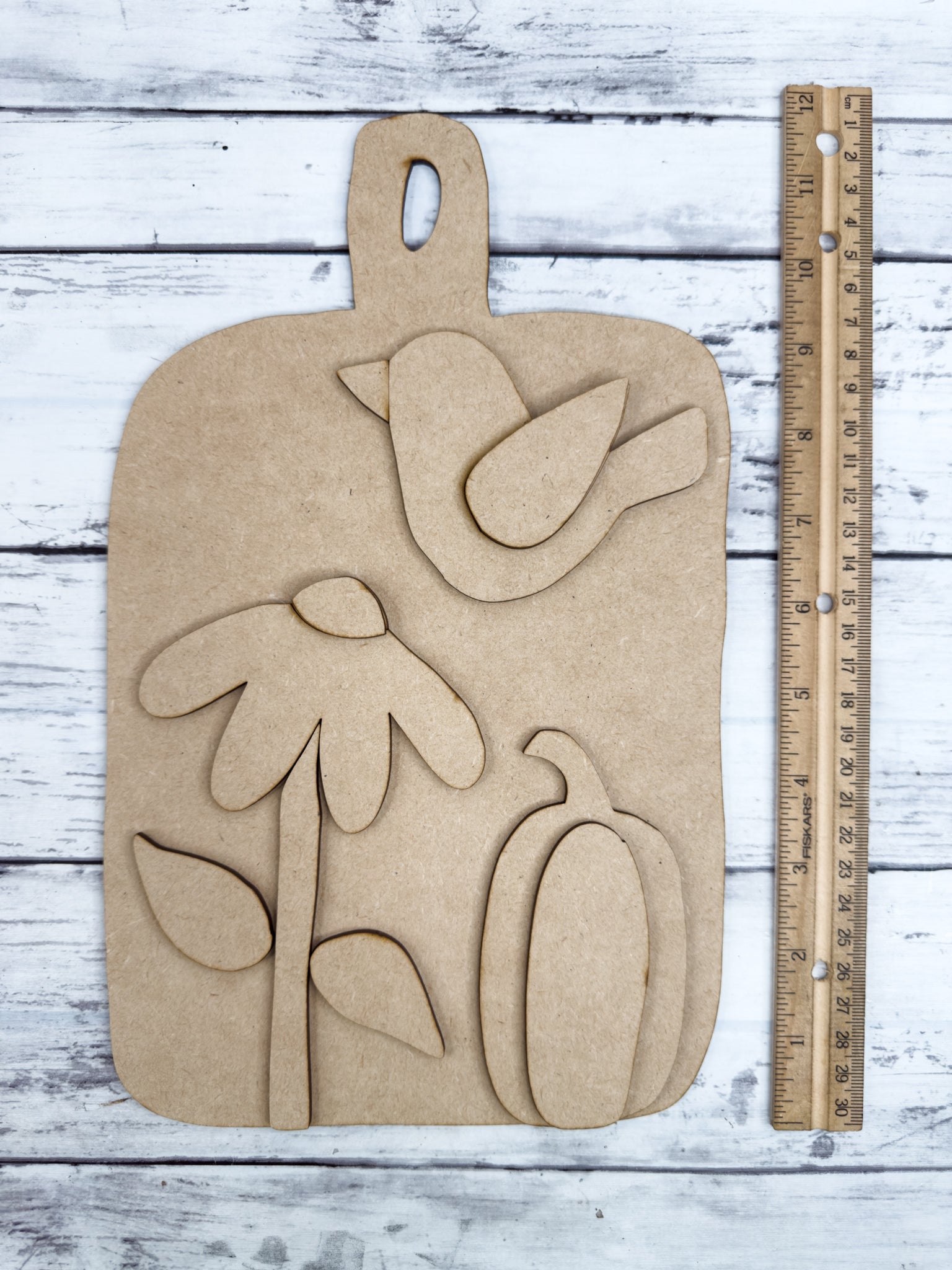 This kit features a cutting board shape, sunflower flower, bird (crow) and pumpkin. Great for crafters of all ages!