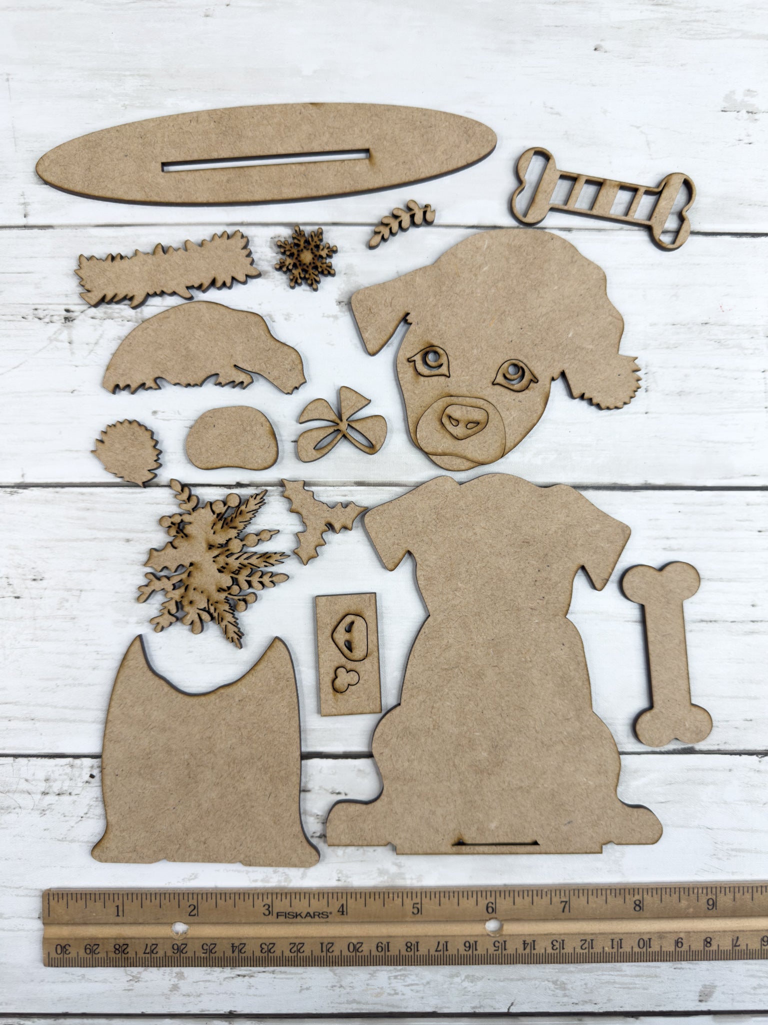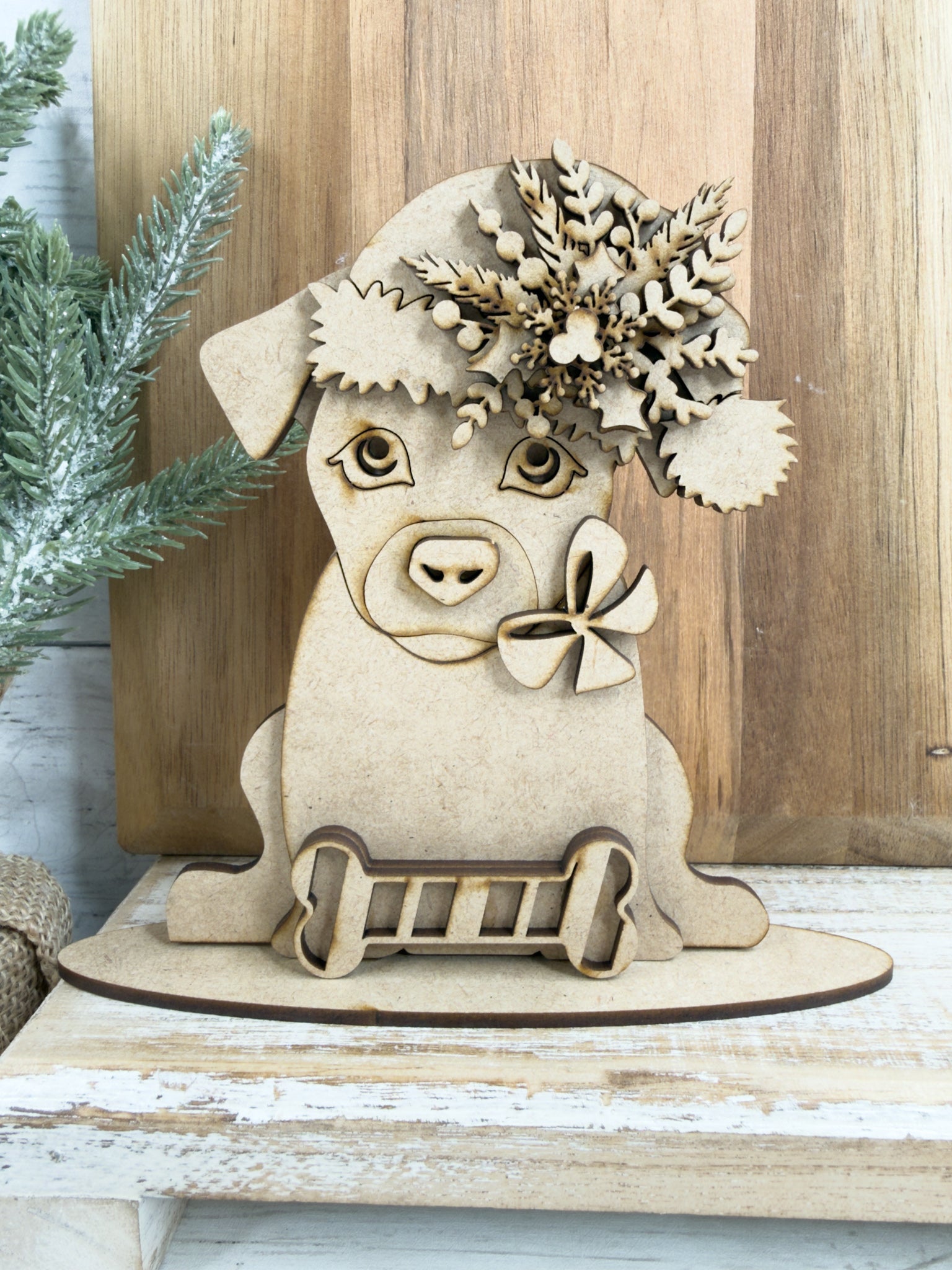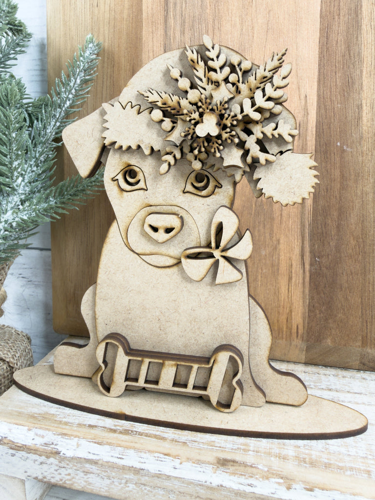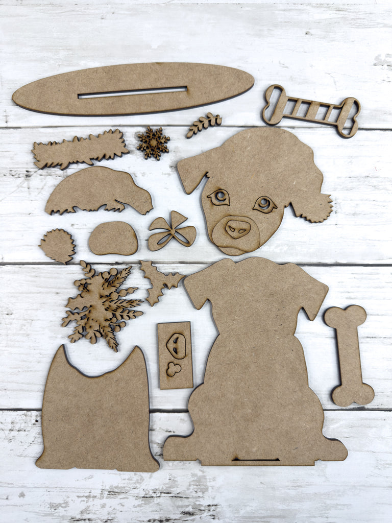 This adorable layered wood sitter features a festive pup wearing a Santa hat adorned with greenery and snowflakes, plus a sweet bone accent with a bow. Perfect for dog lovers and Christmas décor enthusiasts alike, this DIY kit is ready to paint, stain, or embellish to match your holiday style. Display it on a mantel, shelf, or tiered tray for the ultimate handmade touch!