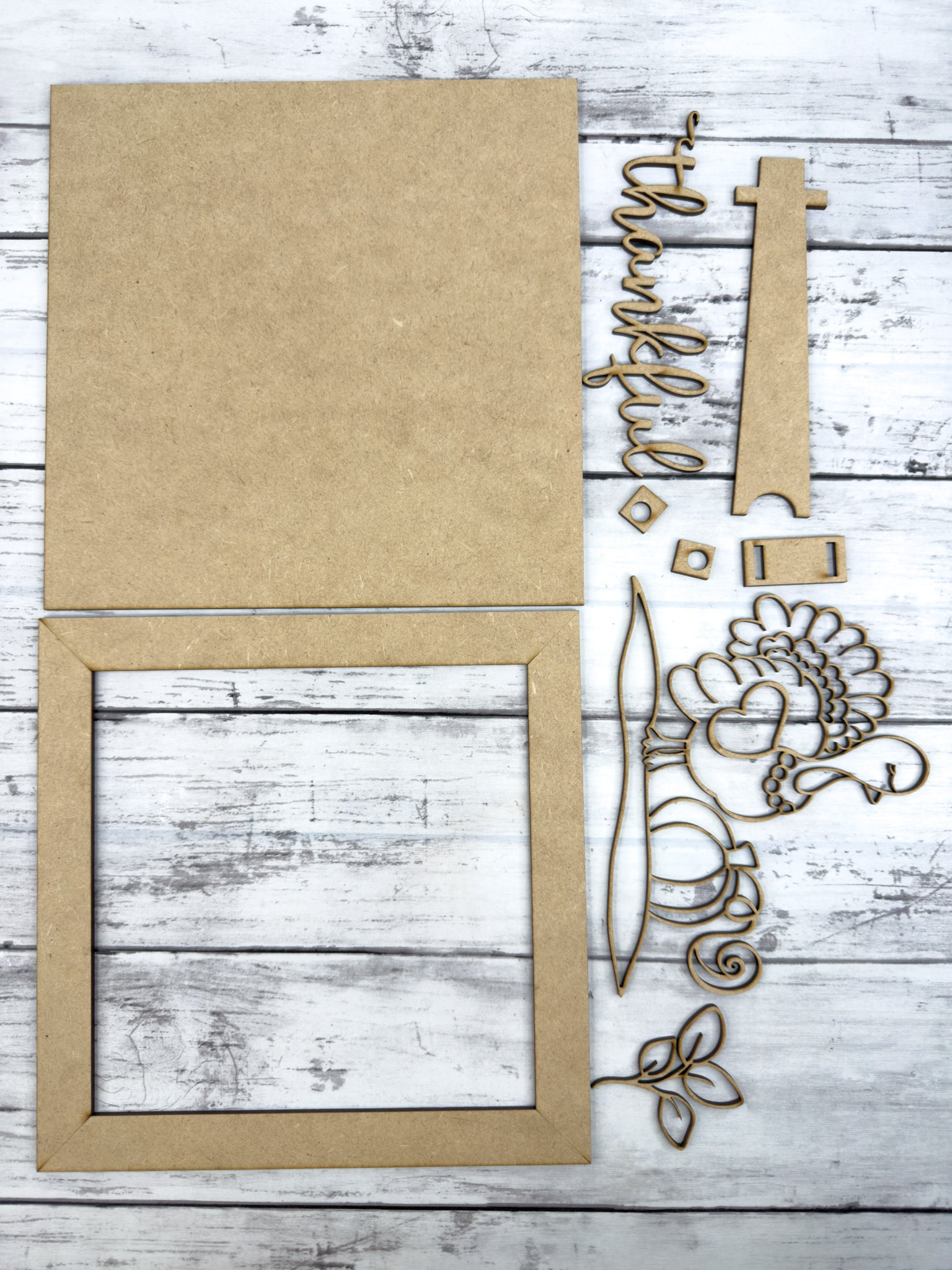 Unfinished wood pieces for framed turkey thankful sign with stand