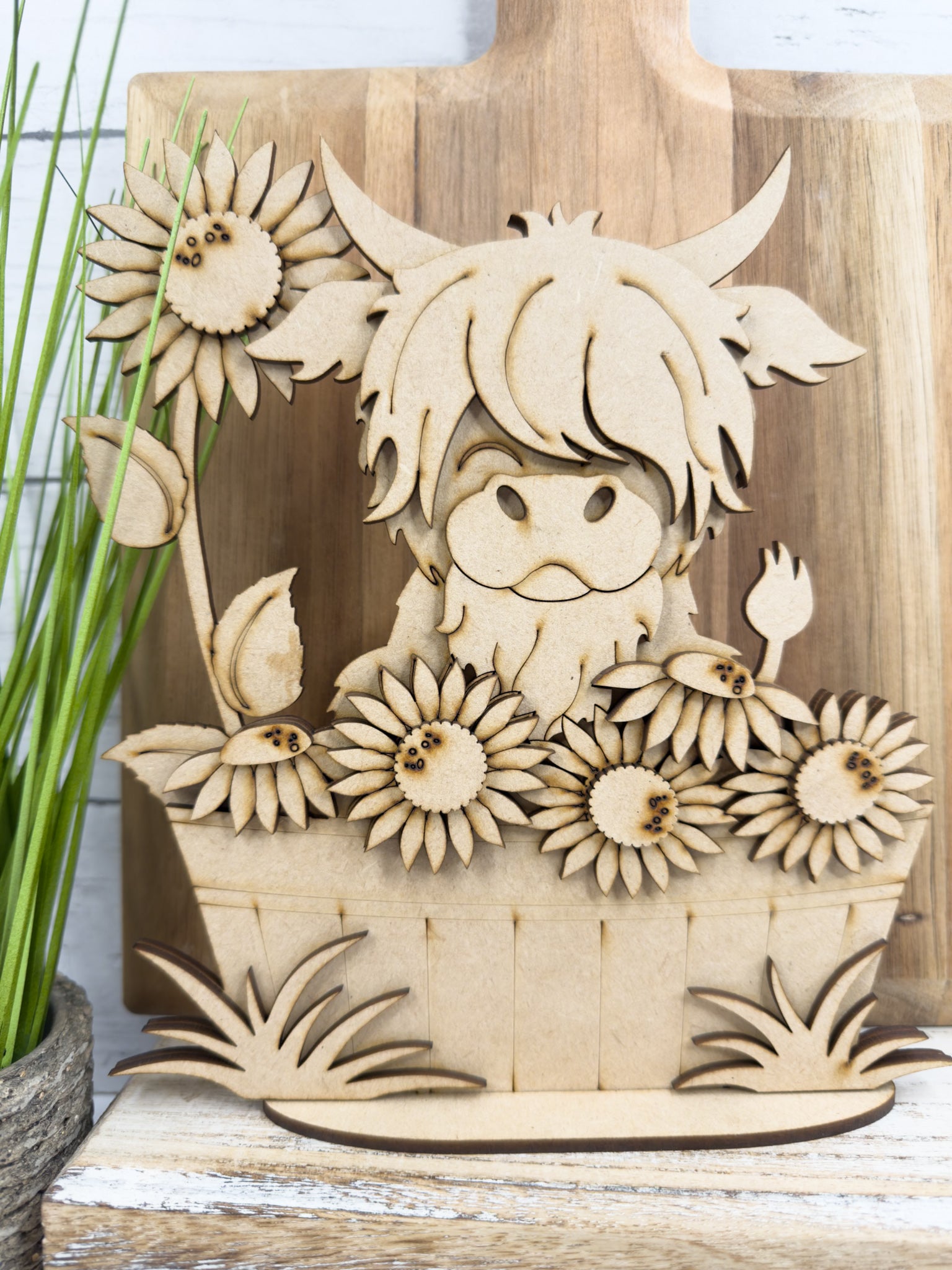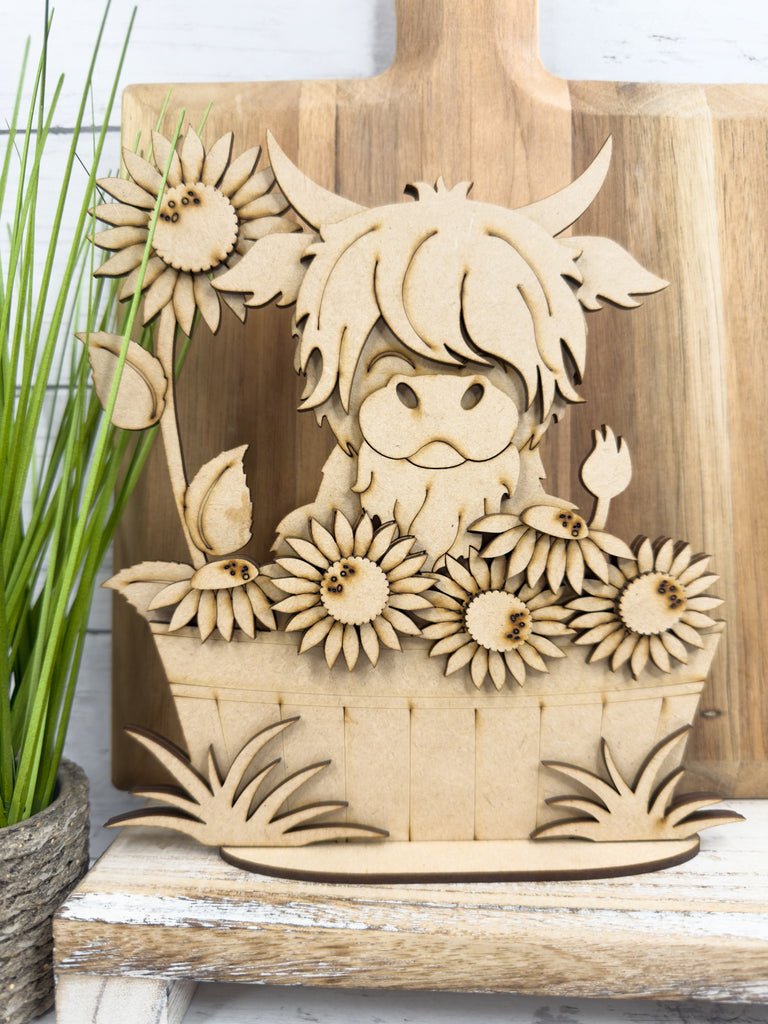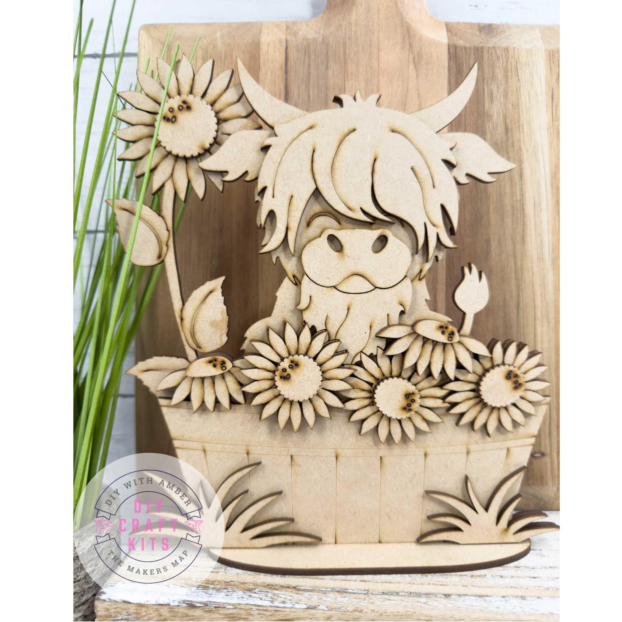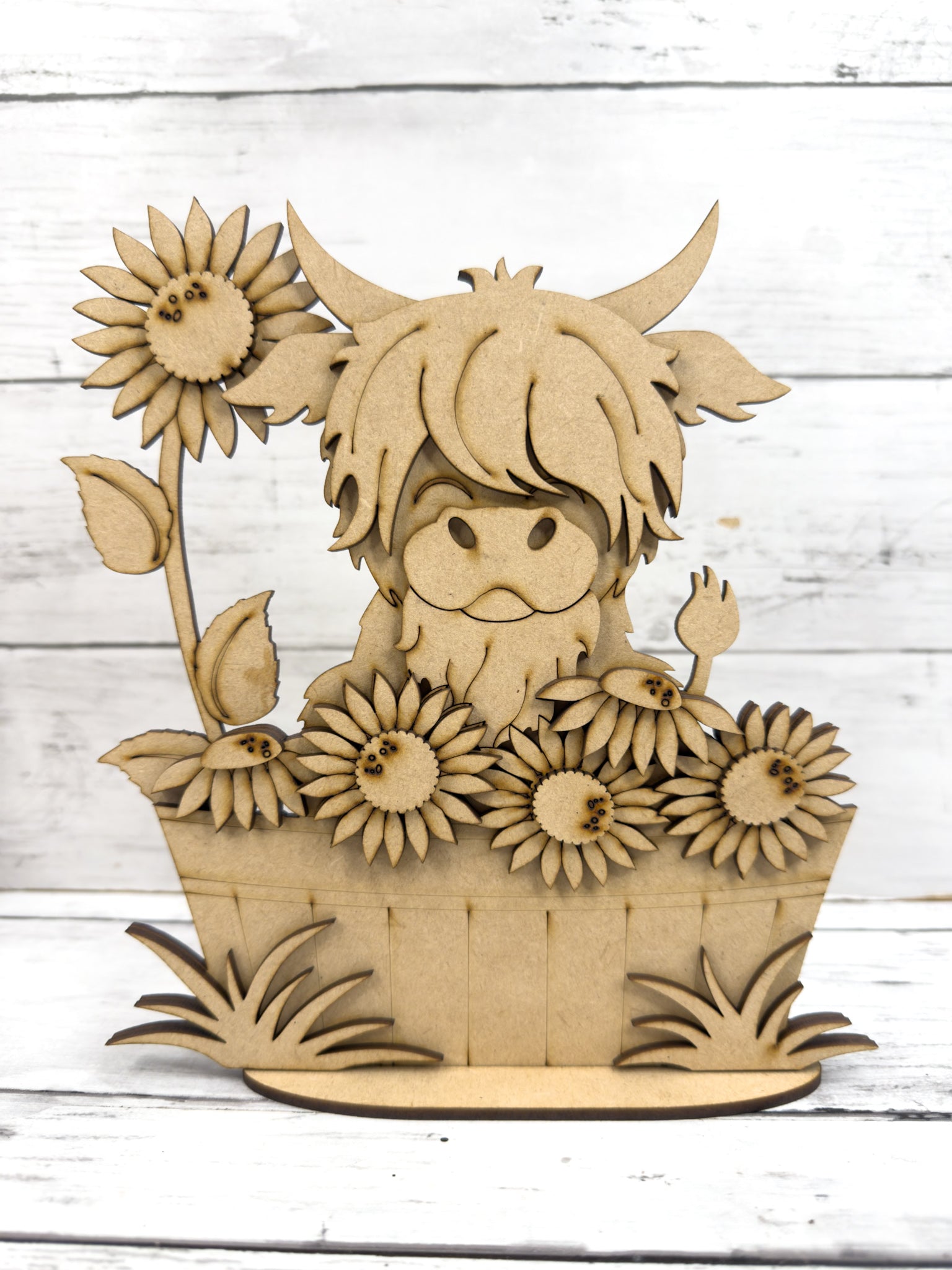 Decorate your shelves, countertops, or table for the autumn season with this Highland Cow with sunflowers in a bucket DIY Craft Kit!