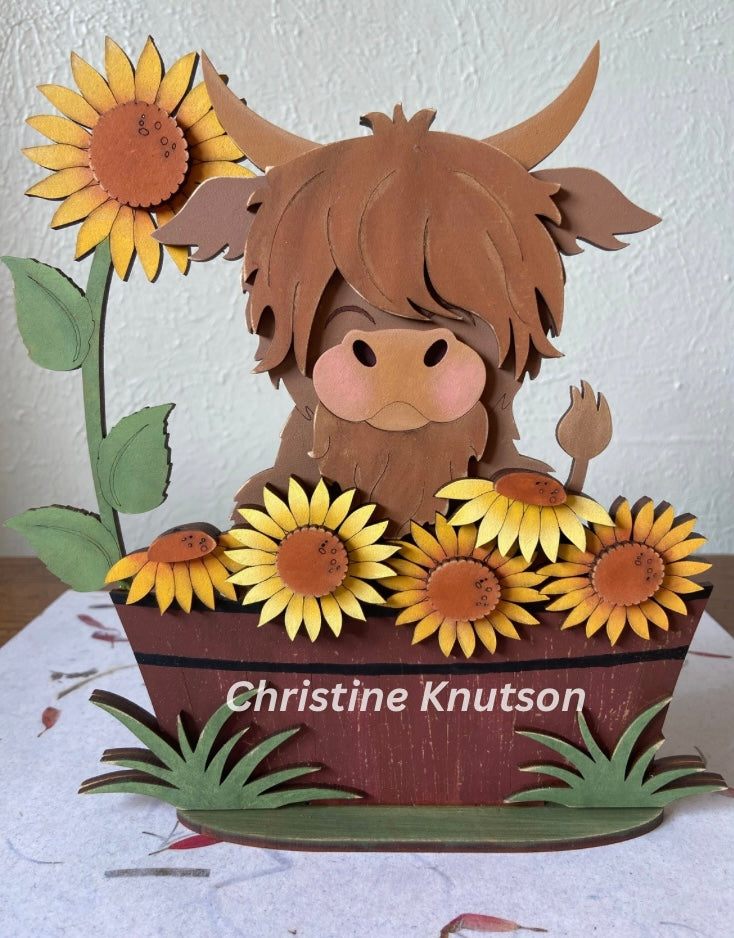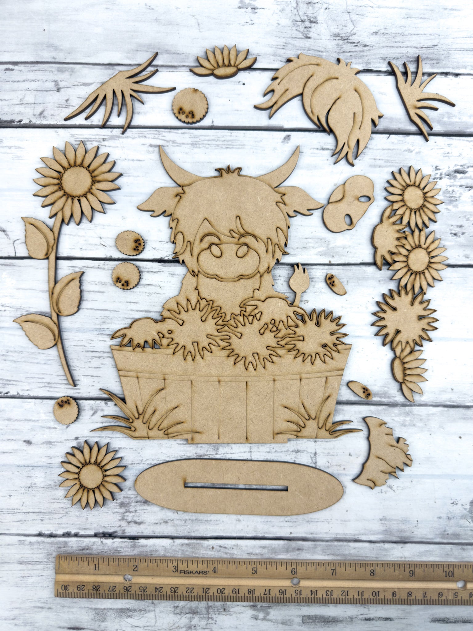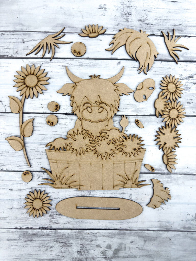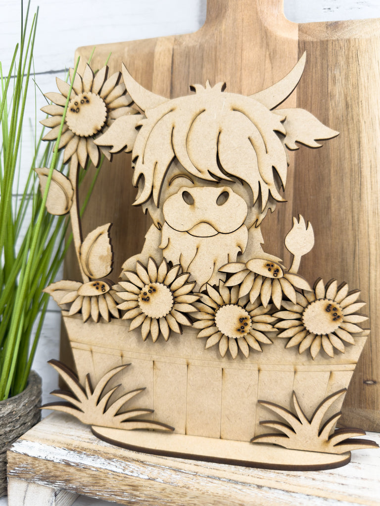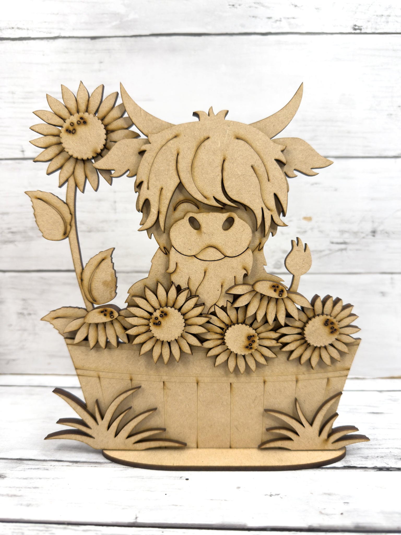 Decorate your shelves, countertops, or table for the autumn season with this Highland Cow with sunflowers in a bucket DIY Craft Kit!