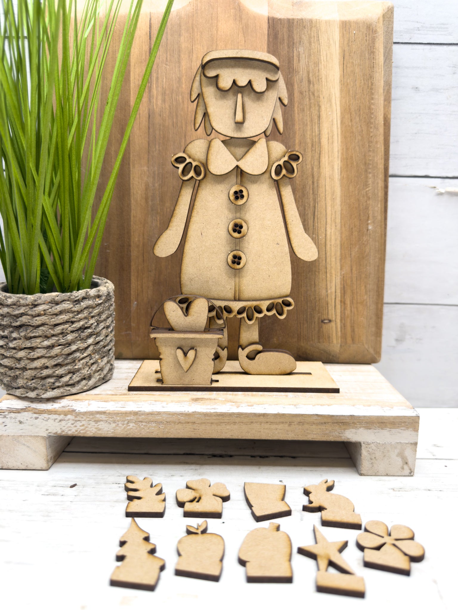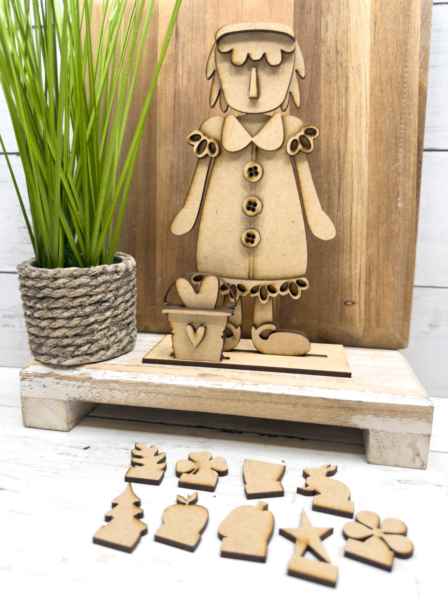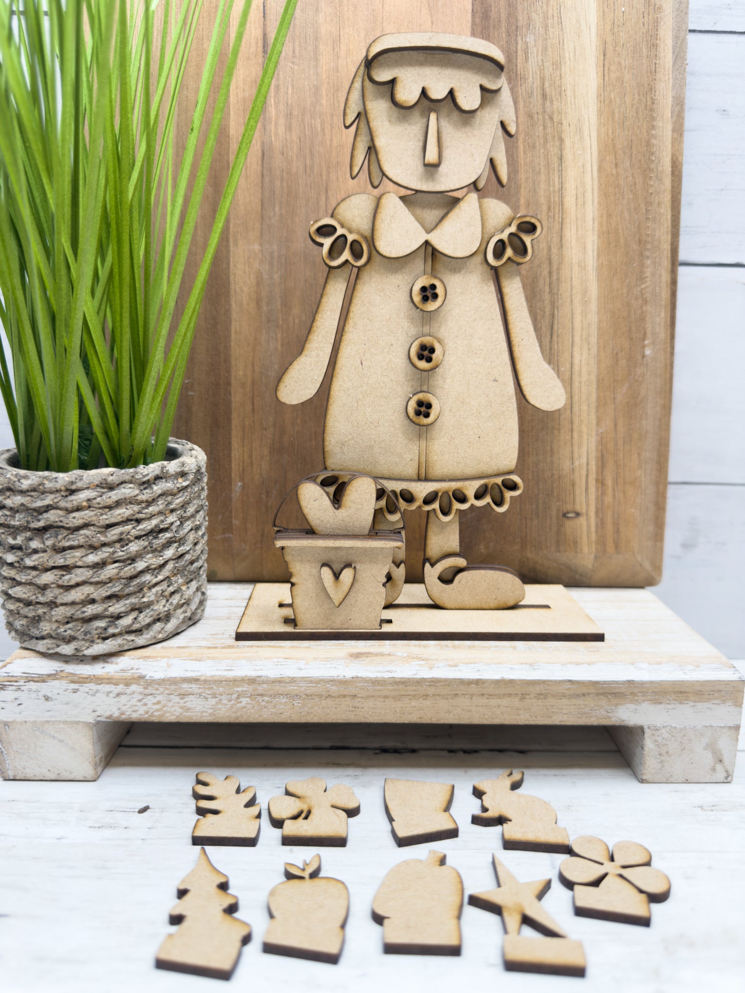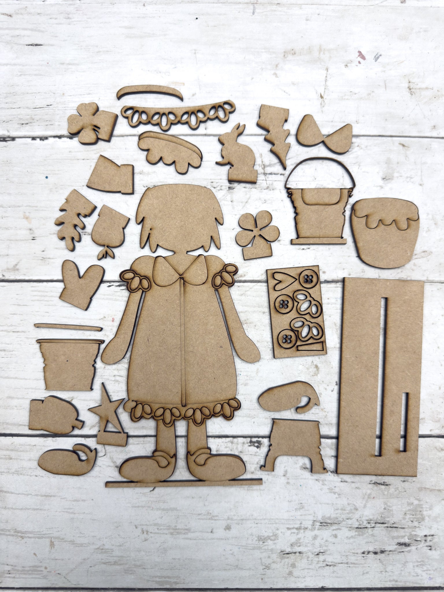 This Interchangeable prim girl Sitter DIY Kit is a fun, interactive craft project! Featuring a sweet gi and a set of interchangeable seasonal inserts for the bucket, this design lets crafters customize and change the look all year long. Perfect for shelves, tiered trays, and paint parties.