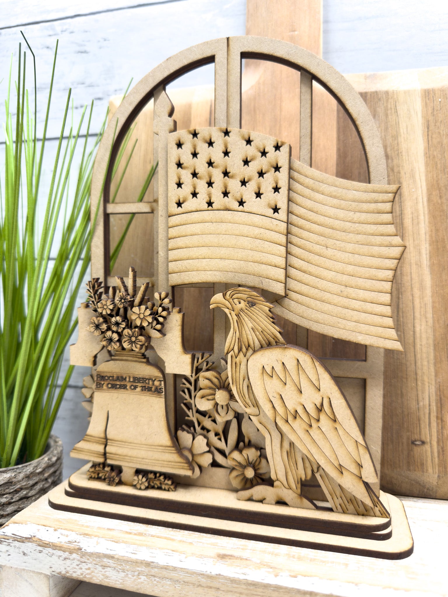 Honor timeless American pride with the Liberty Bell Eagle Patriotic Trio Insert, part of our Interchangeable Arched Window Collection. This layered DIY insert is designed to sit in front of our arched window base, allowing you to easily swap seasonal décor while keeping the same beautiful backdrop in place year after year.