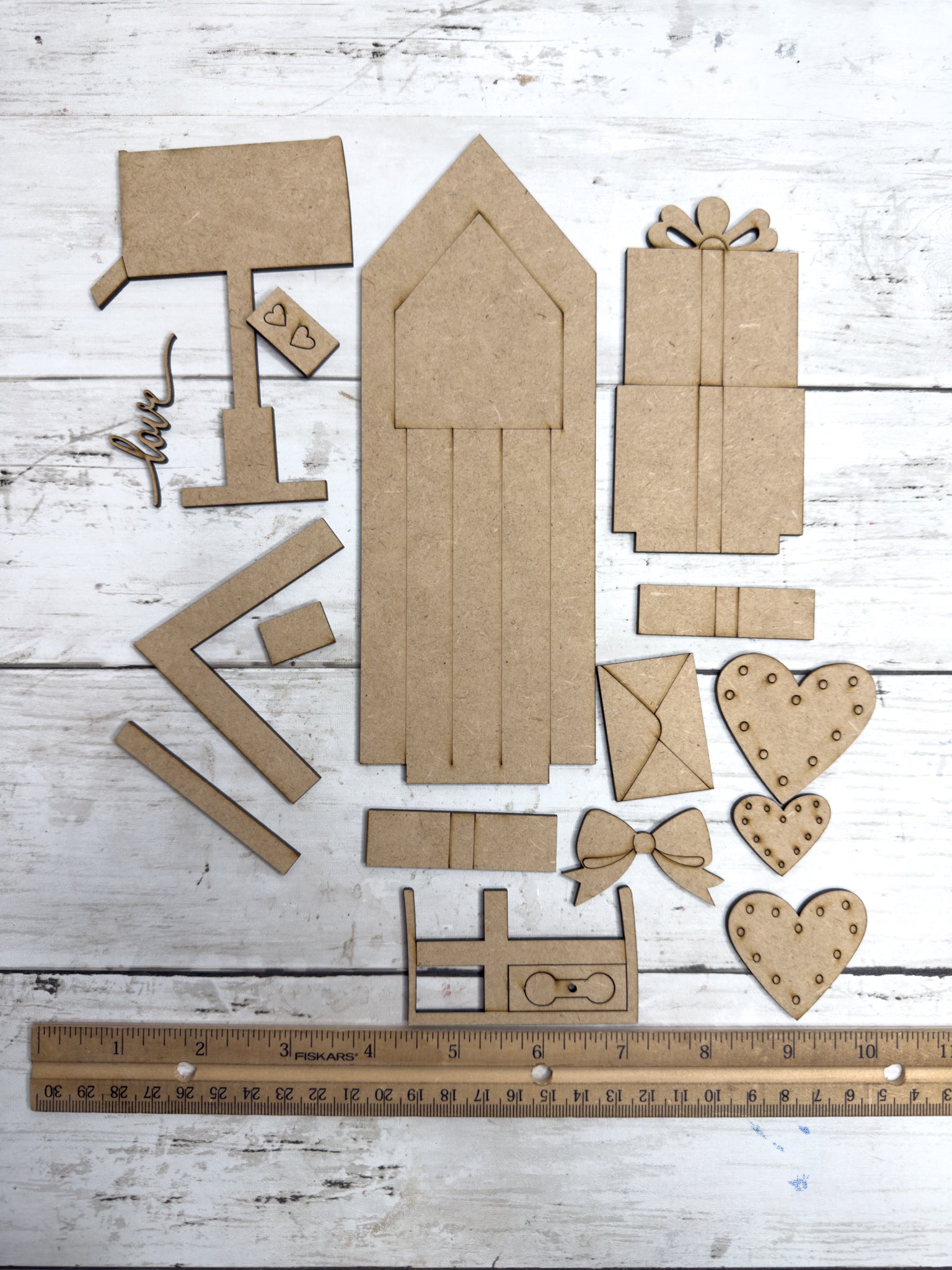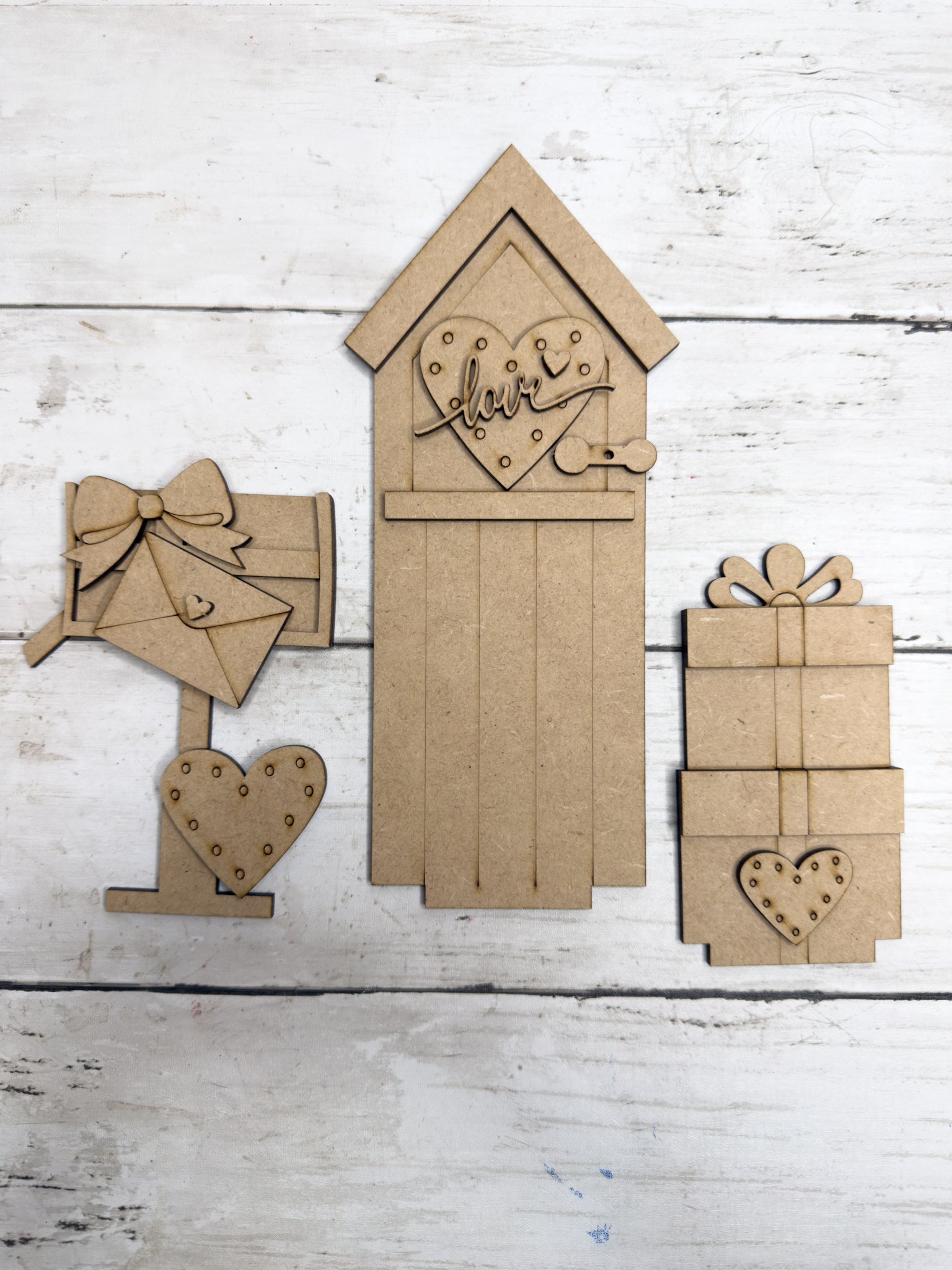 This sweet Valentine design features a charming pink house with heart accents, a love letter envelope, and coordinating gift box elements in soft pinks, reds, and whites—perfect for adding a cozy, heartfelt touch to your Valentine décor.