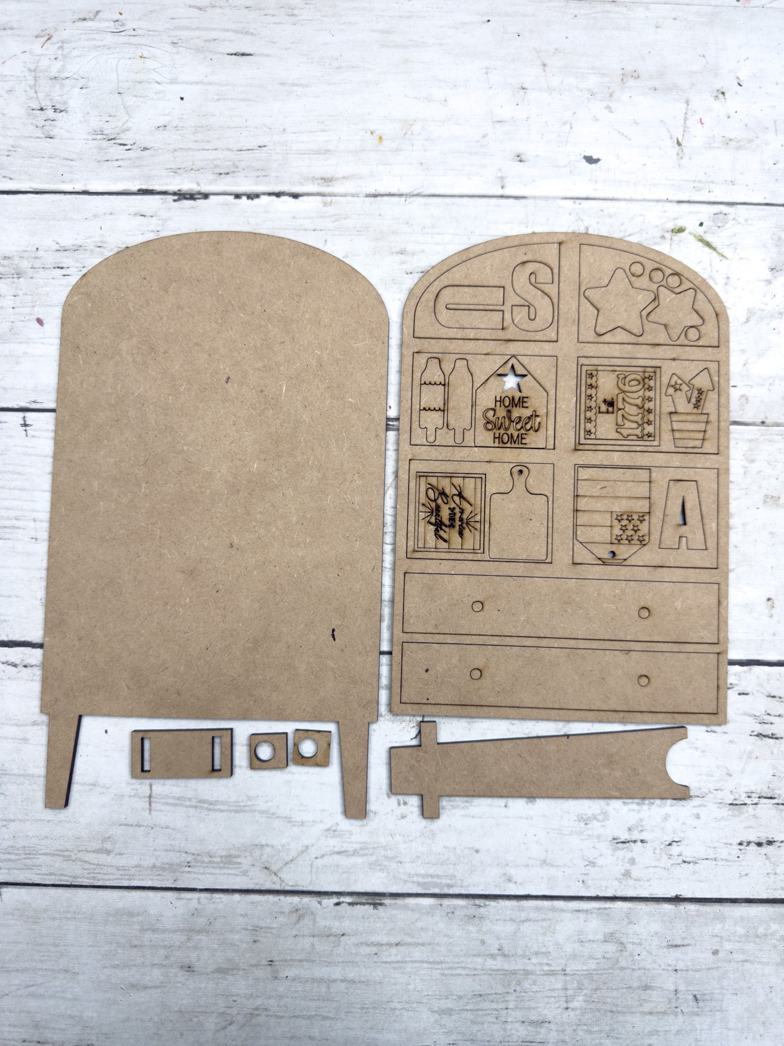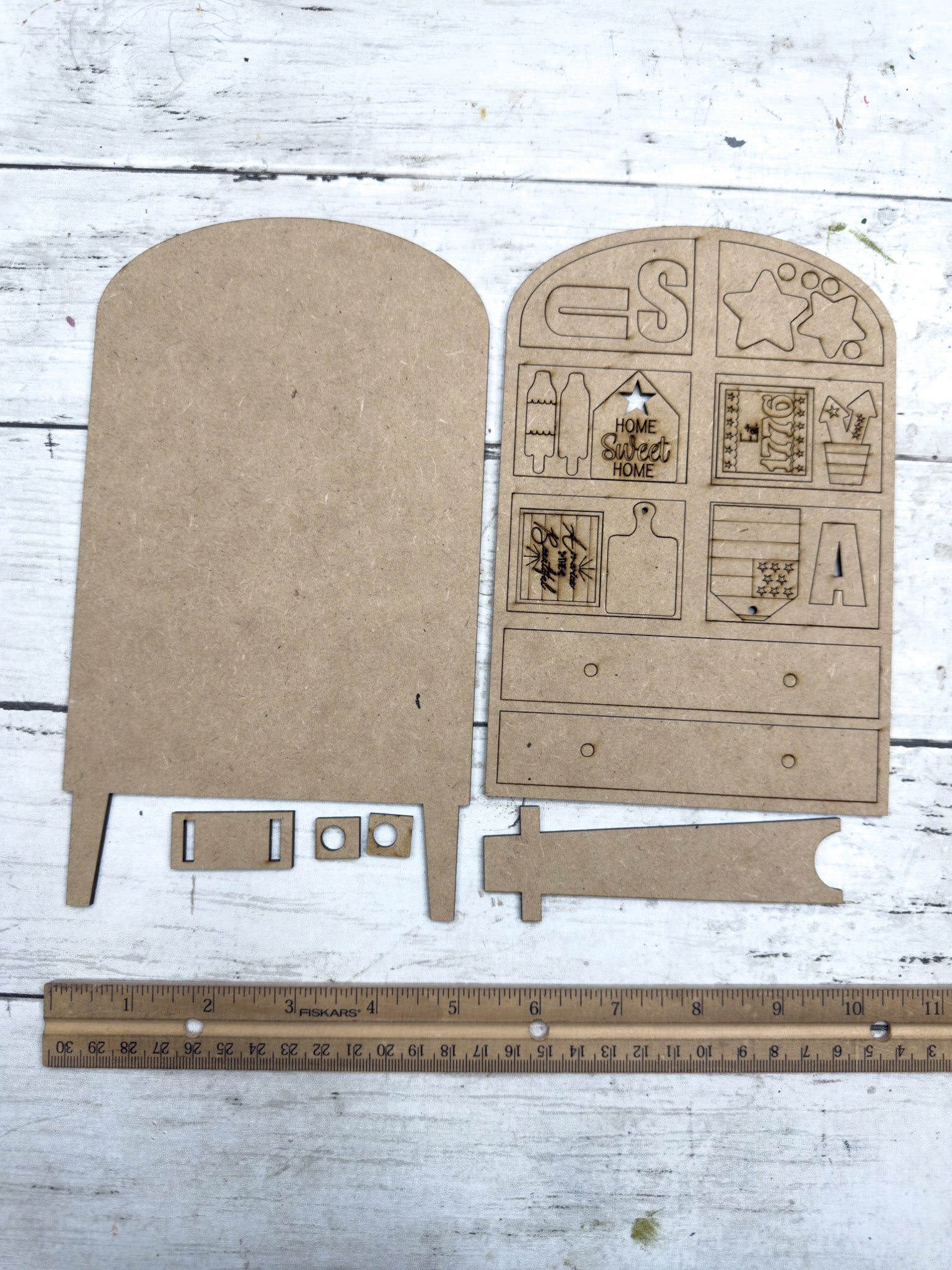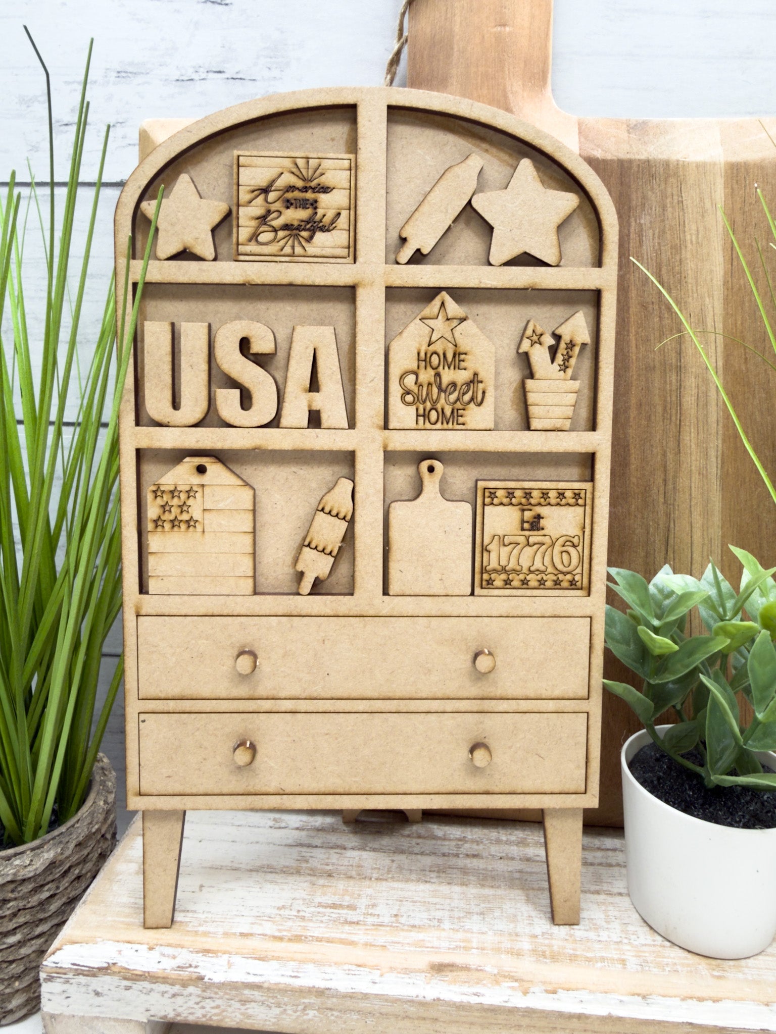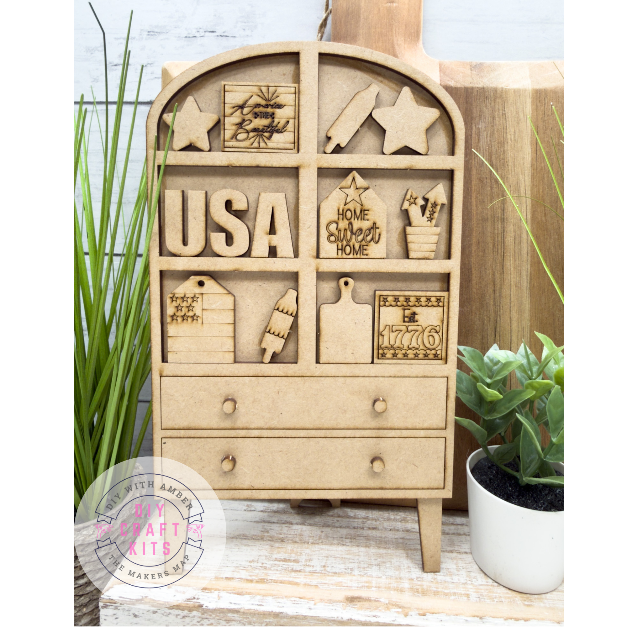 Add a charming, vintage-inspired touch to your patriotic decor with this mI’d century cabinet Hutch DIY Kit! Designed with a modern-style cabinet look, this piece features layered cubbies filled with festive Americana elements—perfect for celebrating the 4th of July all summer long.