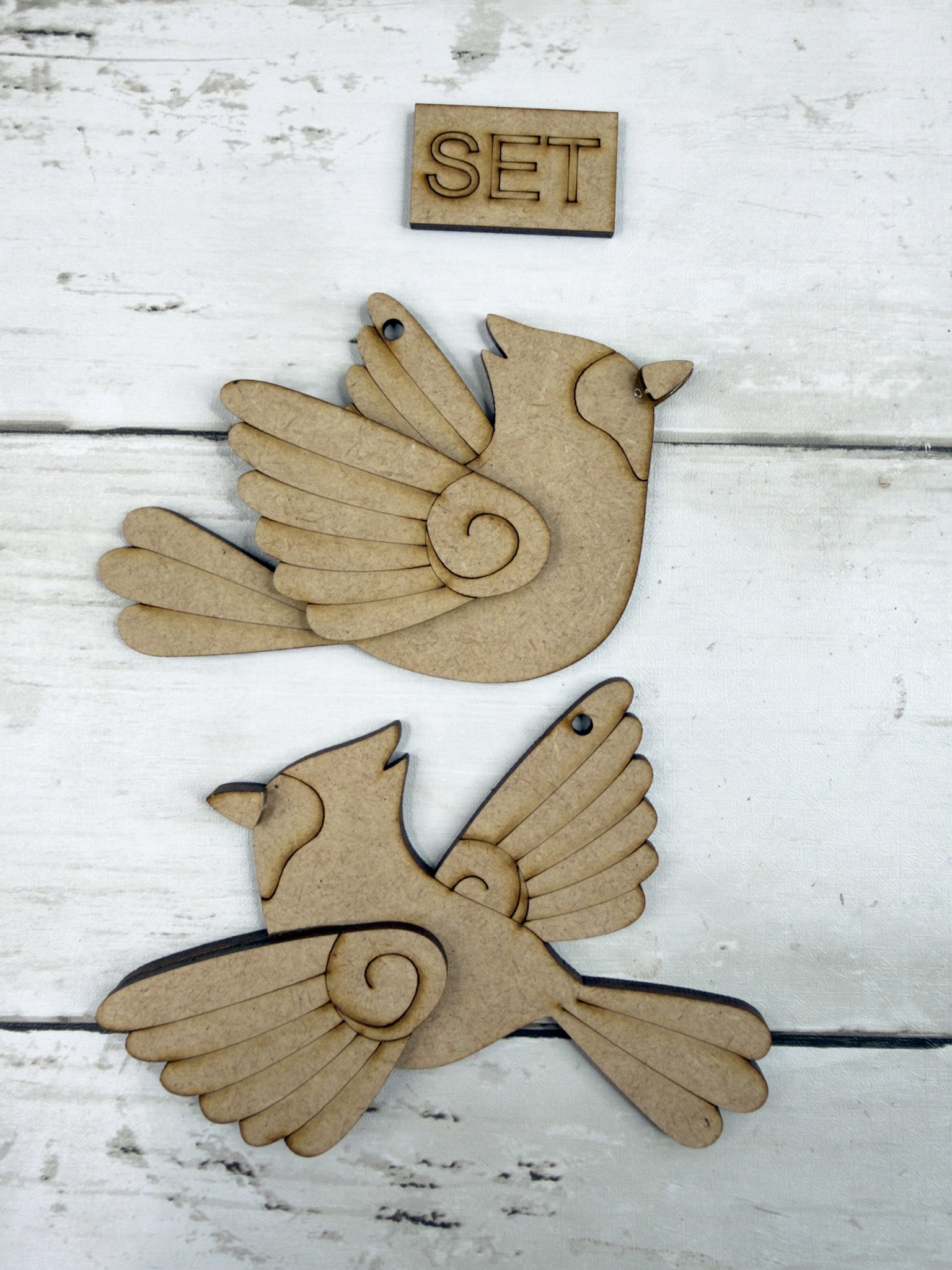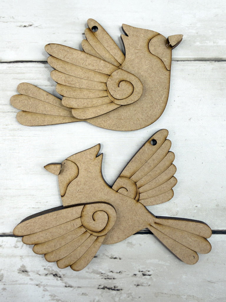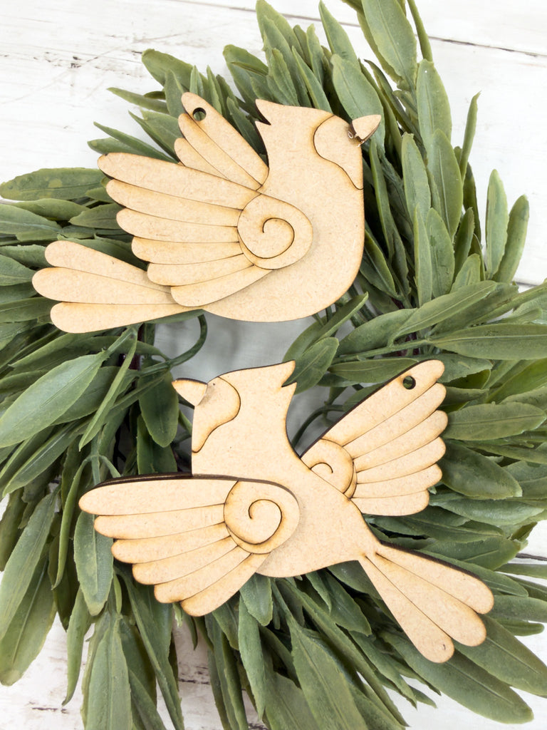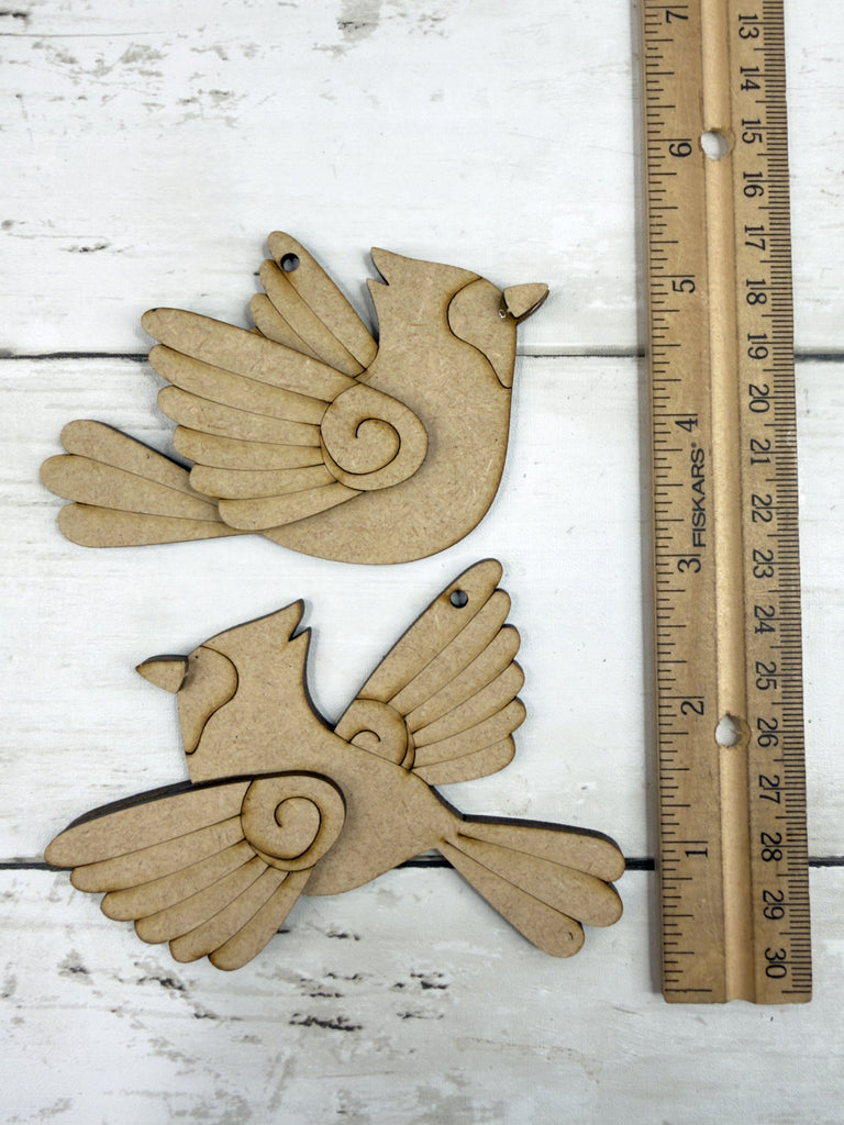 Create two beautiful layered cardinals perfect for winter and Christmas decorating. These unfinished wood ornaments feature detailed wings, swirled accents, and a charming primitive look. Hang them on your tree, add them to gift packages, or use them in your seasonal crafting.