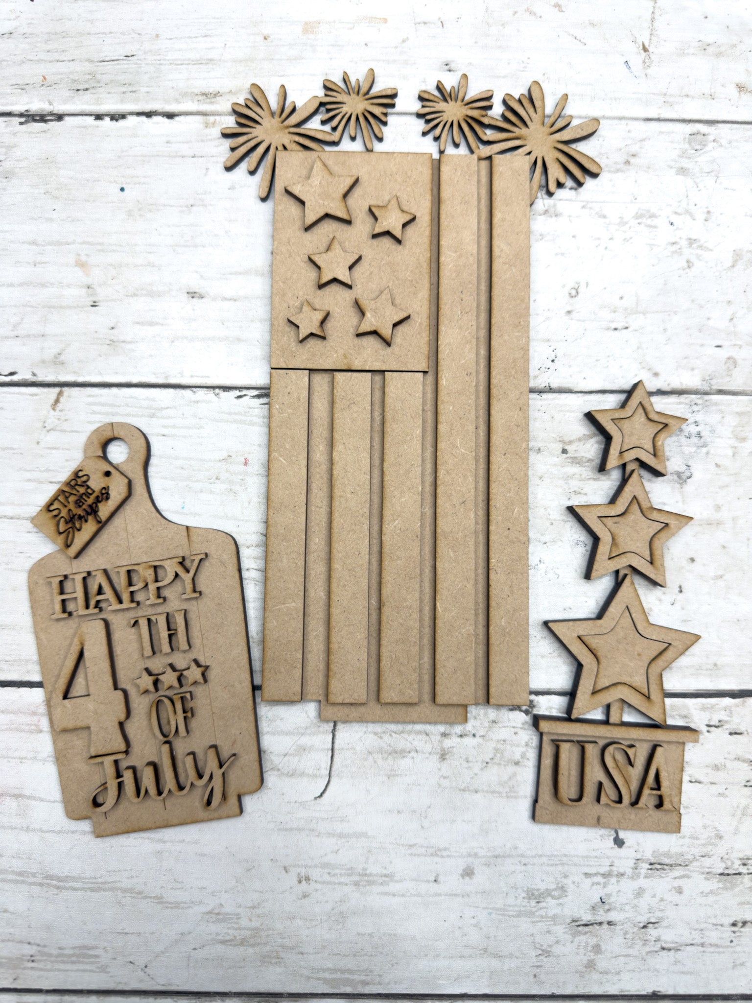 This patriotic design features a bold stars and stripes flag backdrop, layered star accents, festive firework details, and “Happy 4th of July” and “USA” elements—perfect for Independence Day and summer décor.