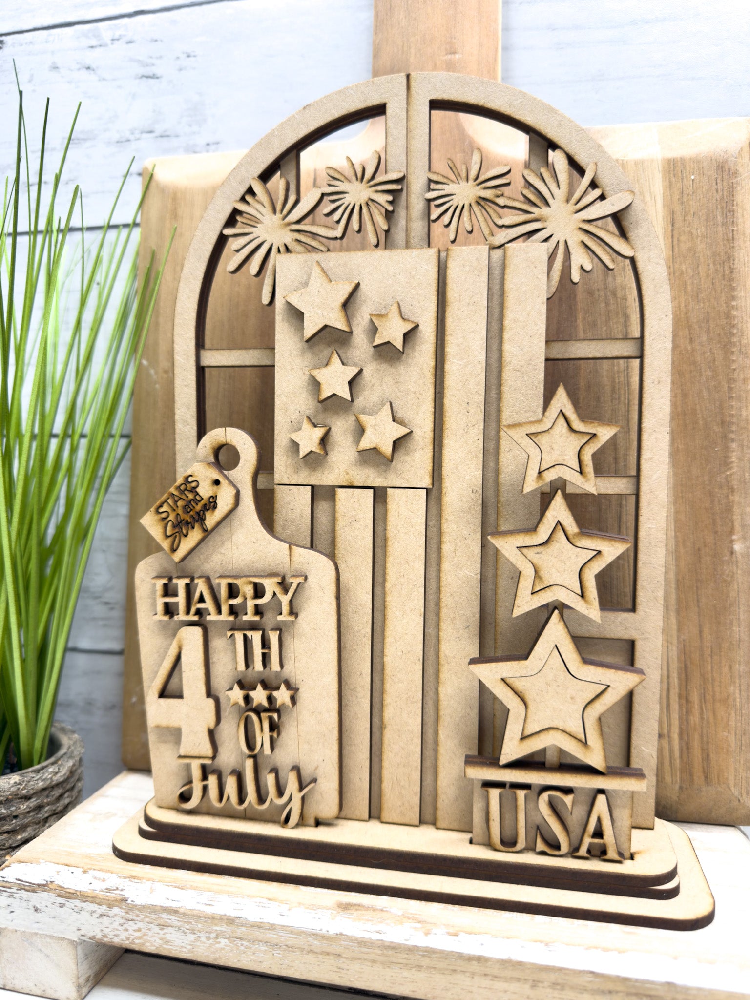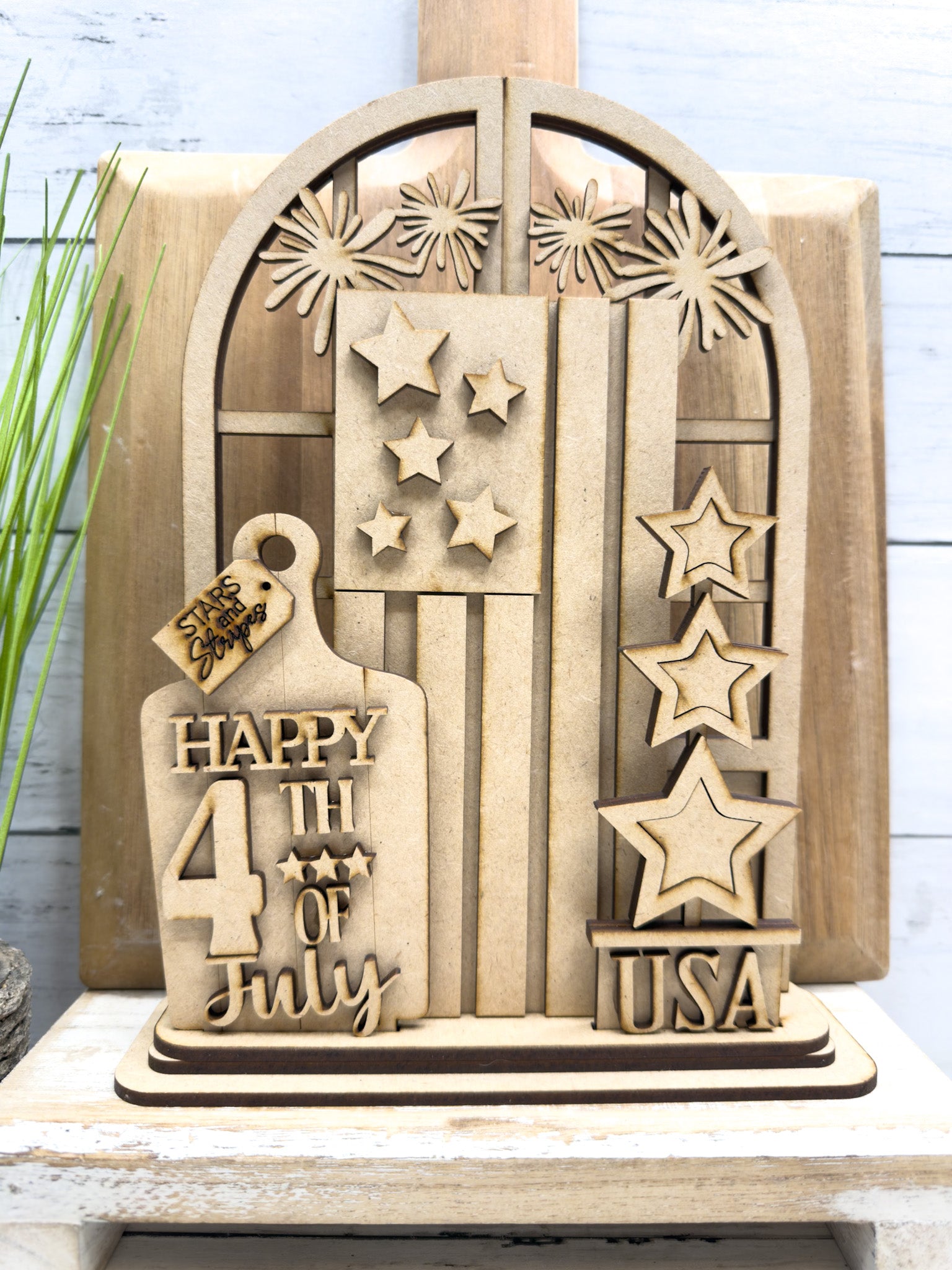Celebrate red, white, and blue in style with the Patriotic Stars and Stripes Trio Insert, part of our Interchangeable Arched Window Collection. This layered DIY insert is designed to sit in front of our arched window base, making it easy to swap seasonal décor while keeping the same classic background all year long.