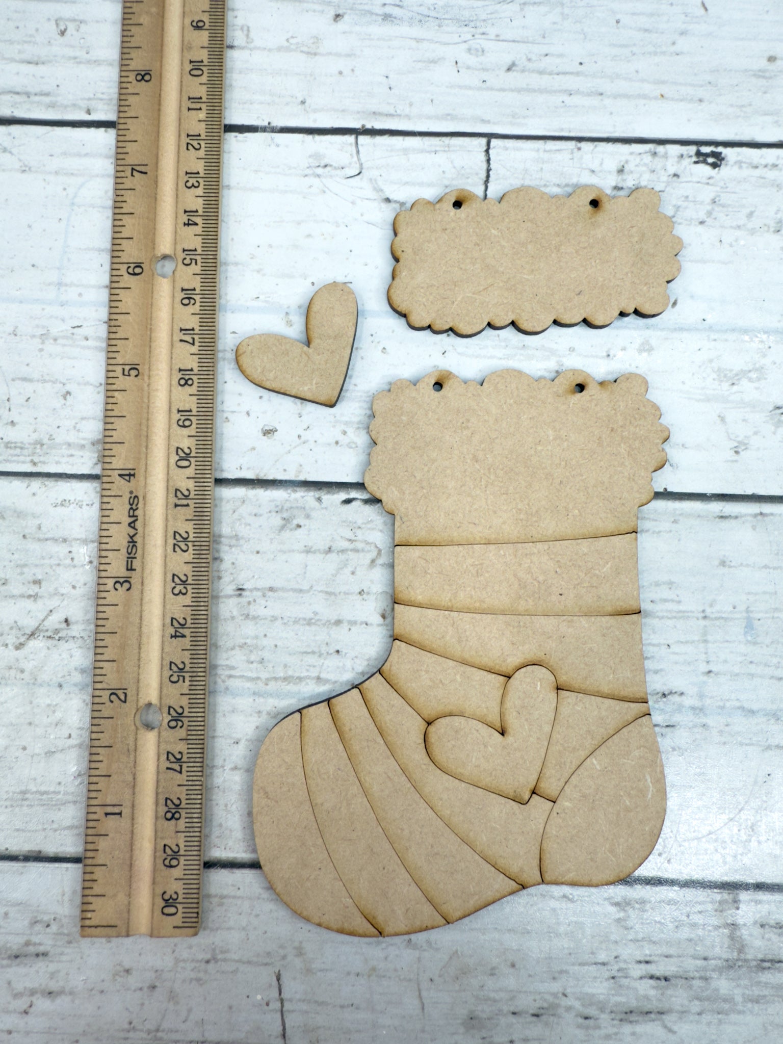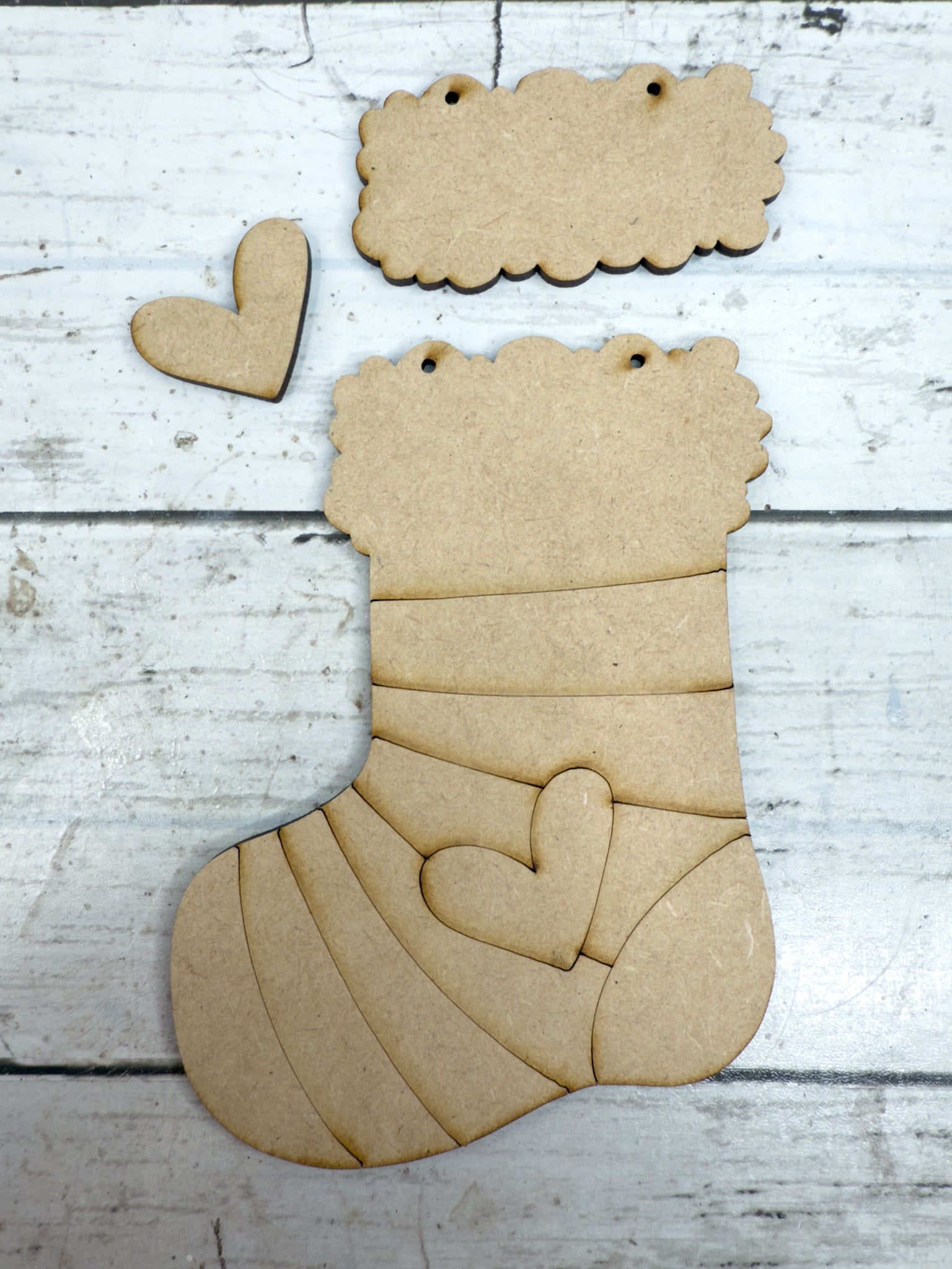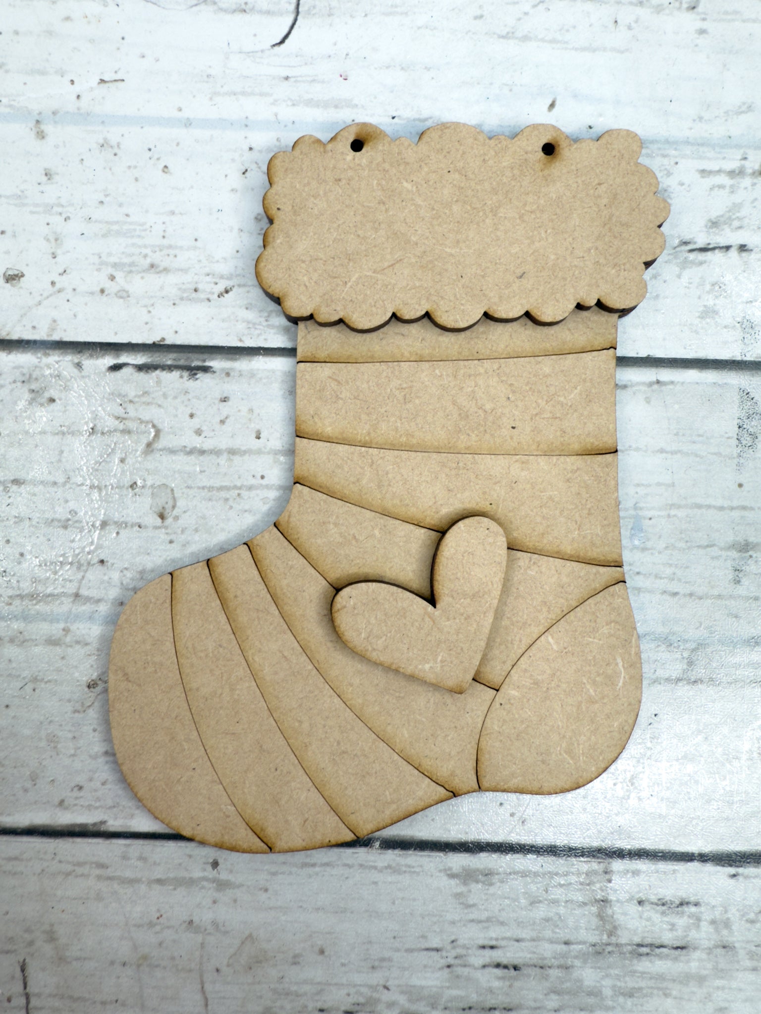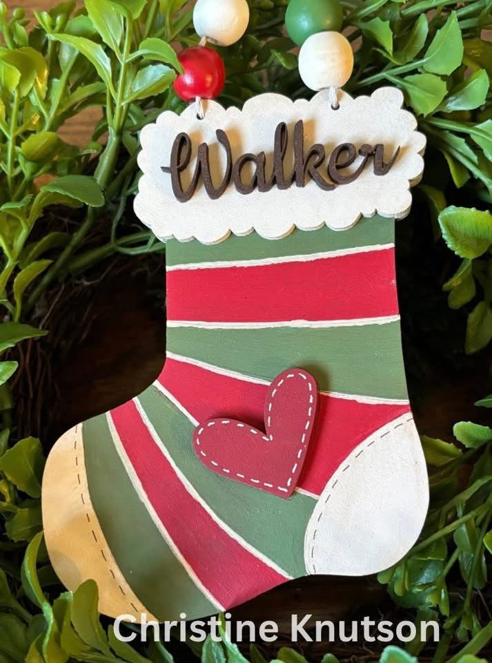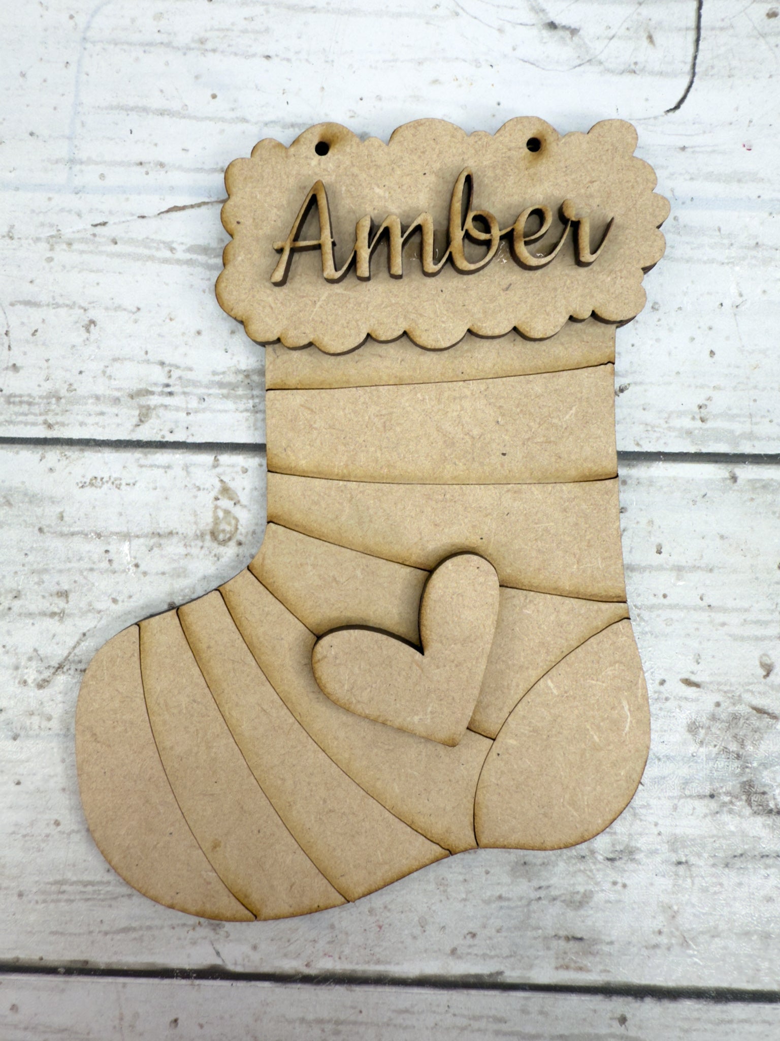 Add a personal touch to your tree or gift tags with this DIY Personalized Stocking Ornament! Laser cut from smooth 1/8” HDF, this layered ornament features a cozy stocking shape, heart accent, and space for a custom first name at the top. Two holes are pre-cut for easy hanging with ribbon or twine.