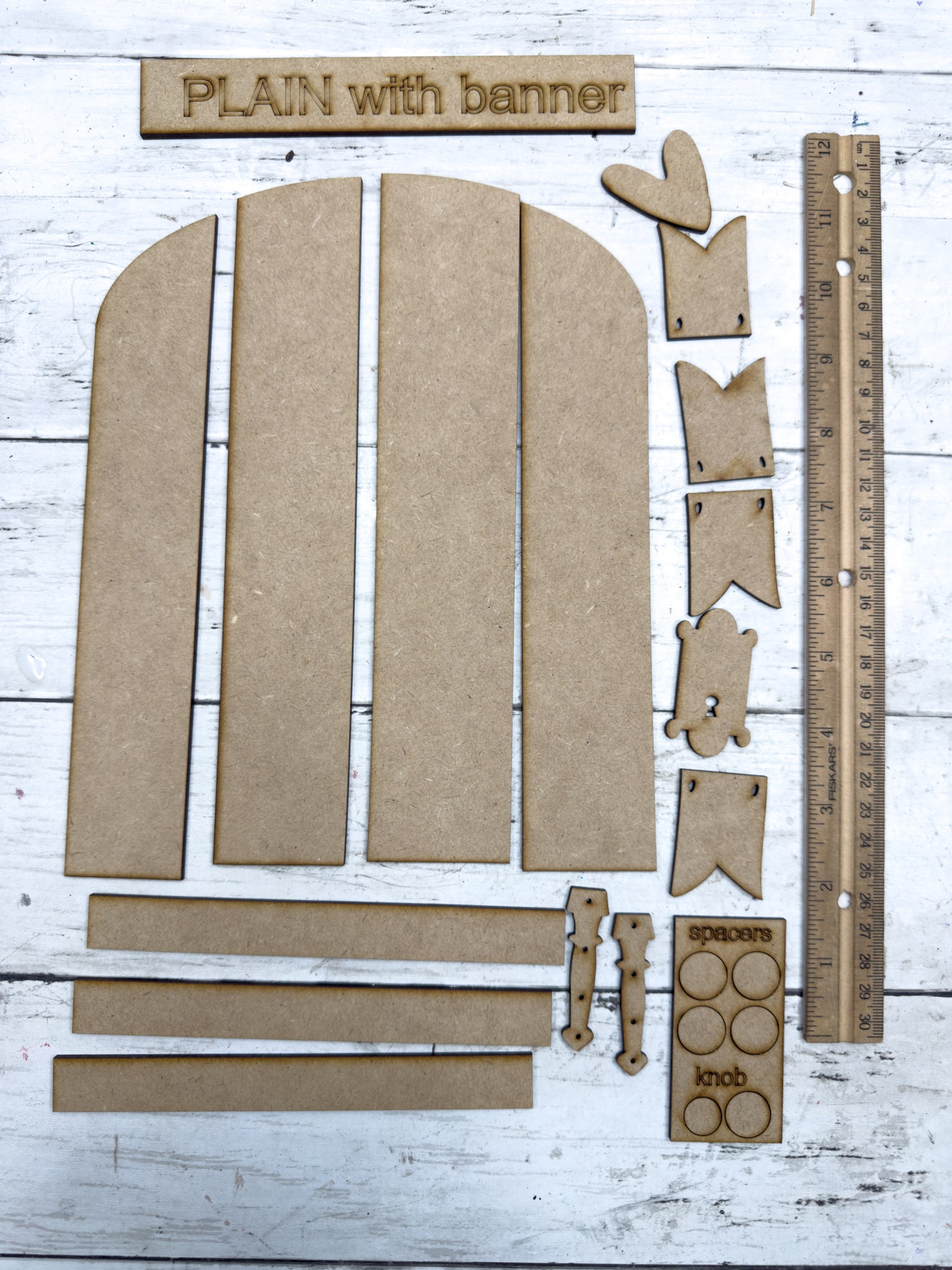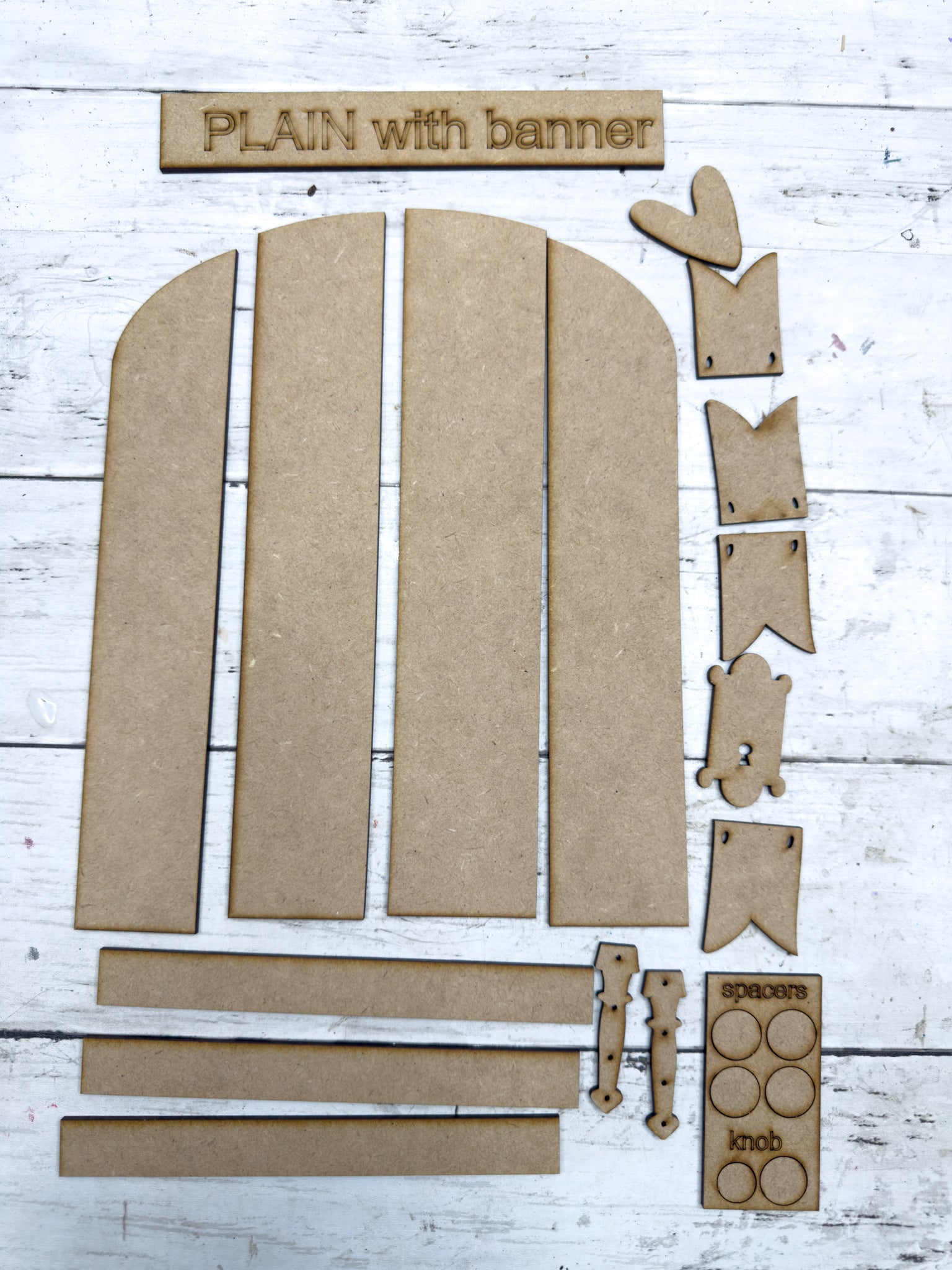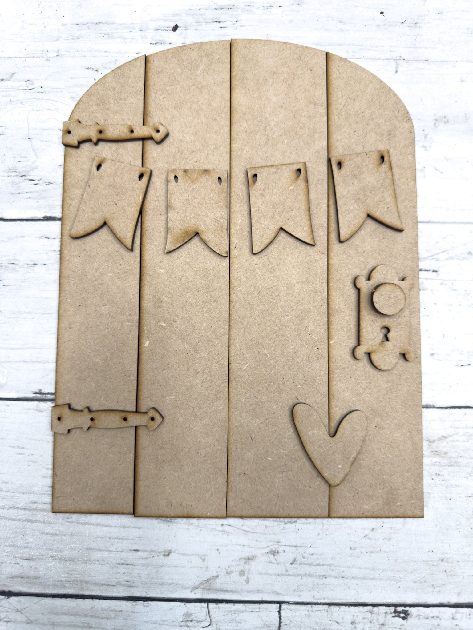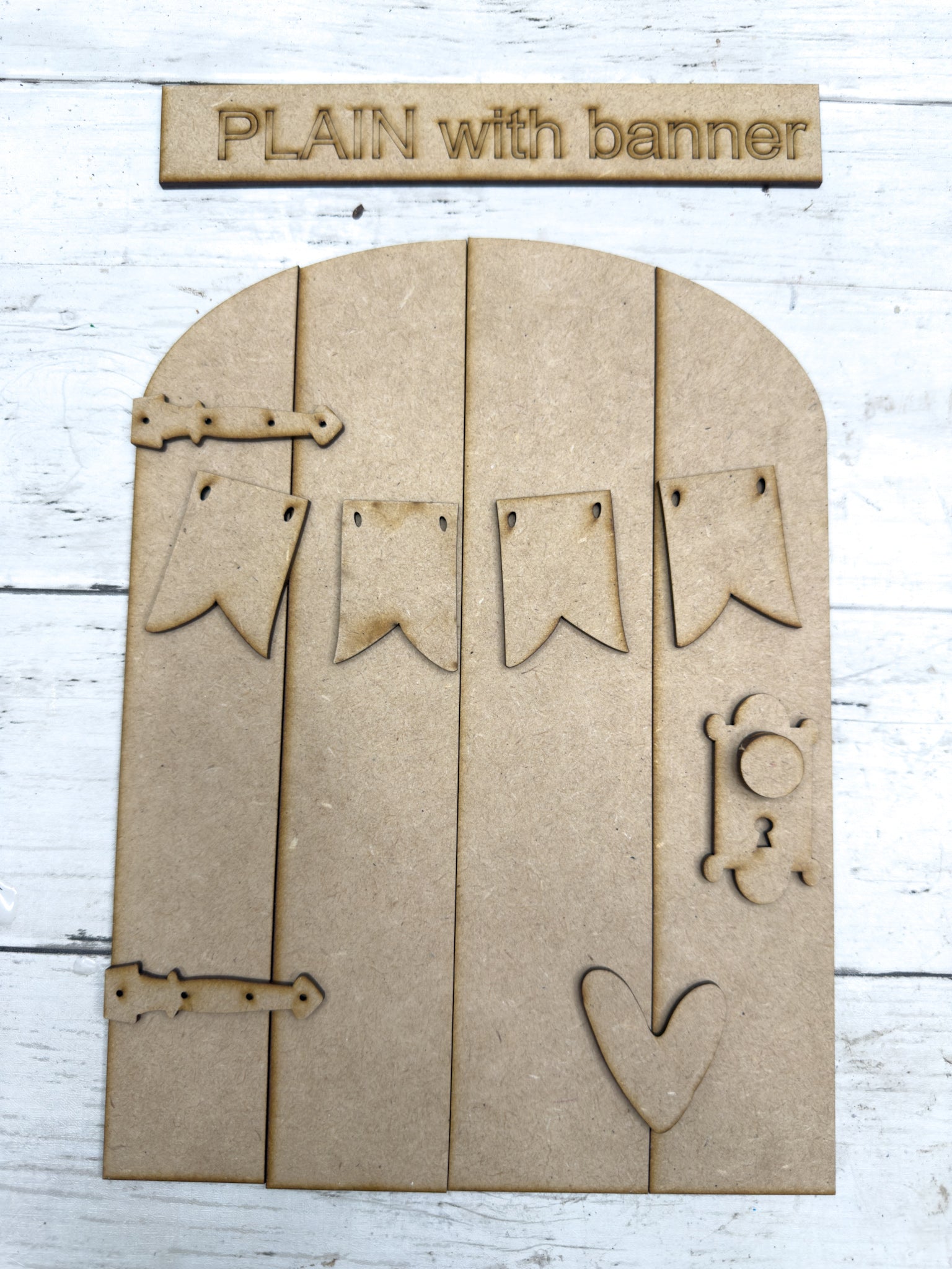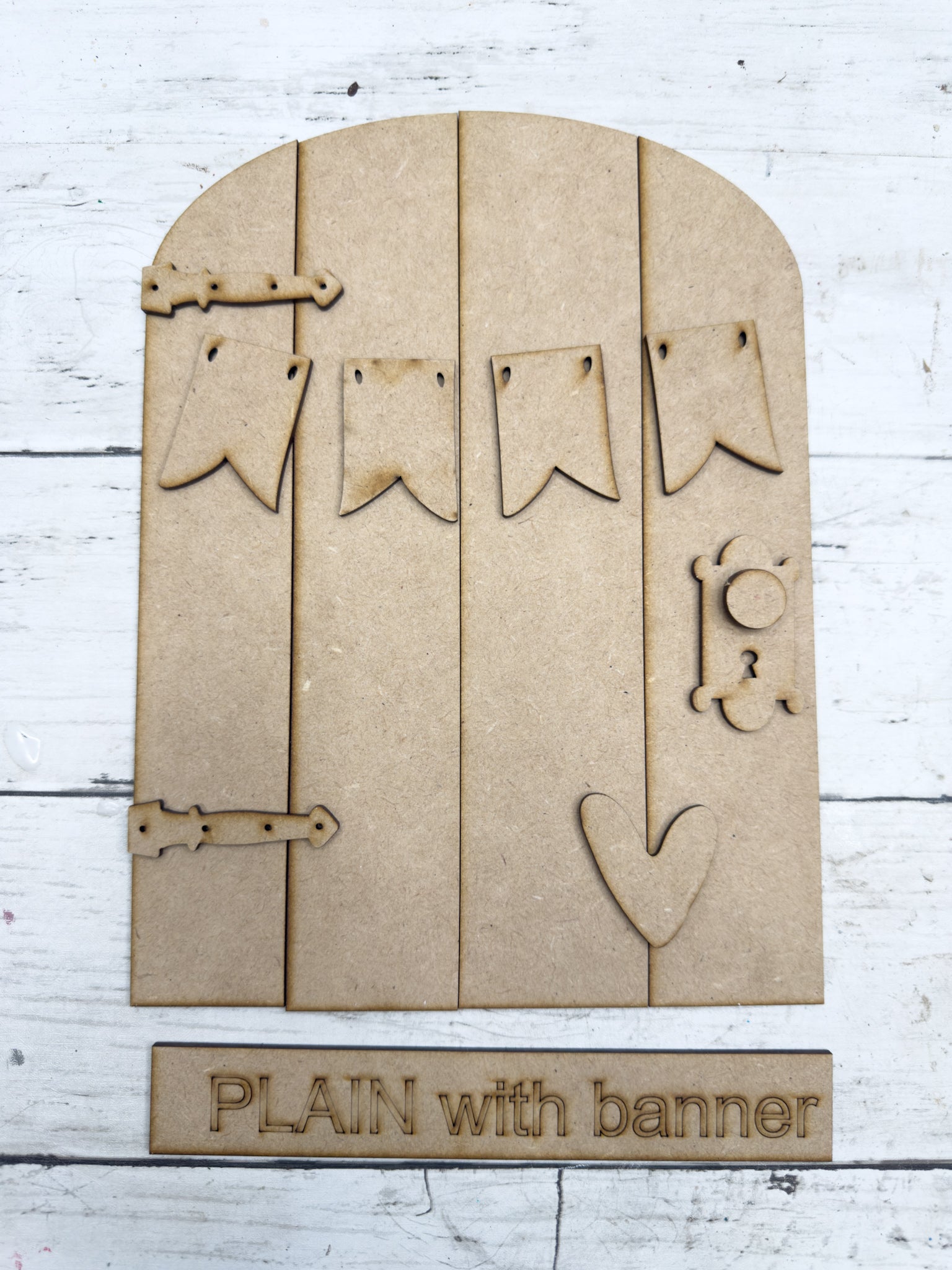 A beautiful piece with rustic charm, the plain Door Leaner with banner DIY Kit features a layered arched door design with blank banner pieces  that you can add your own details pieces to. Designed as a leaner, this piece makes a beautiful statement for everyday décor, or gift-giving.