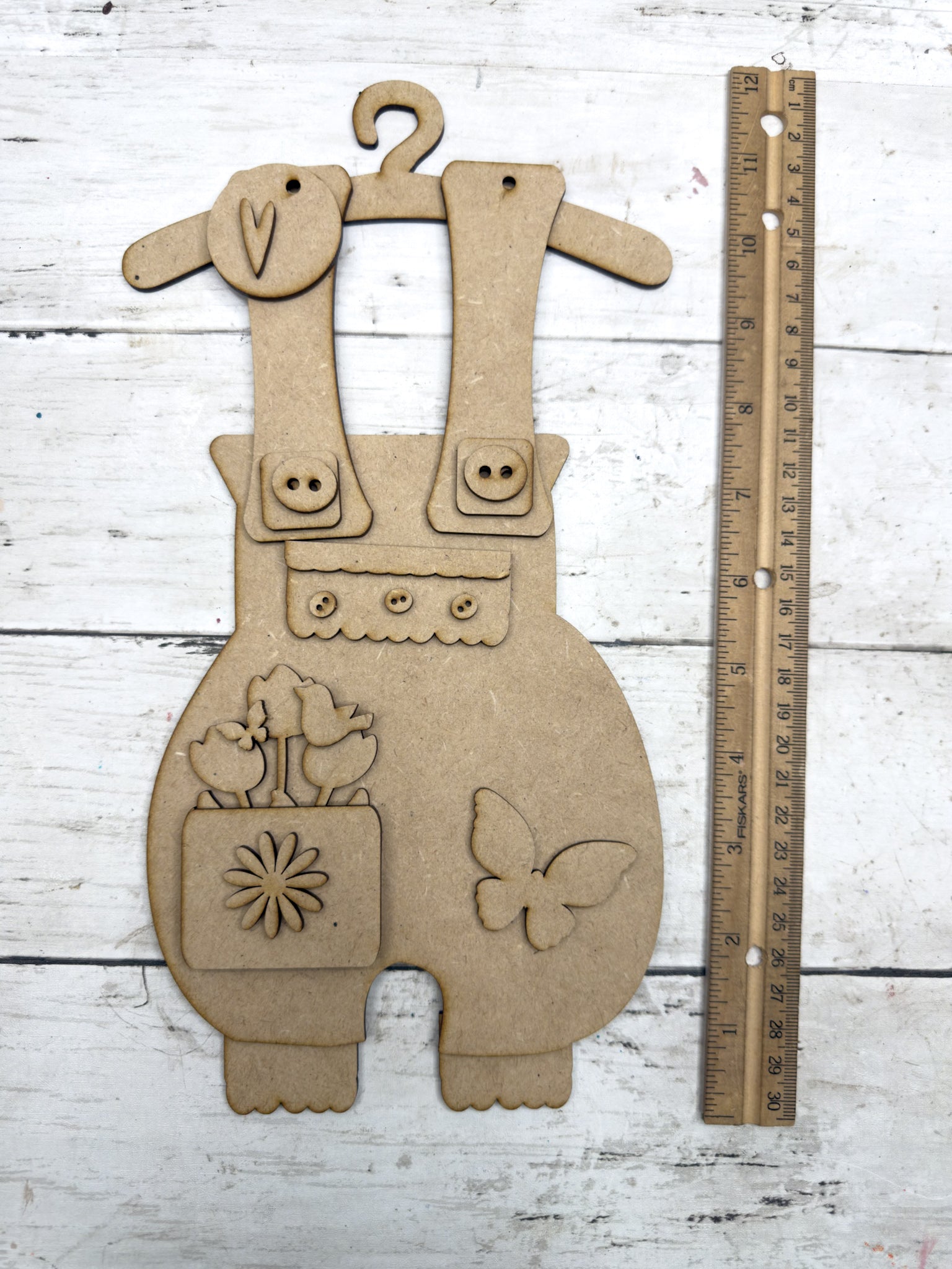 Bring sweet farmhouse charm to your spring décor with this Primitive Spring Overalls Hanging DIY Kit! Designed with layered straps, button details, scalloped trim, a flower-filled pocket, and butterfly accent, this piece is perfect for welcoming the new season.