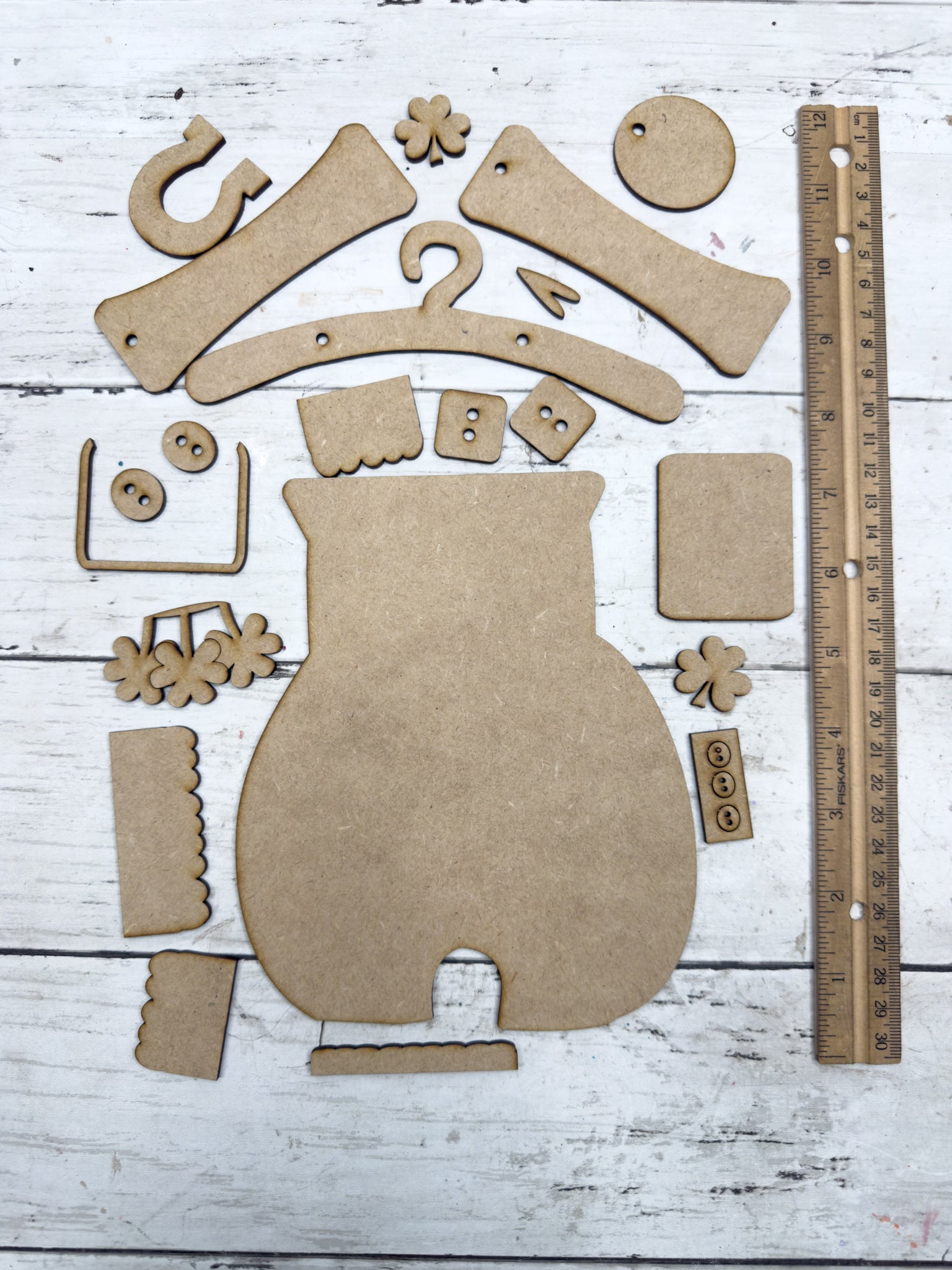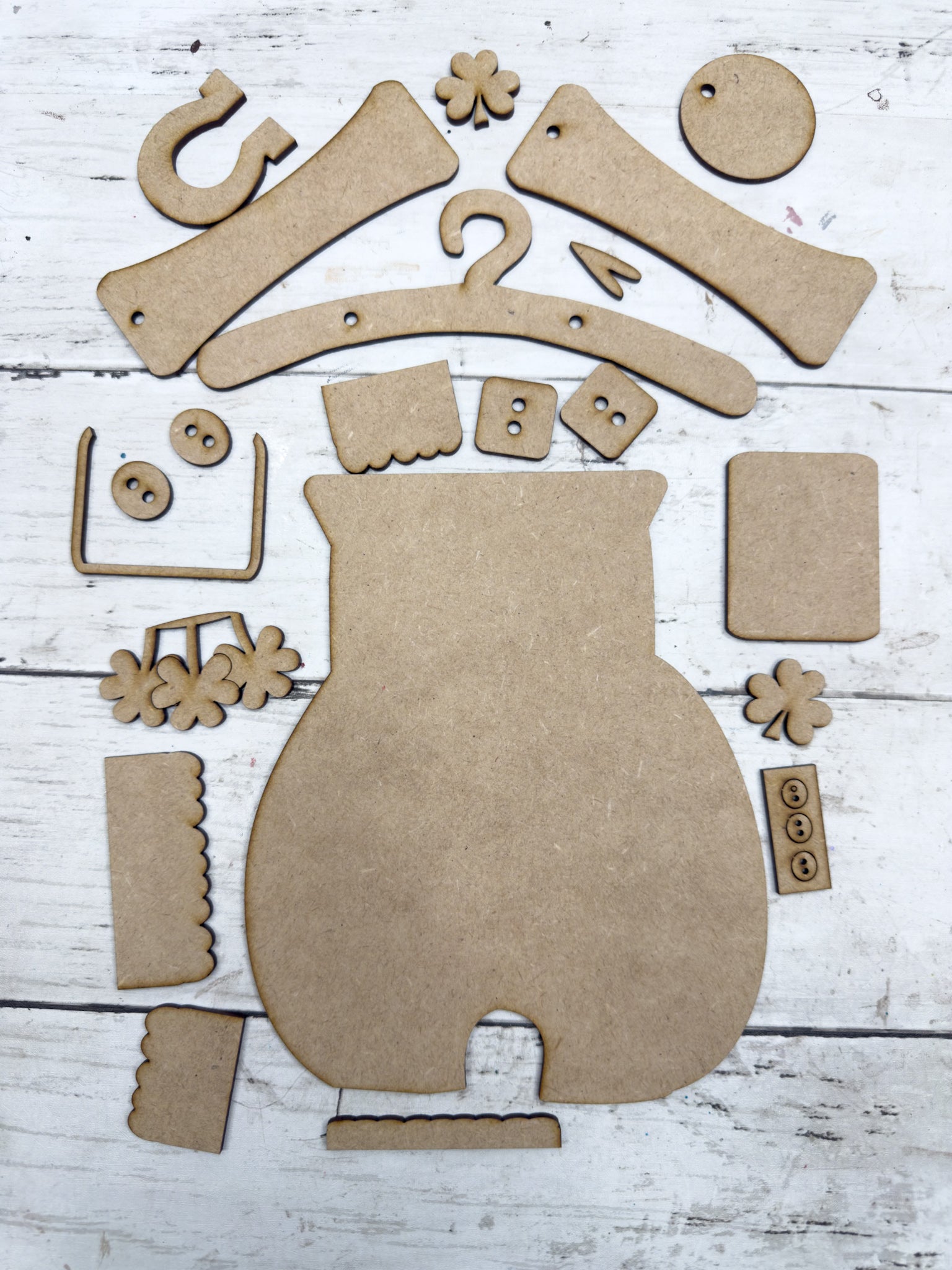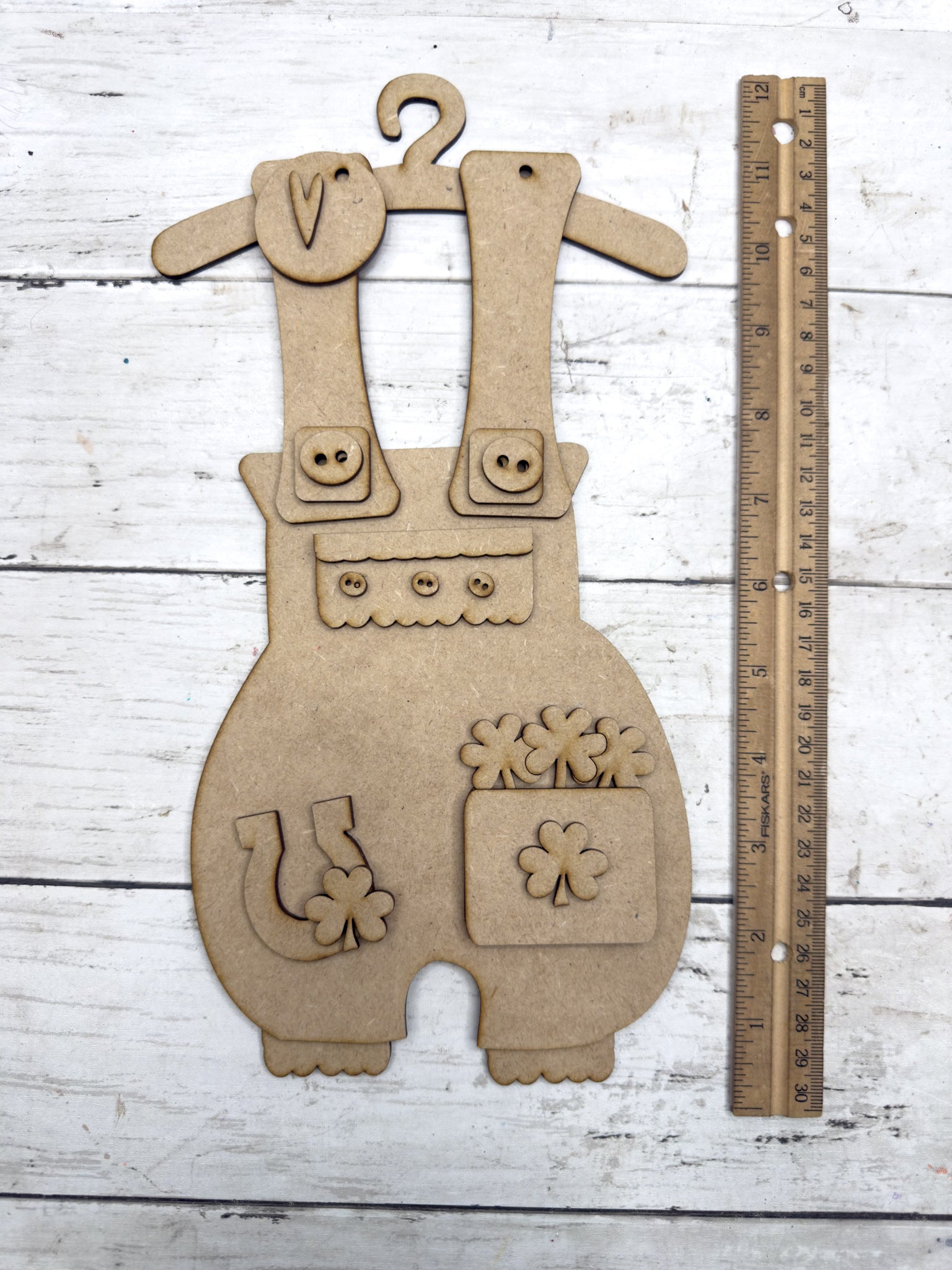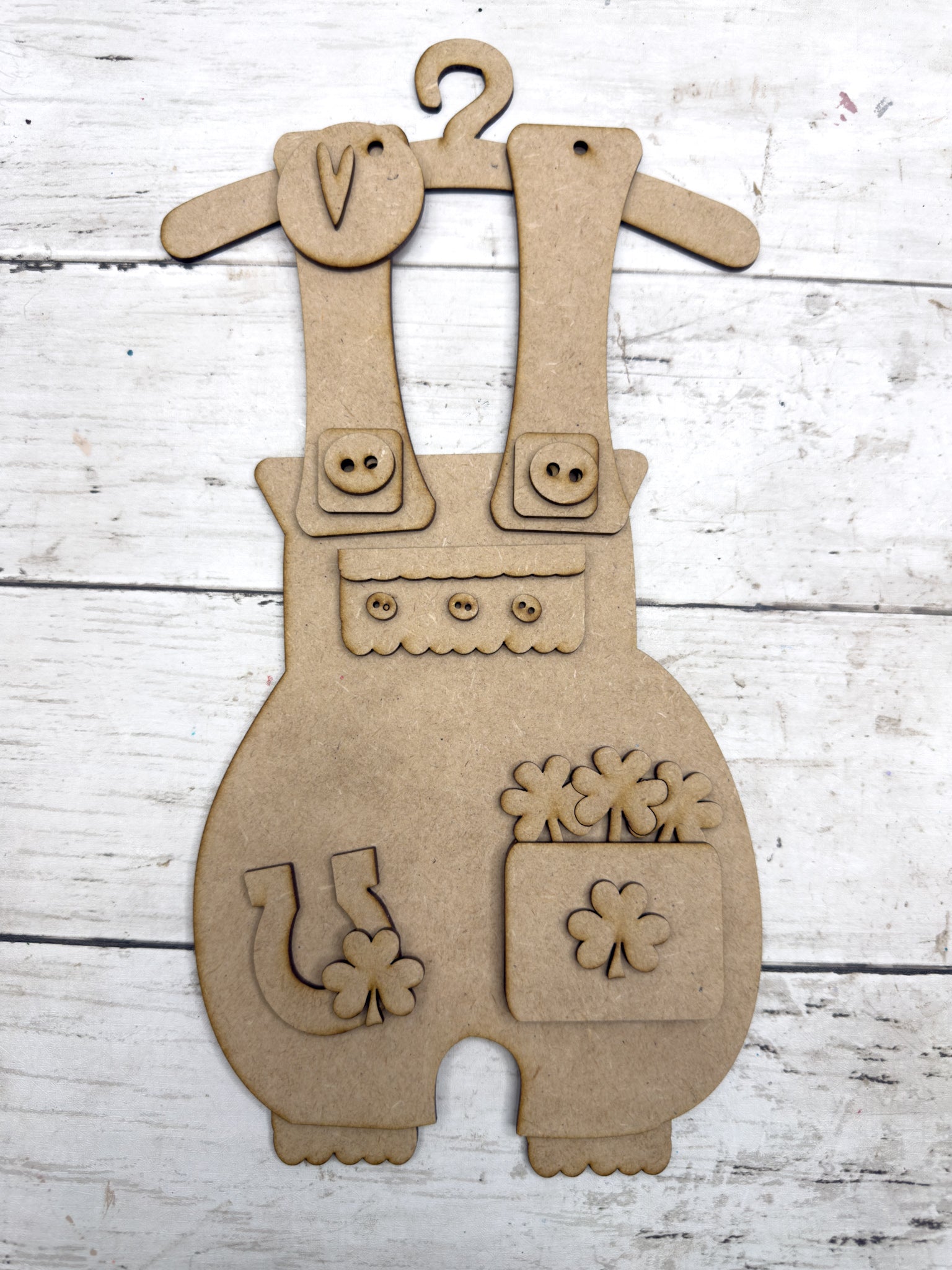 Add a little lucky farmhouse charm to your seasonal dĆ©cor with this Primitive St. Patrickās Overalls Hanging DIY Kit! Featuring layered straps with button details, scalloped trim, shamrock accents, and a lucky horseshoe, this piece is perfect for St. Patrickās Day decorating.