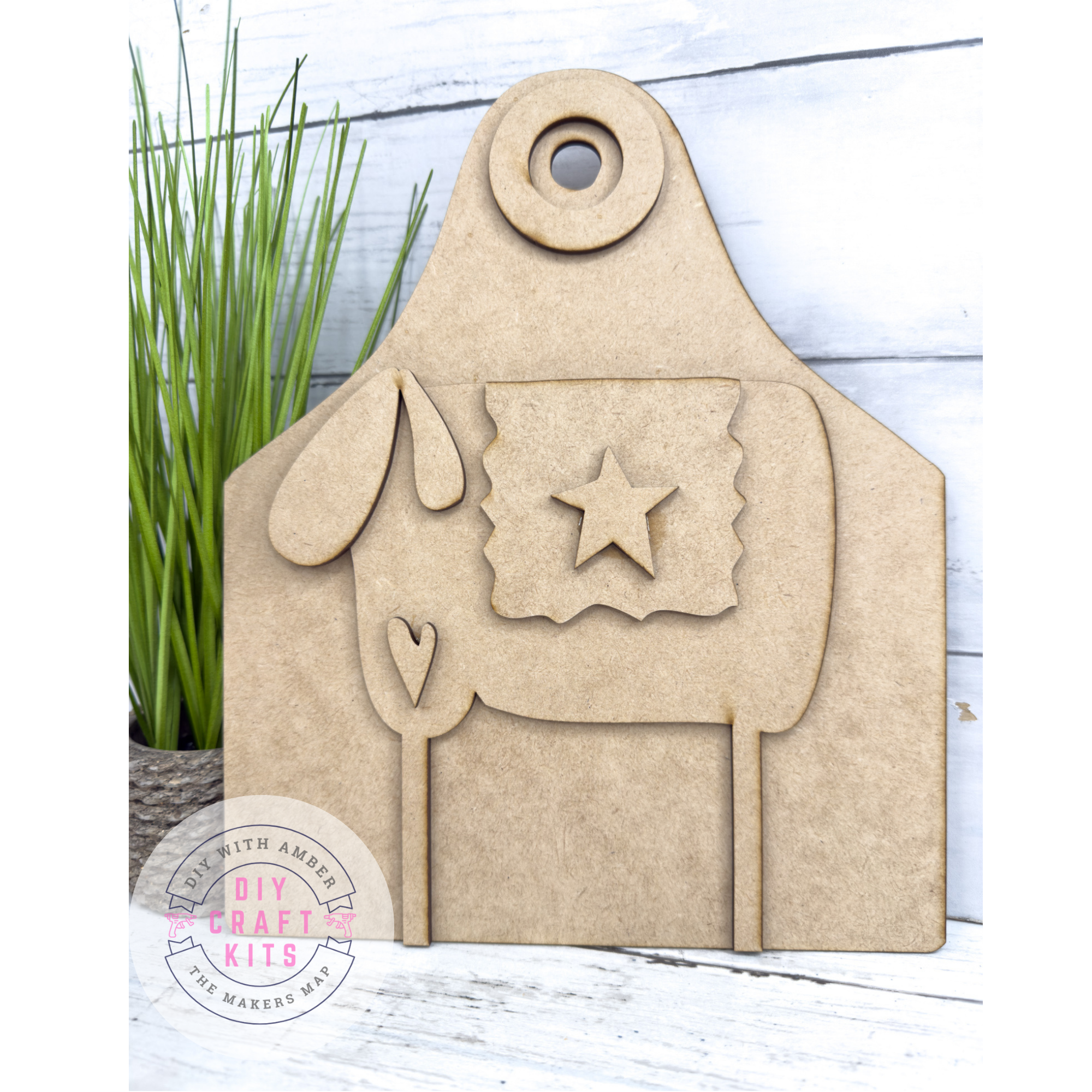 Bring a sweet primitive charm to your spring and farmhouse decor with this Primitive Sheep Tag DIY Kit! This unfinished wood craft features a standing sheep with a layered ear, heart detail, and a blanket-style star accent on a tag-shaped base.