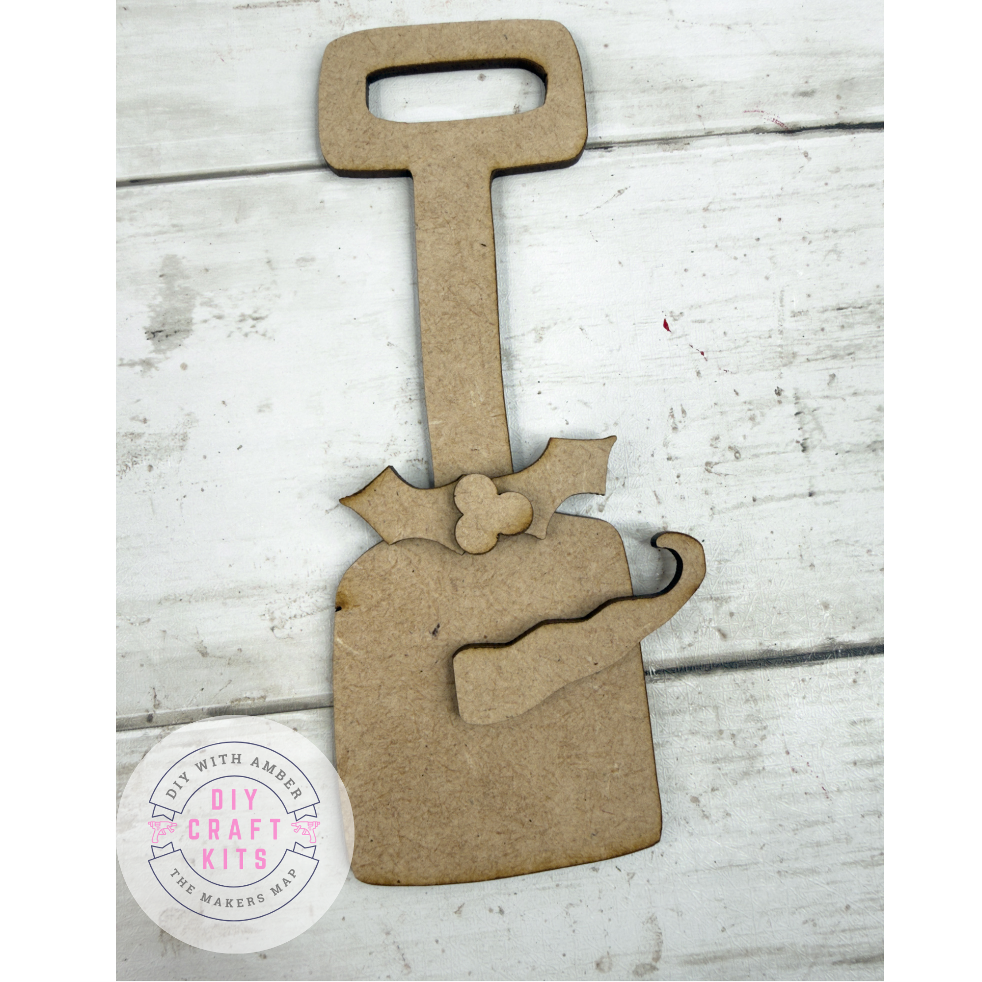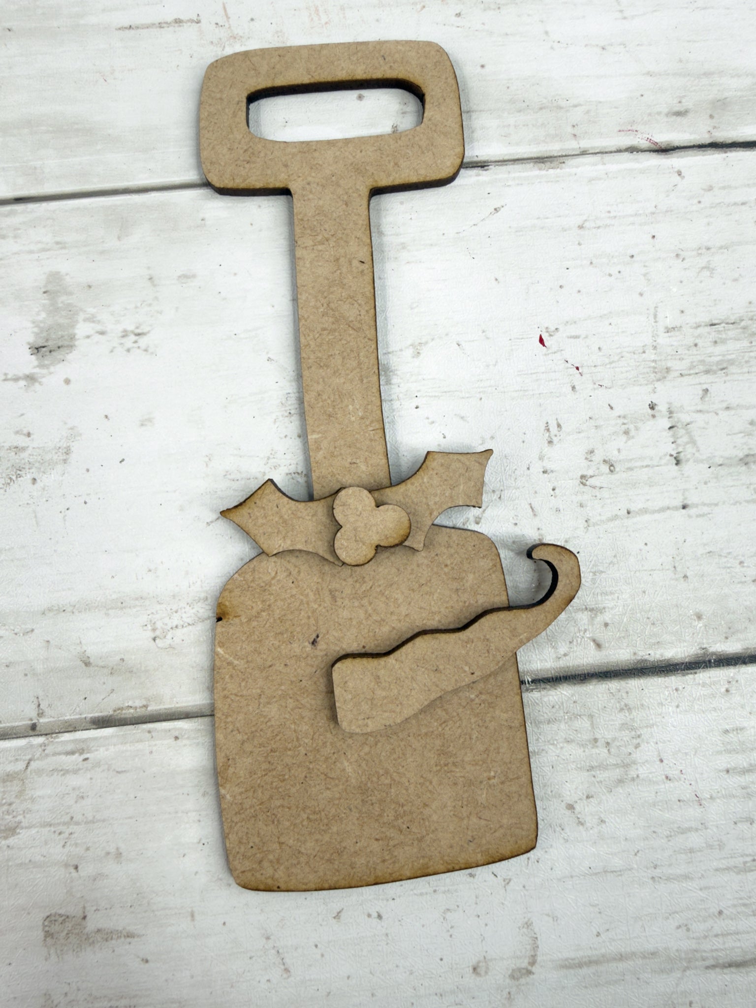 The design features a classic shovel shape with layered details including holly leaves, berries, and a cozy mitten—perfect for pairing with your primitive snowmen or farmhouse Christmas decor.