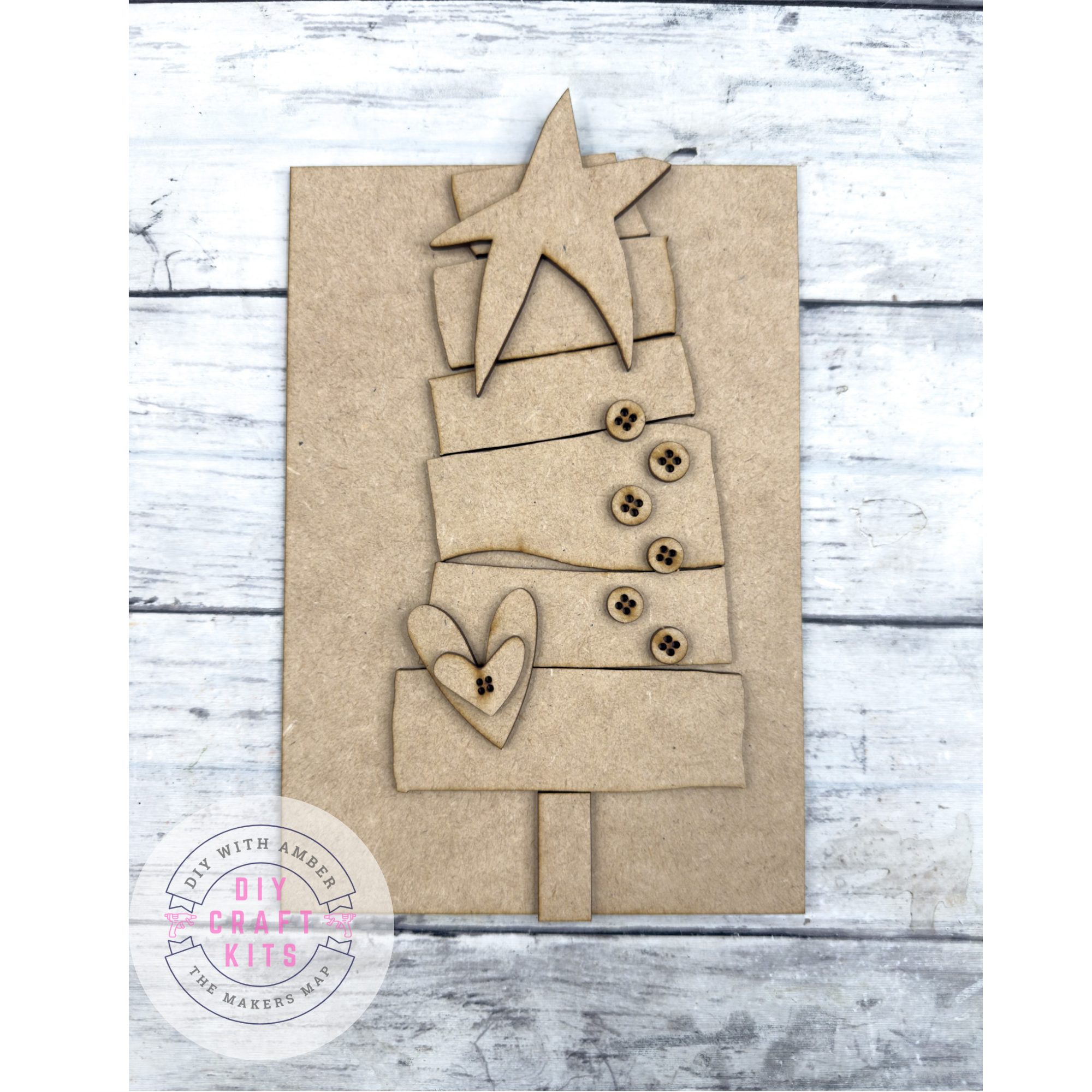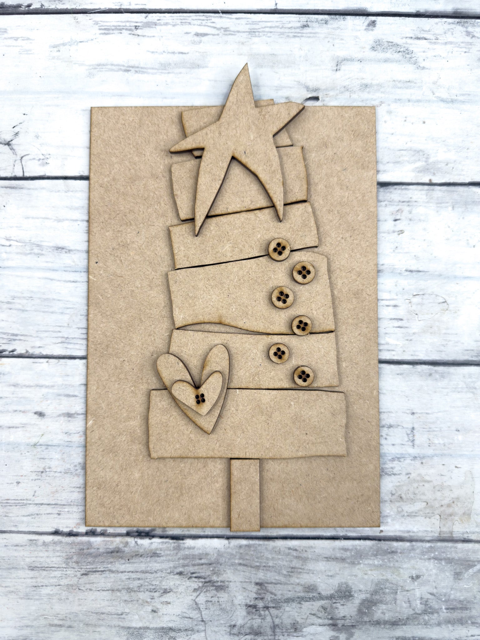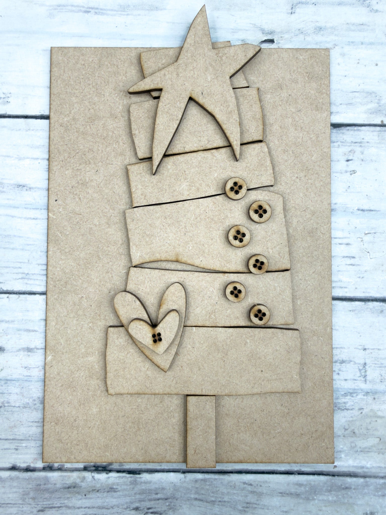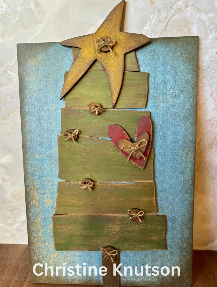Craft your own rustic holiday accent with this Primitive Stacked Christmas Tree Leaner DIY Kit. Featuring a layered Christmas tree with uneven stacked sections, button details, a heart, and topped with a star, this design captures that charming primitive farmhouse style. Perfect for holiday shelves, mantels, or tiered tray displays.
