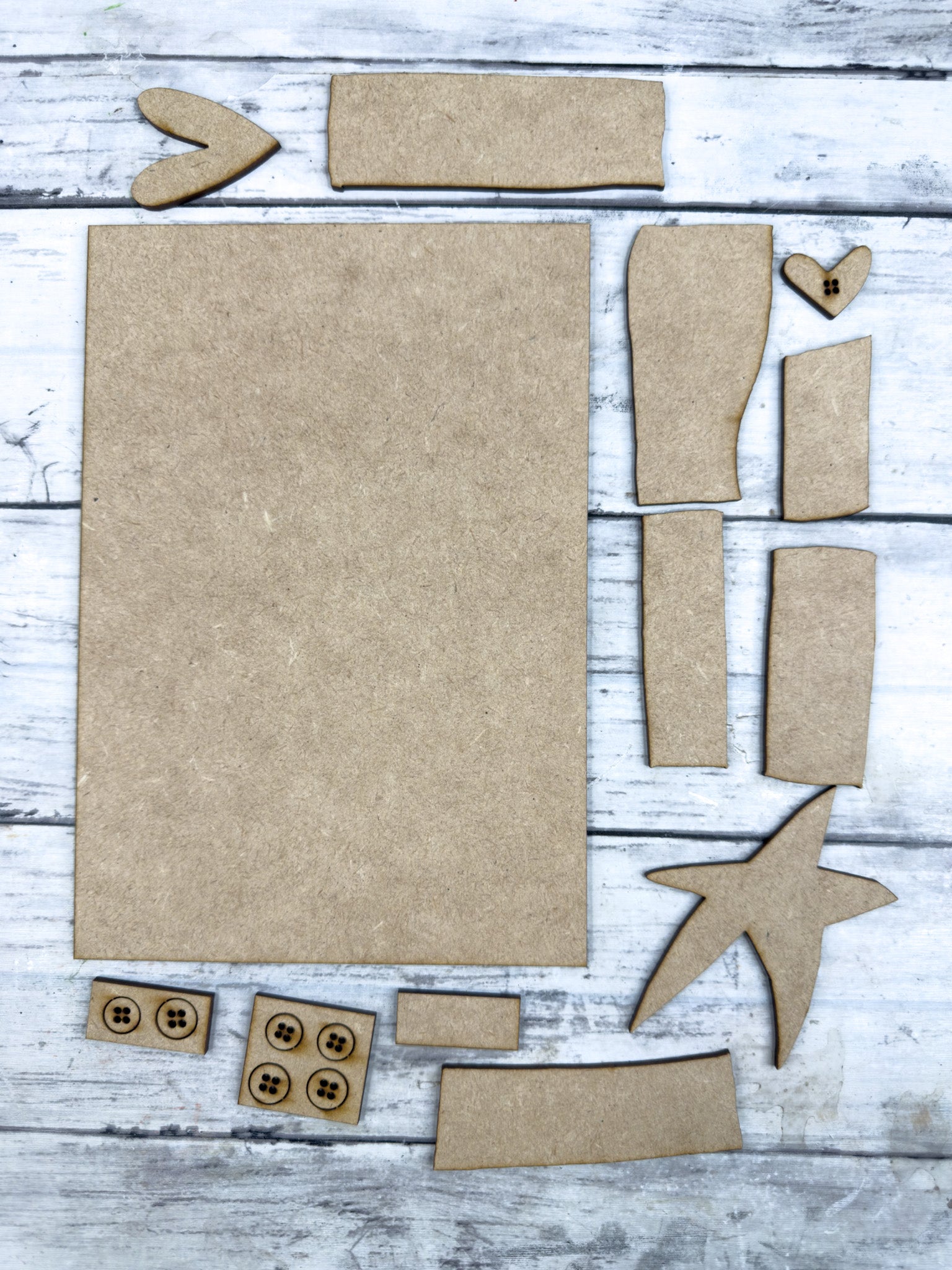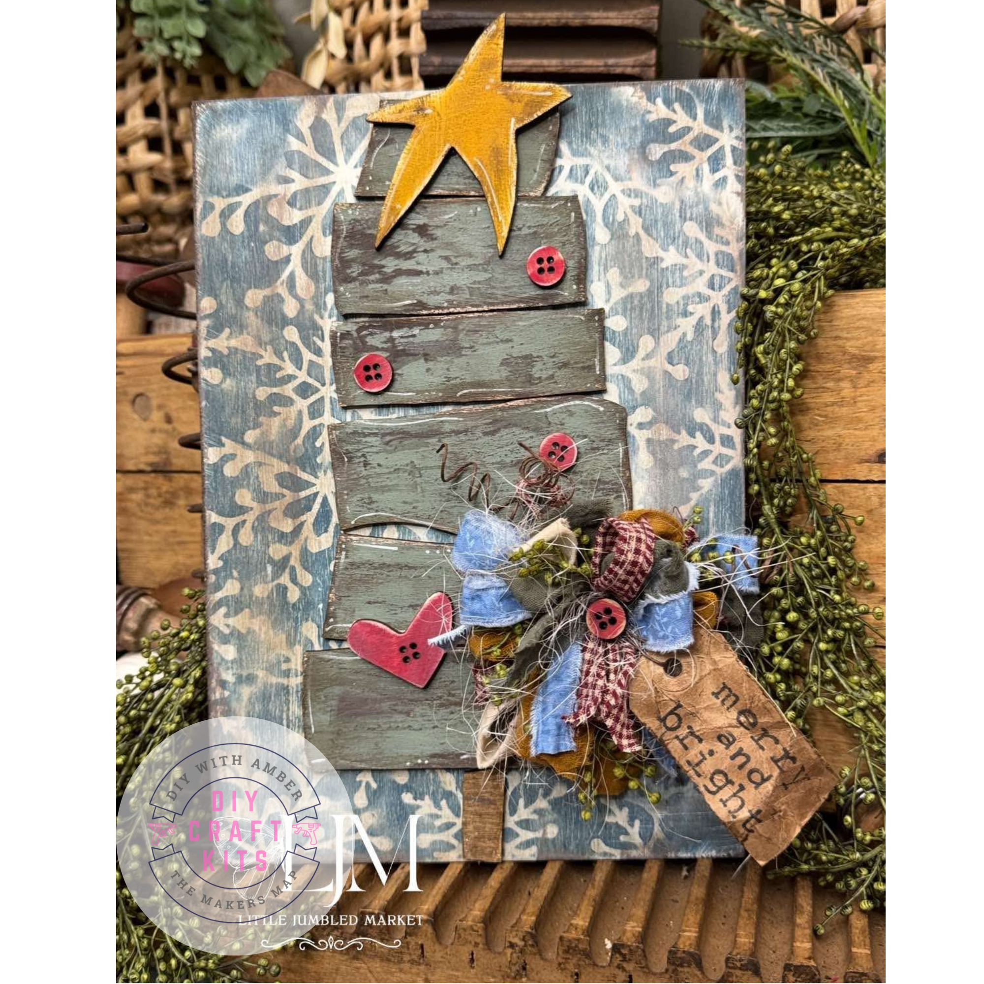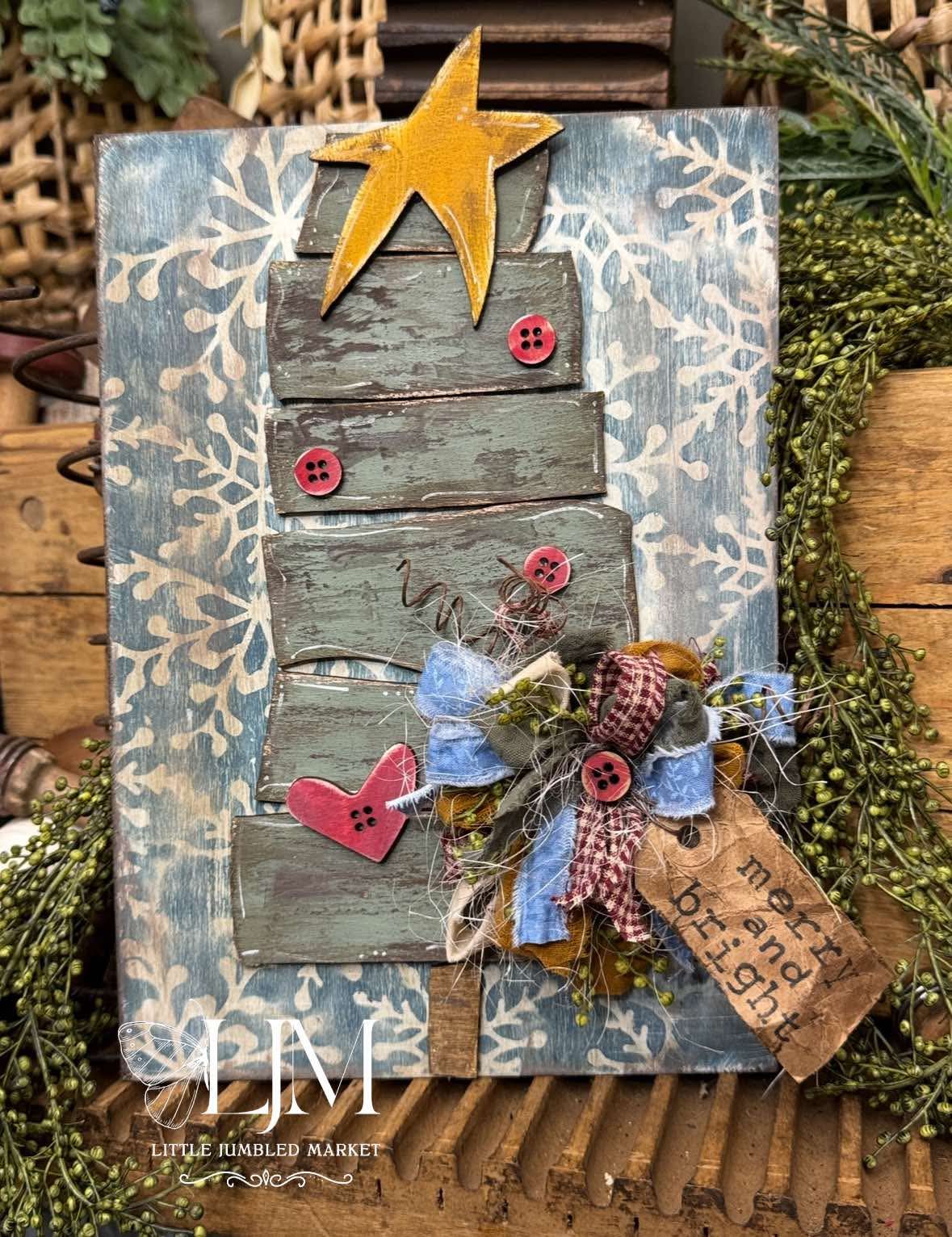 Craft your own rustic holiday accent with this Primitive Stacked Christmas Tree Leaner DIY Kit. Featuring a layered Christmas tree with uneven stacked sections, button details, a heart, and topped with a star, this design captures that charming primitive farmhouse style. Perfect for holiday shelves, mantels, or tiered tray displays.