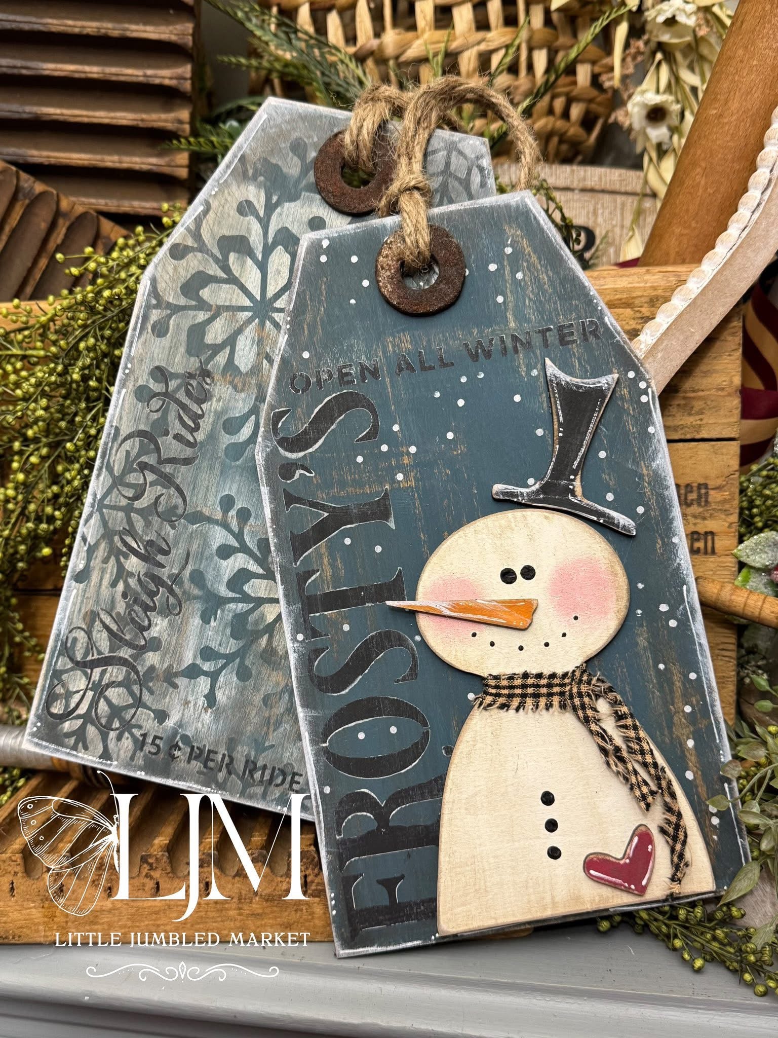Customize your snowman tags in traditional red and green, neutral farmhouse tones, or sparkling metallics for a one-of-a-kind look. Ideal for mantels, tiered trays, shelves, or wall displays.