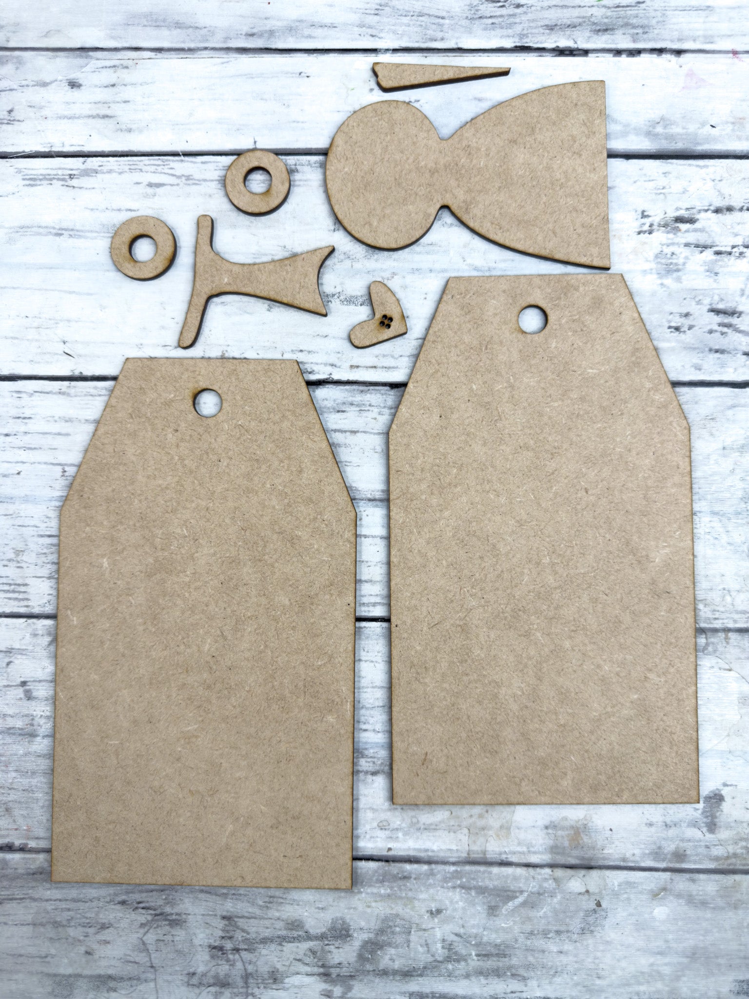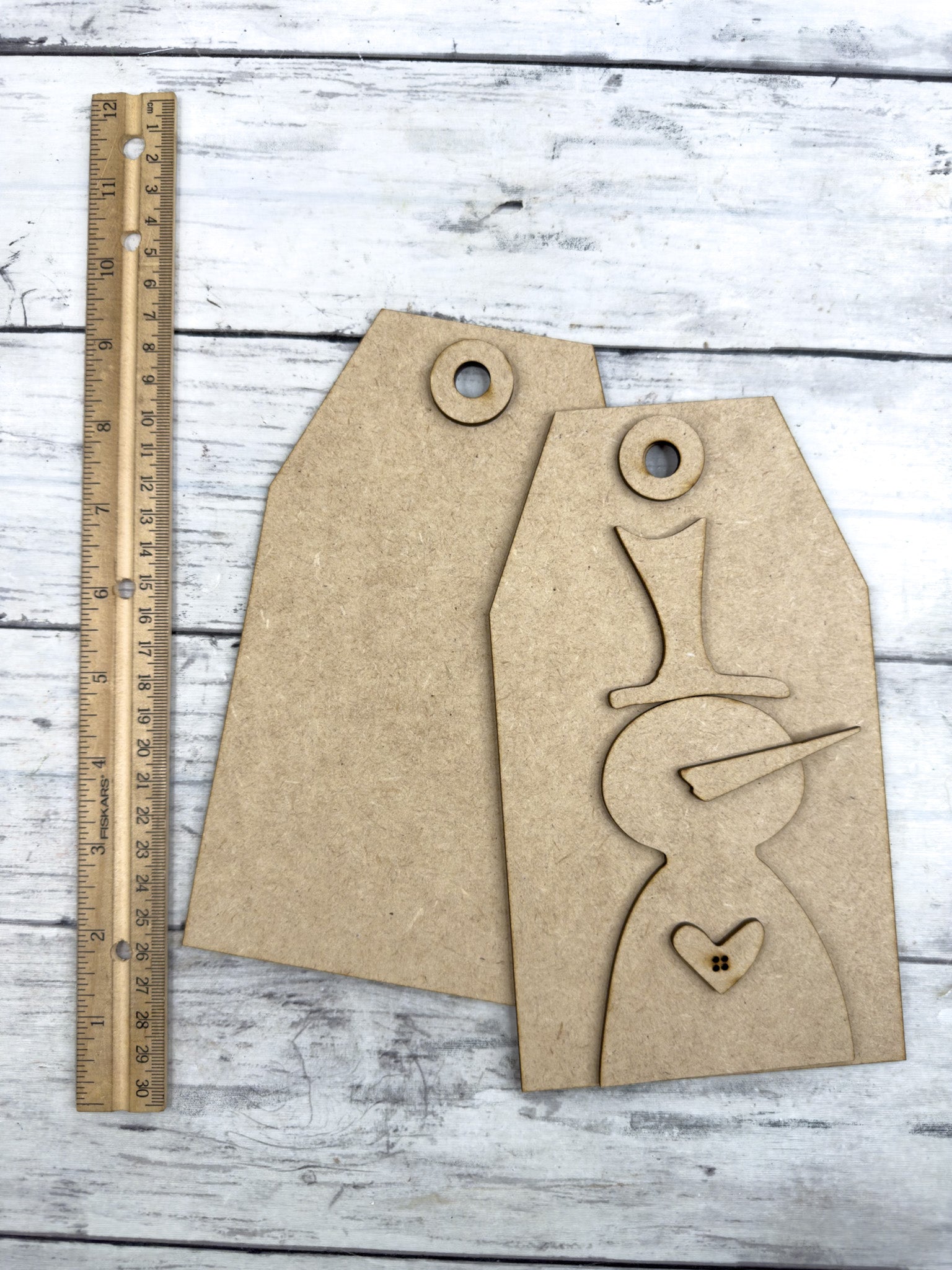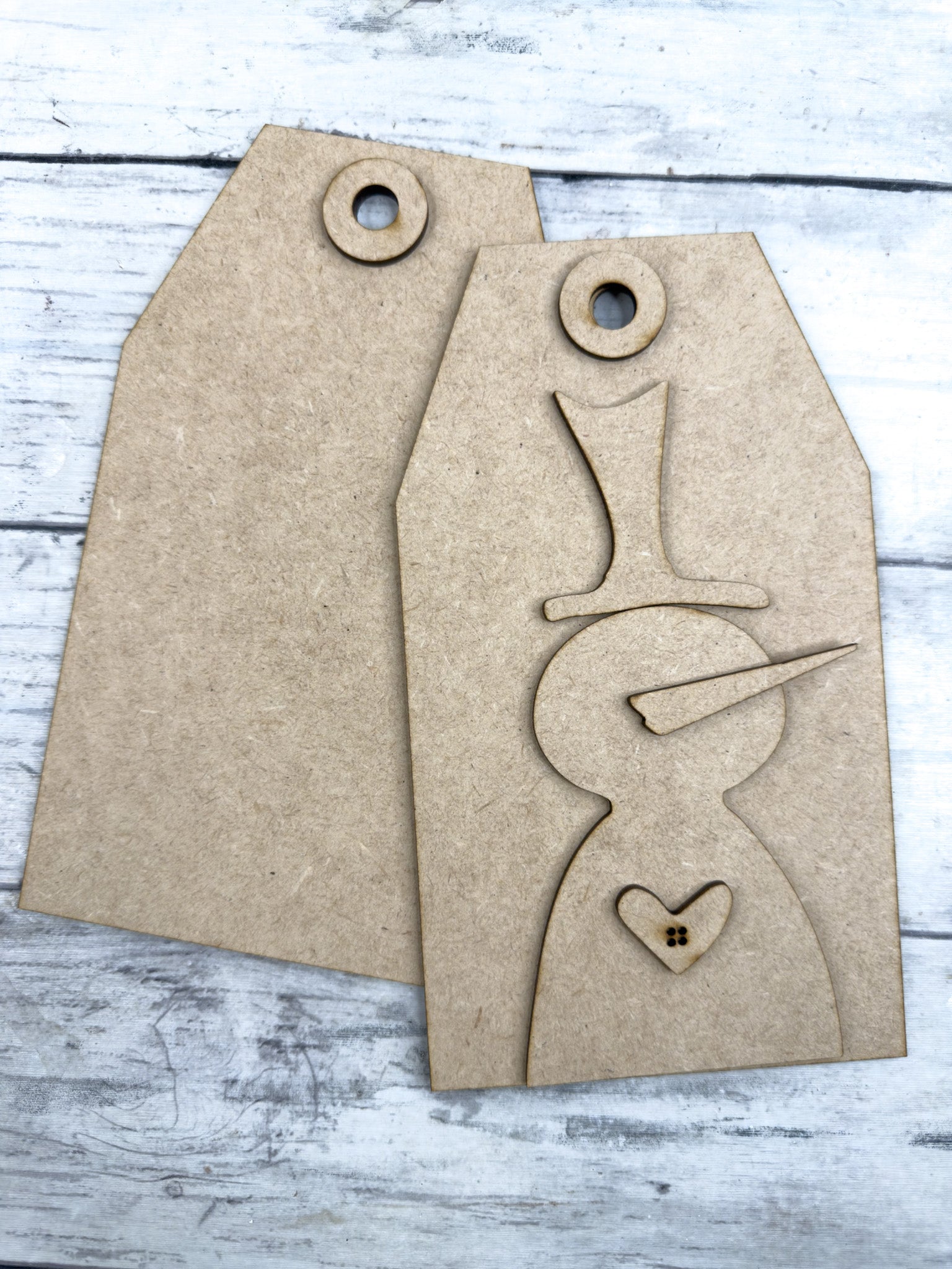 Bring festive charm to your home this season with the Snowman Tags DIY Craft Kit. Each unfinished wood tag is about 8 inches tall and features a classic snowman design complete with a tall hat, carrot nose, and heart accent. These oversized tags are perfect for painting, staining, or embellishing to match your holiday style.