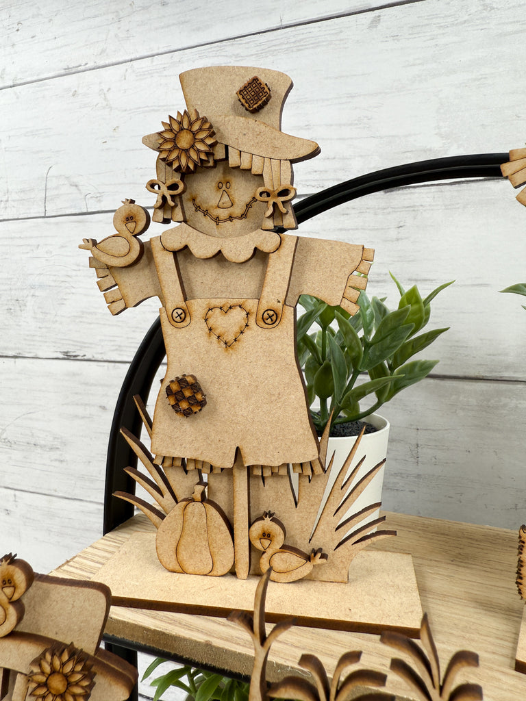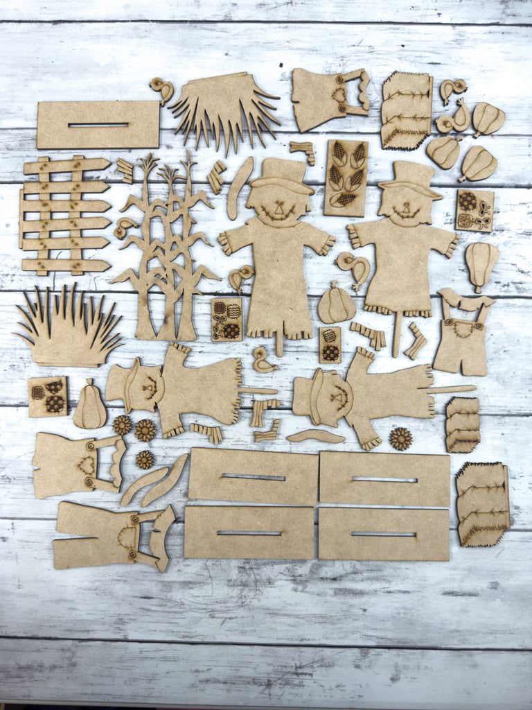 Celebrate the harvest season with this charming Set of Scarecrows DIY Craft Kit! This unfinished wood kit includes adorable scarecrows, pumpkins, corn stalks, ducks, hay bales, and a picket fence — everything you need to create a cozy fall farmhouse display.