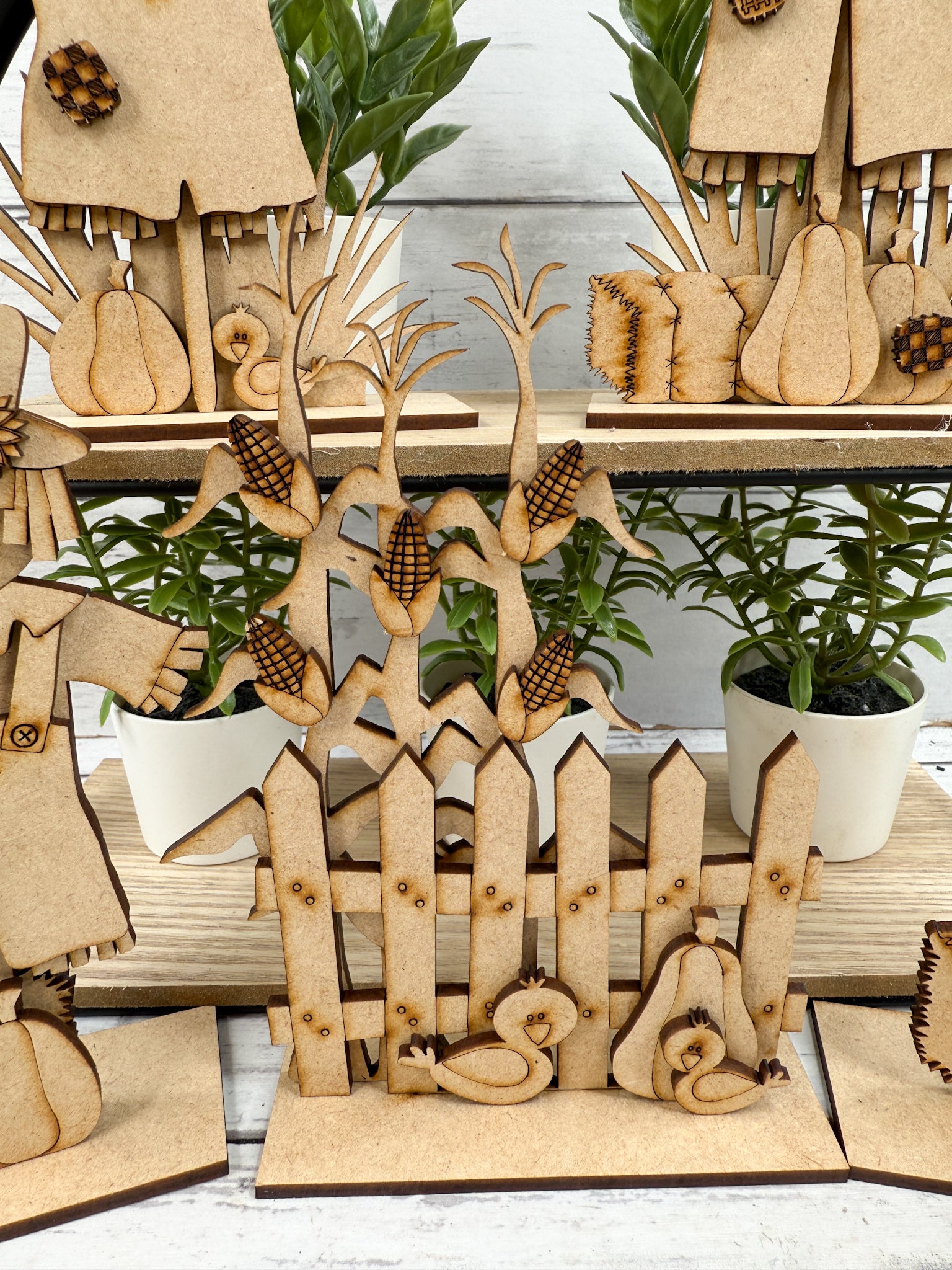 Unfinished wood pieces for scarecrows, fence, pumpkins, hay bales, and more