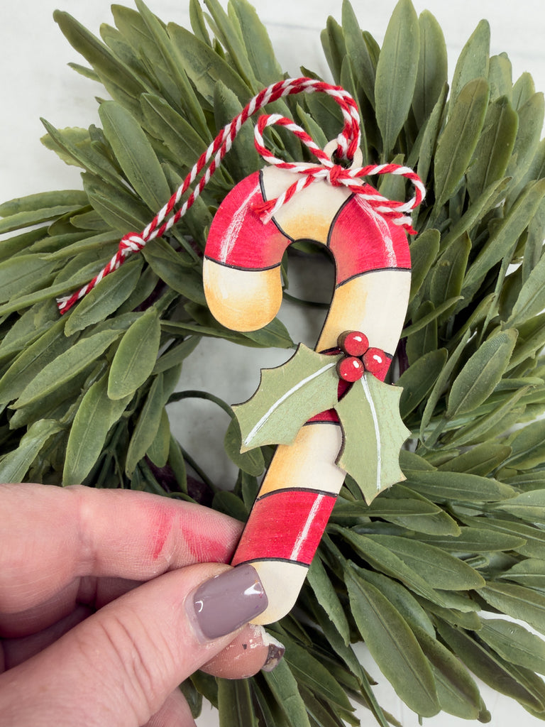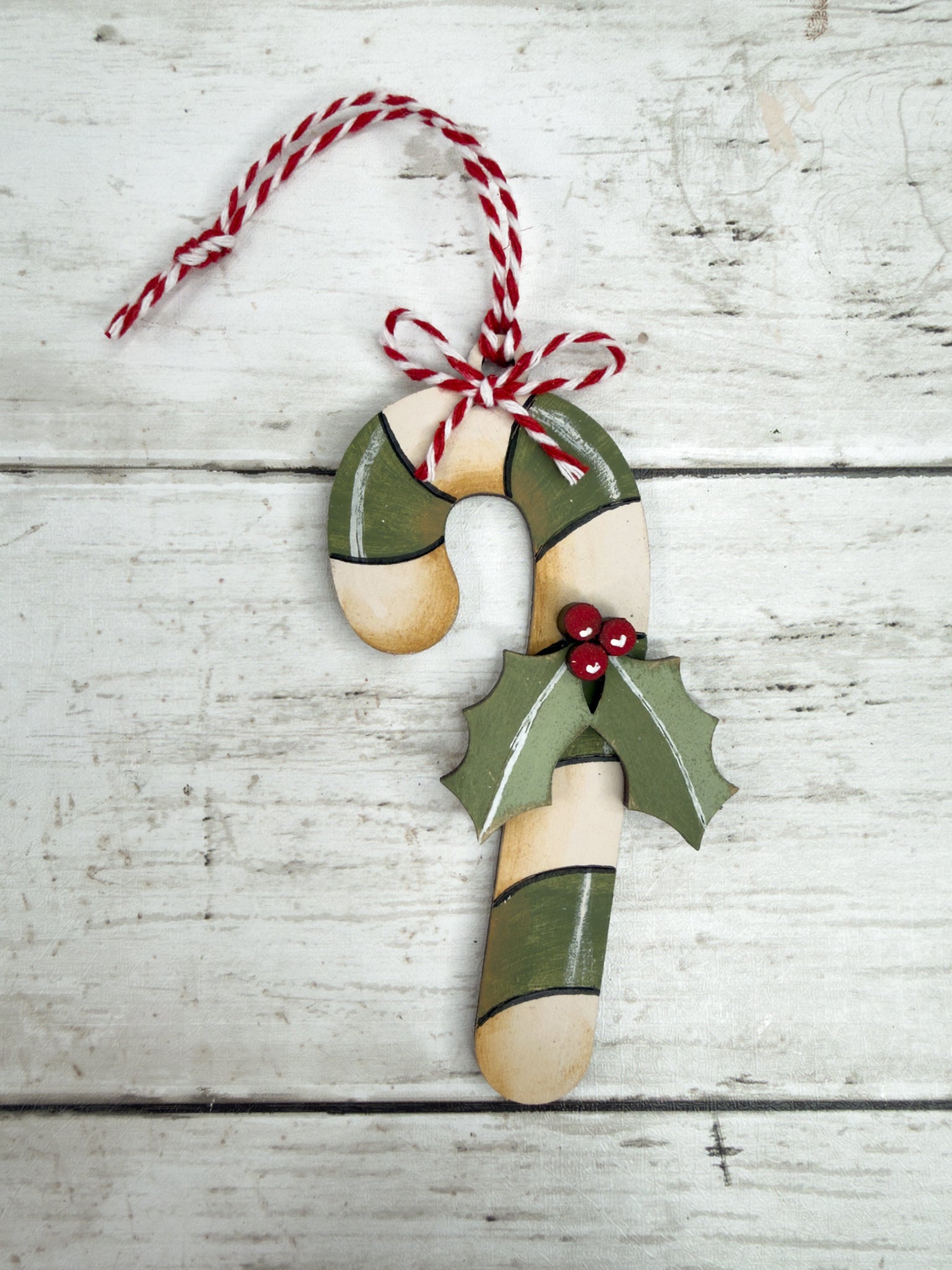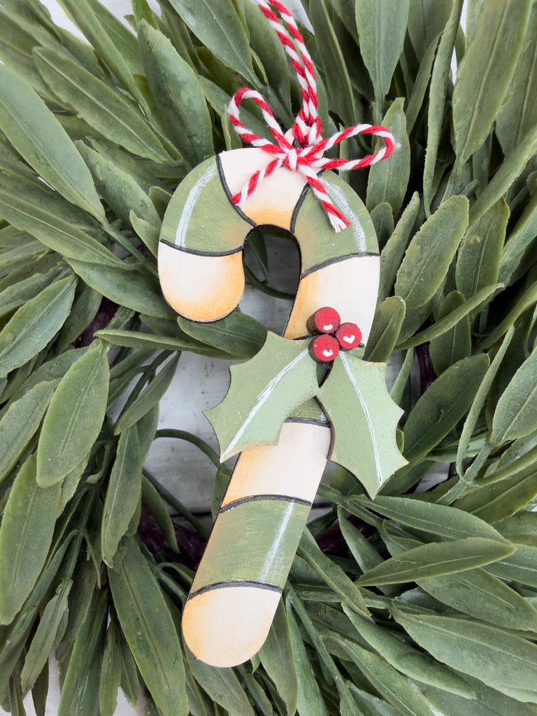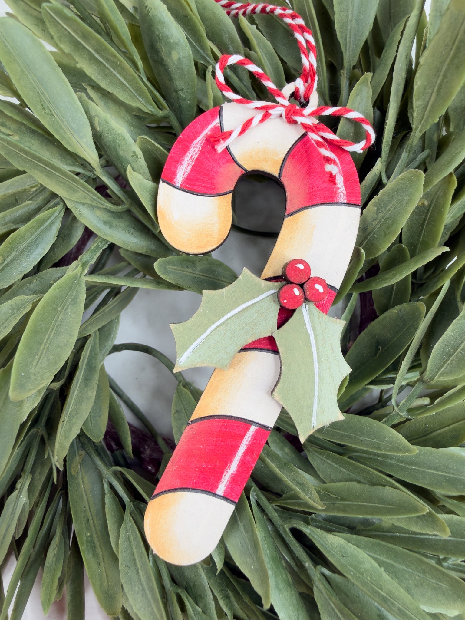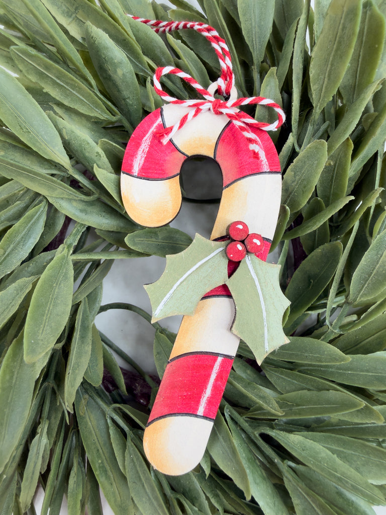 Add a sweet touch to your Christmas décor with this Cute Candy Cane Ornament! Featuring one candy cane festive honly and berries, this piece makes the perfect rustic farmhouse decoration for your holiday tree, wreaths, or handmade gifts.