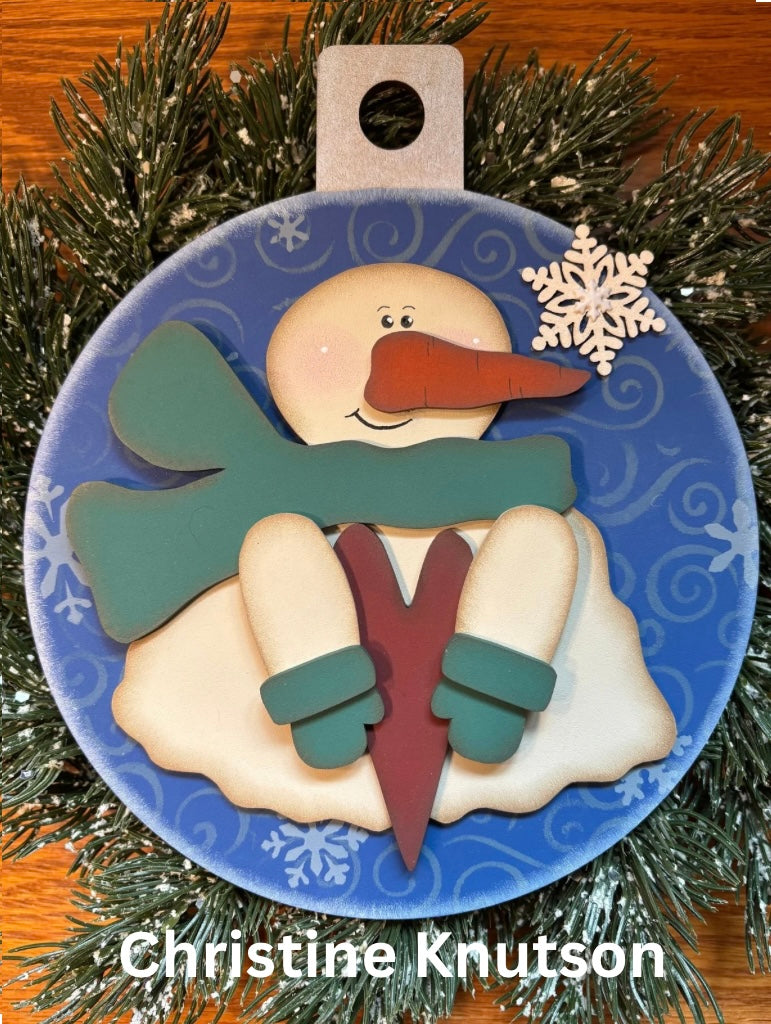 • Layered snowman design with scarf, mittens, nose, and round board base