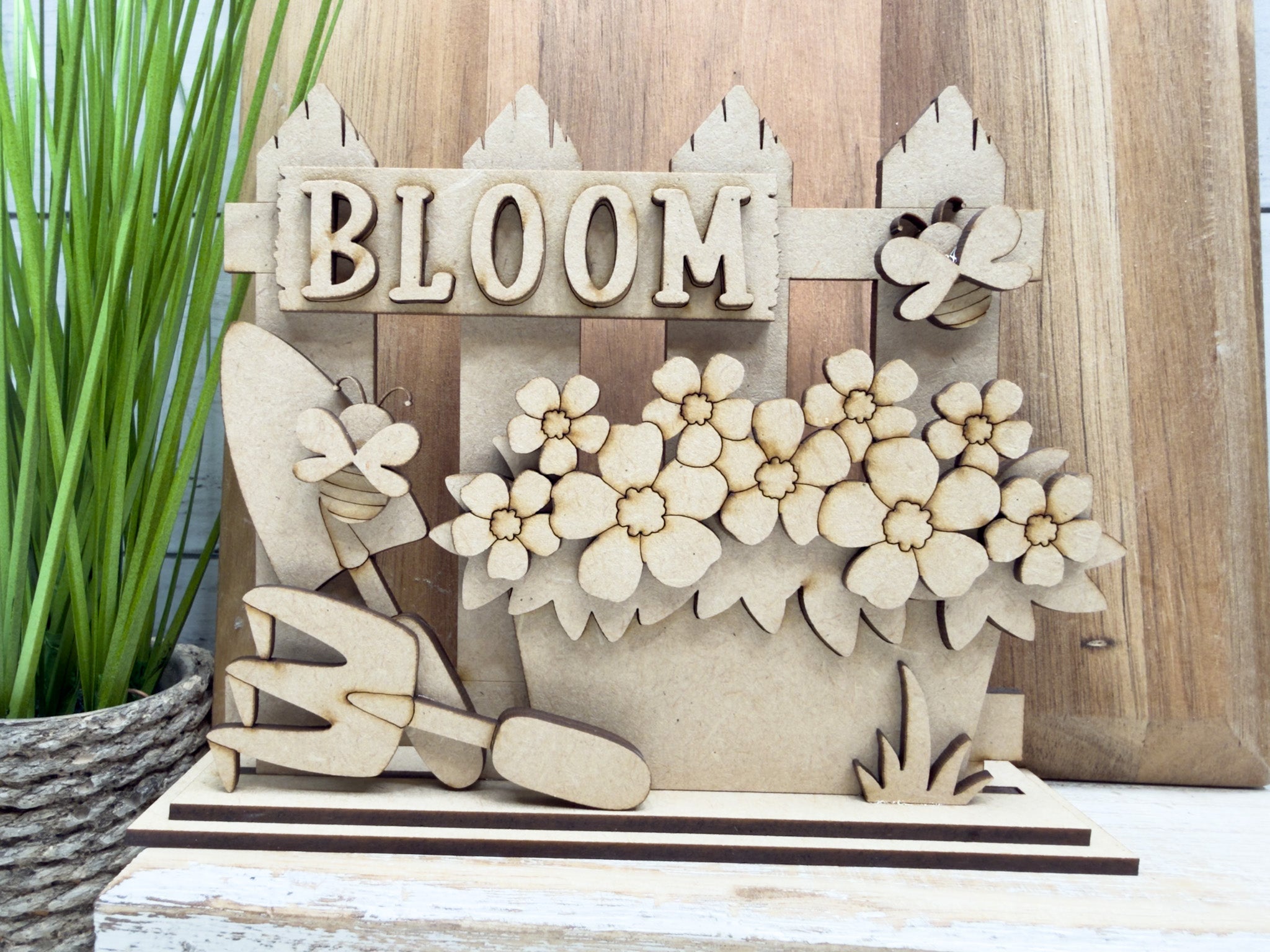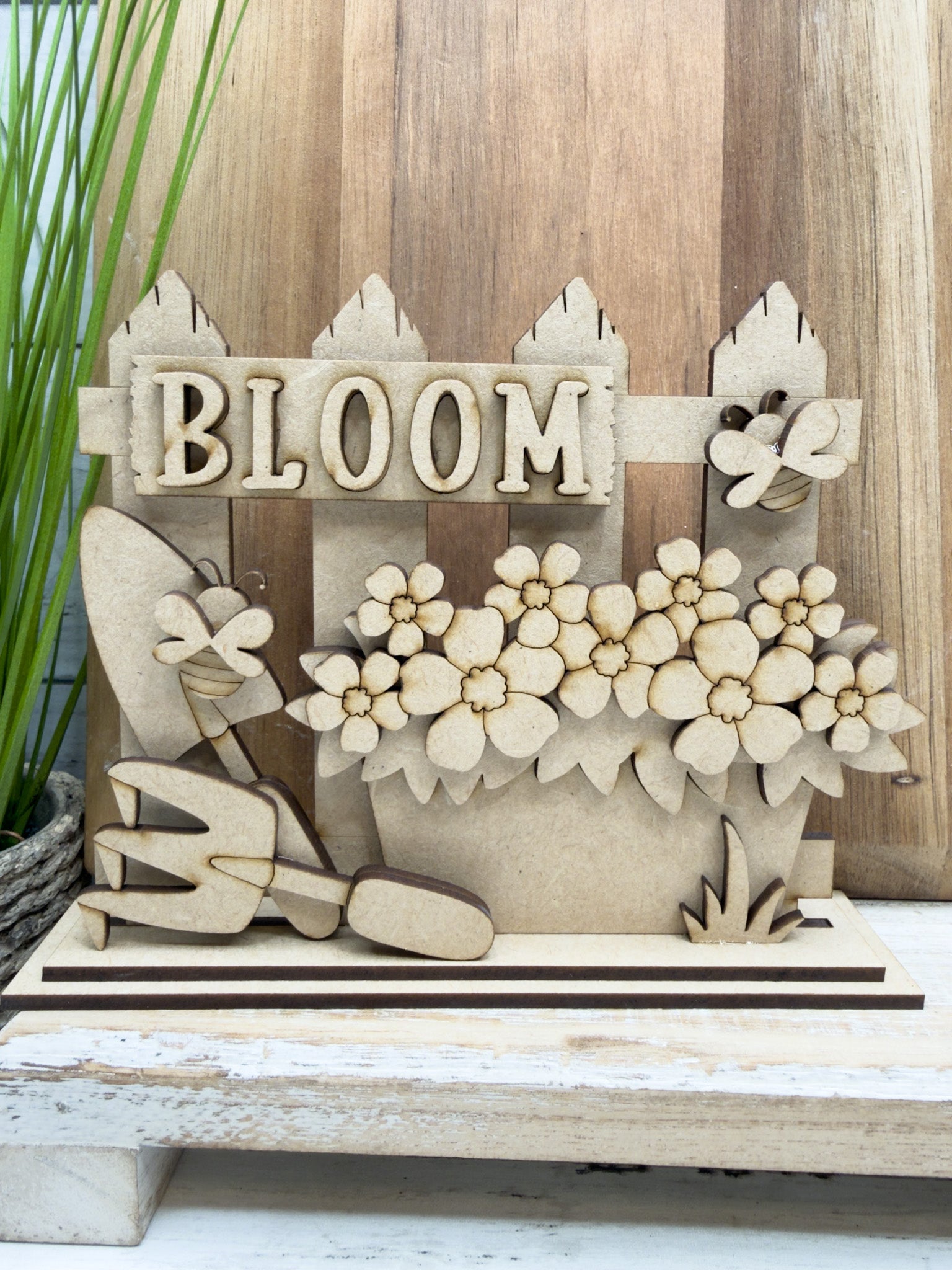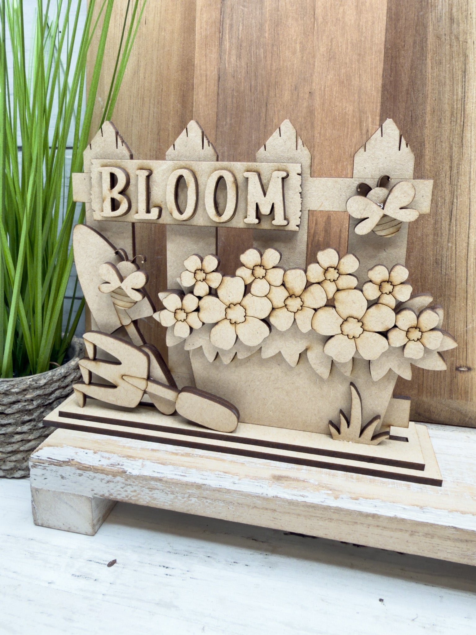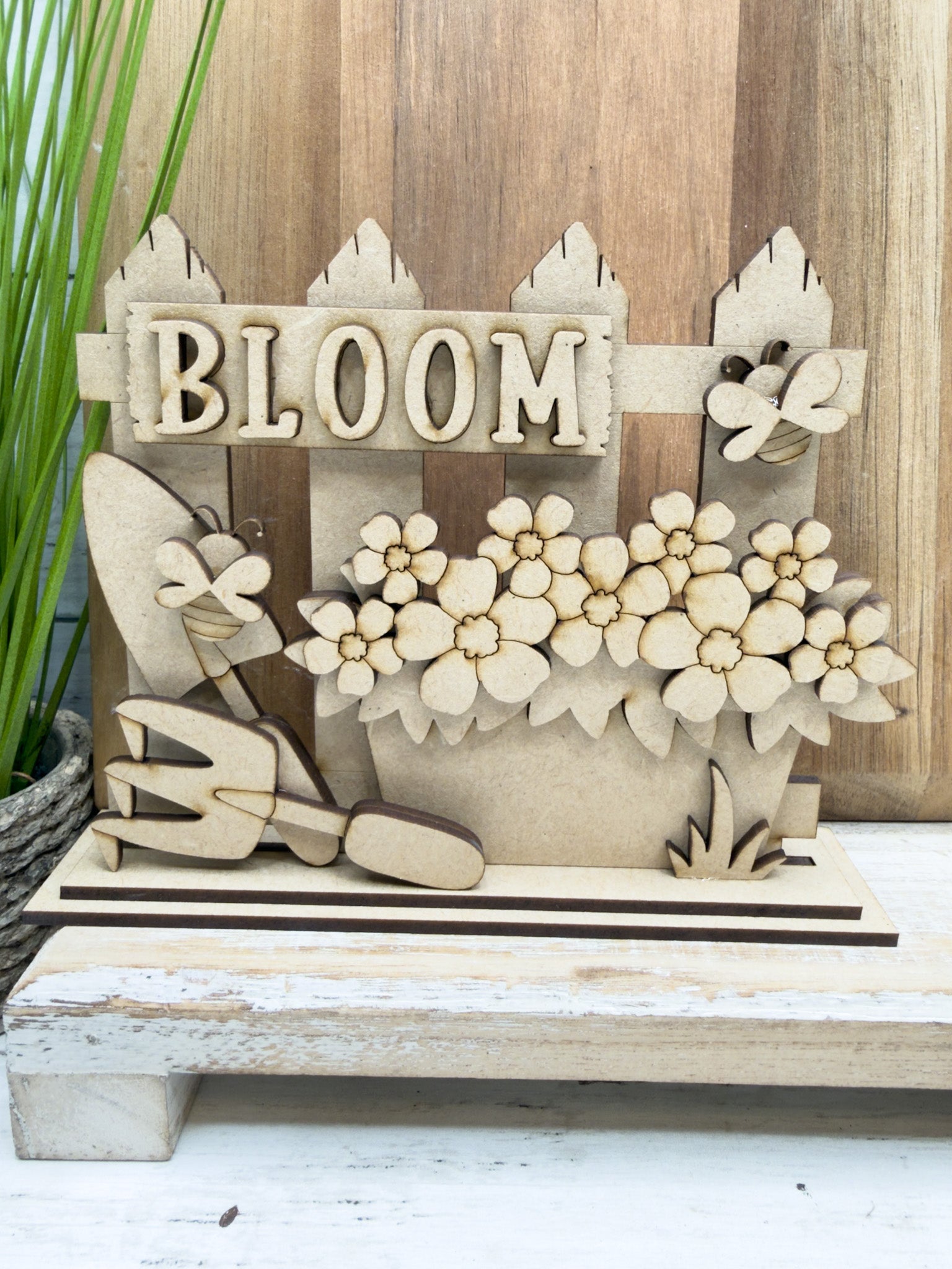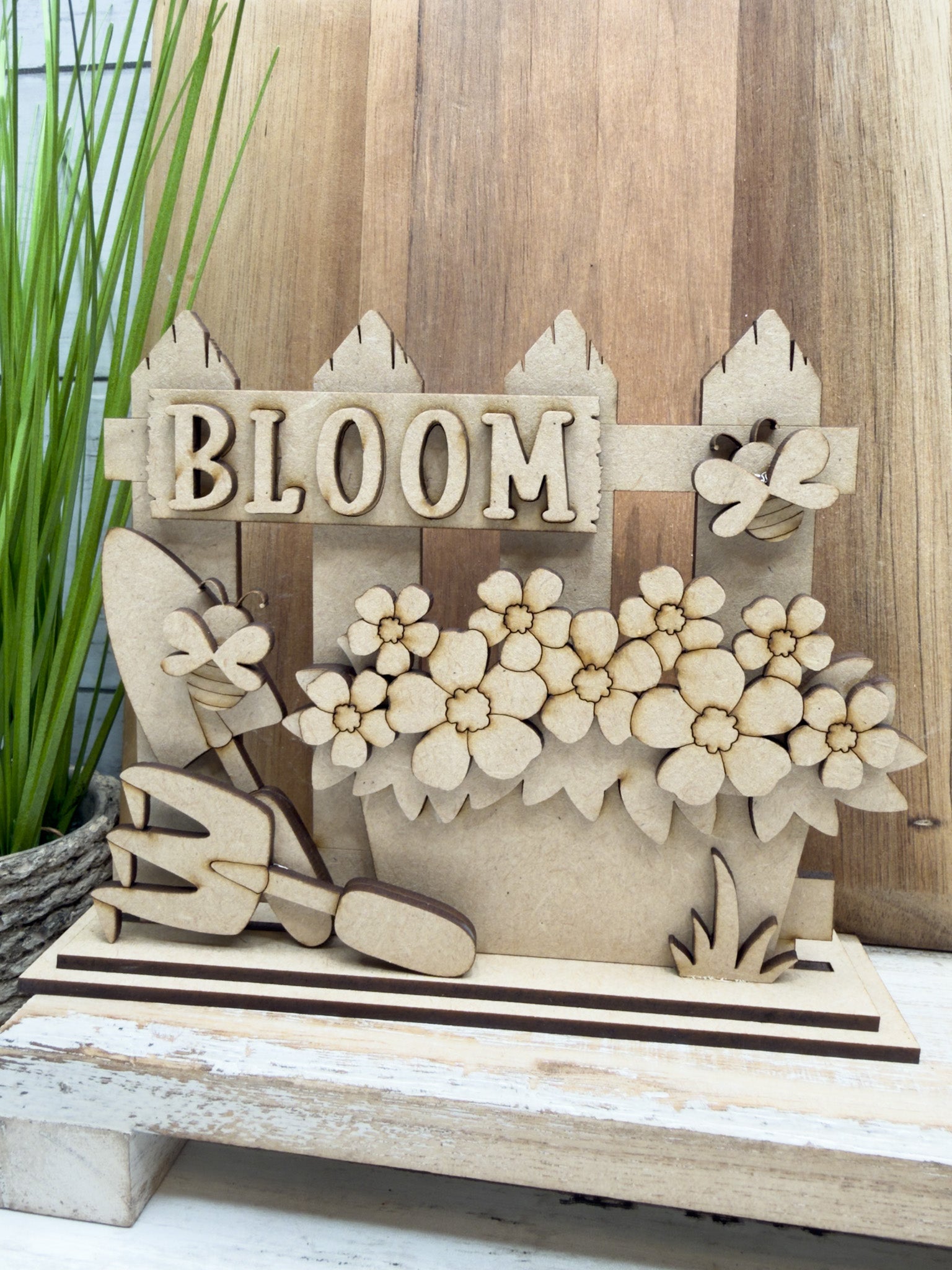 Welcome spring the handmade way with our Spring Bloom Fence DIY Kit! This layered laser-cut design features a charming picket fence, blooming flower box, sweet bees, garden tools, and a bold “BLOOM” sign — everything you love about spring in one beautiful shelf sitter.