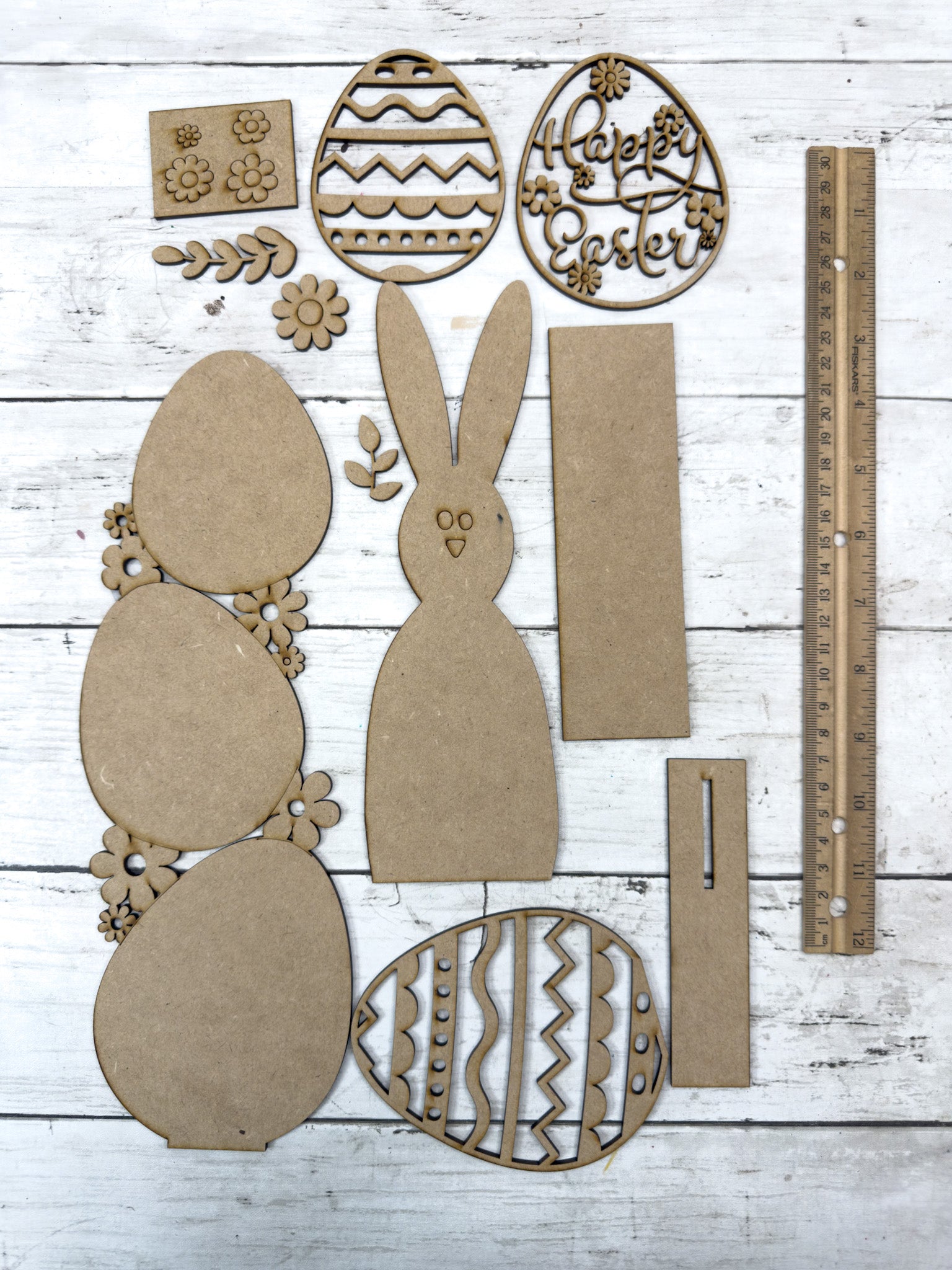 • All laser-cut wood pieces shown
