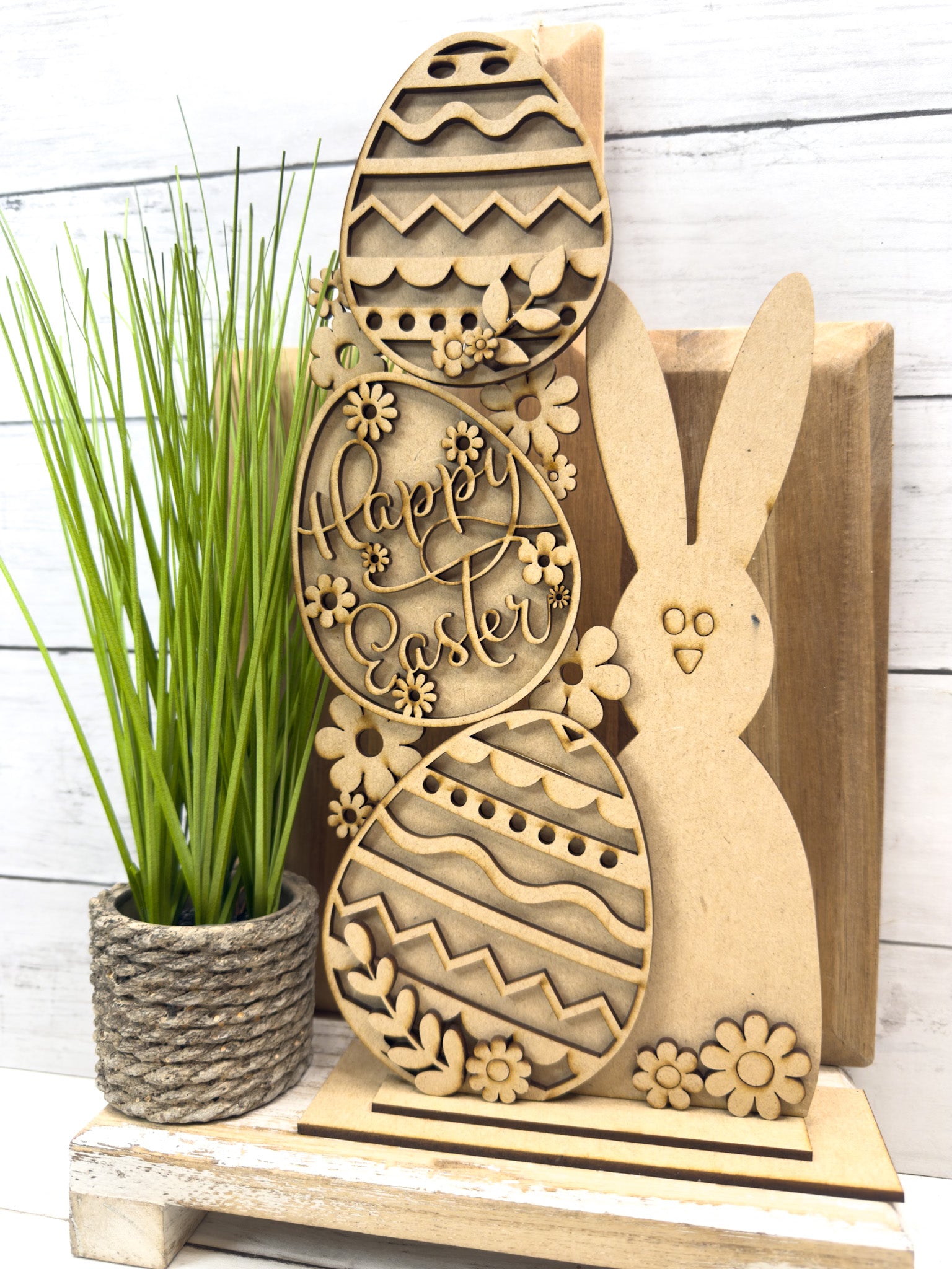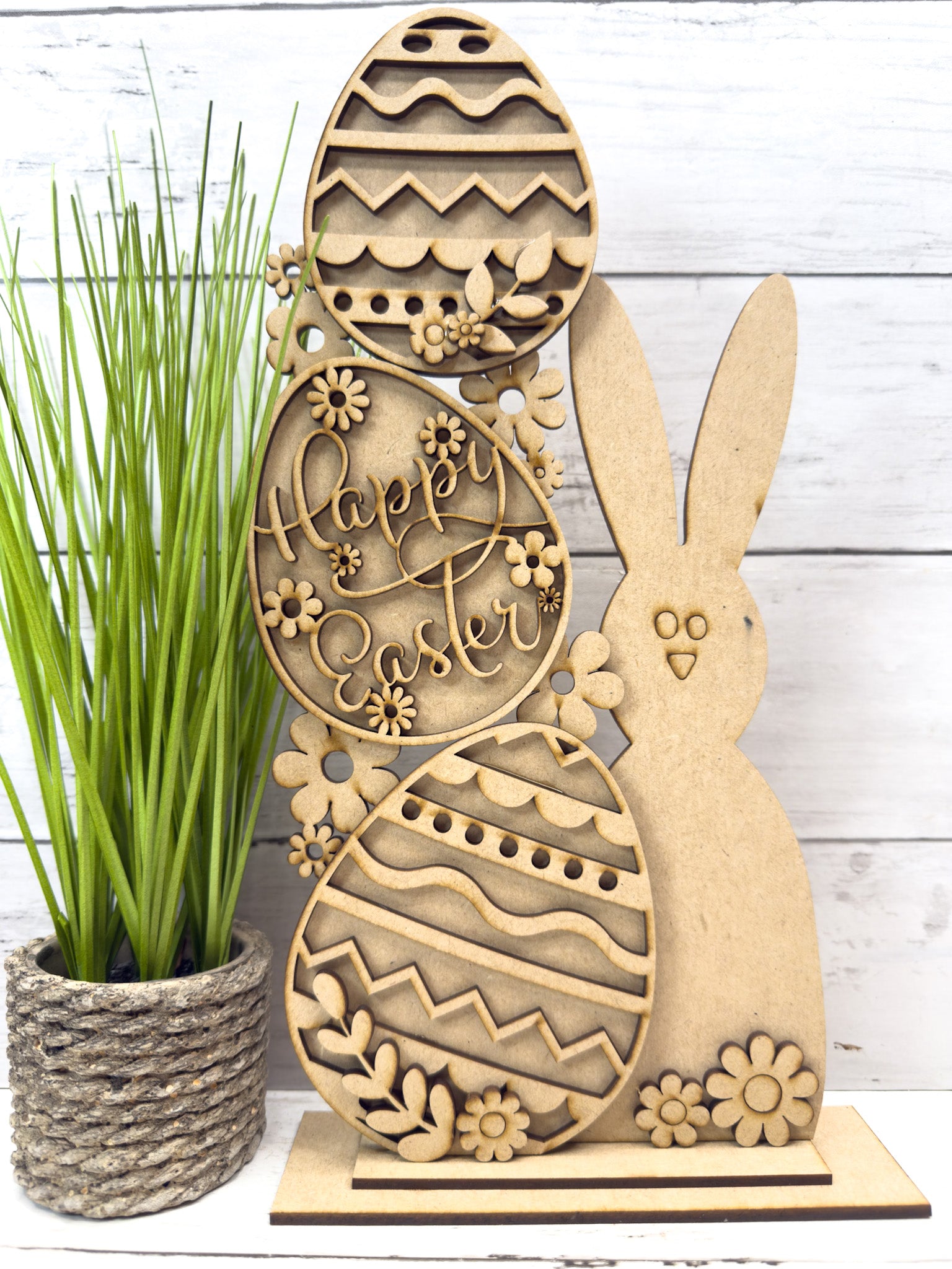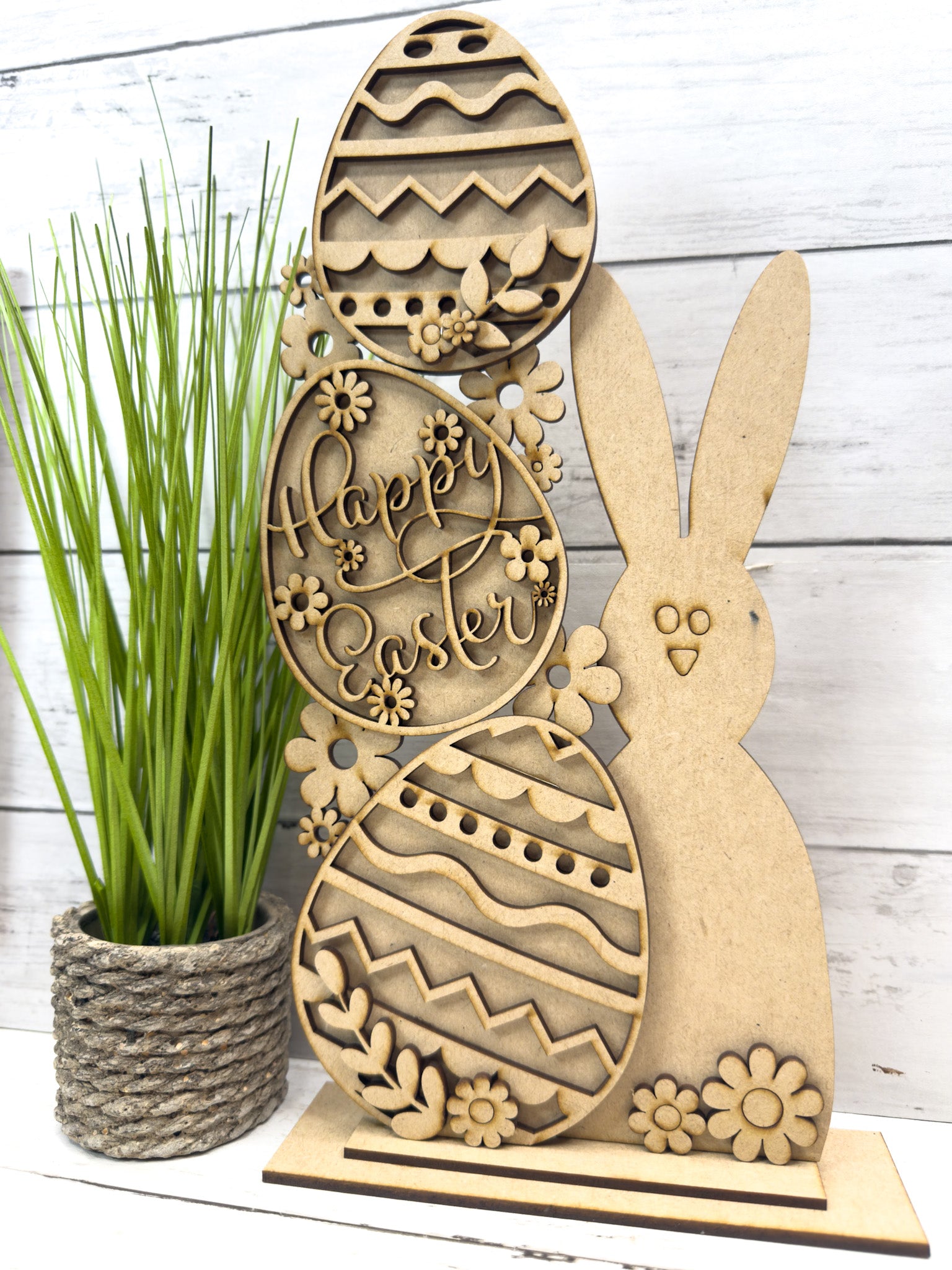 This layered design features a charming bunny paired with stacked patterned eggs, floral accents, and a sturdy base—perfect for painting and customizing your own way.
