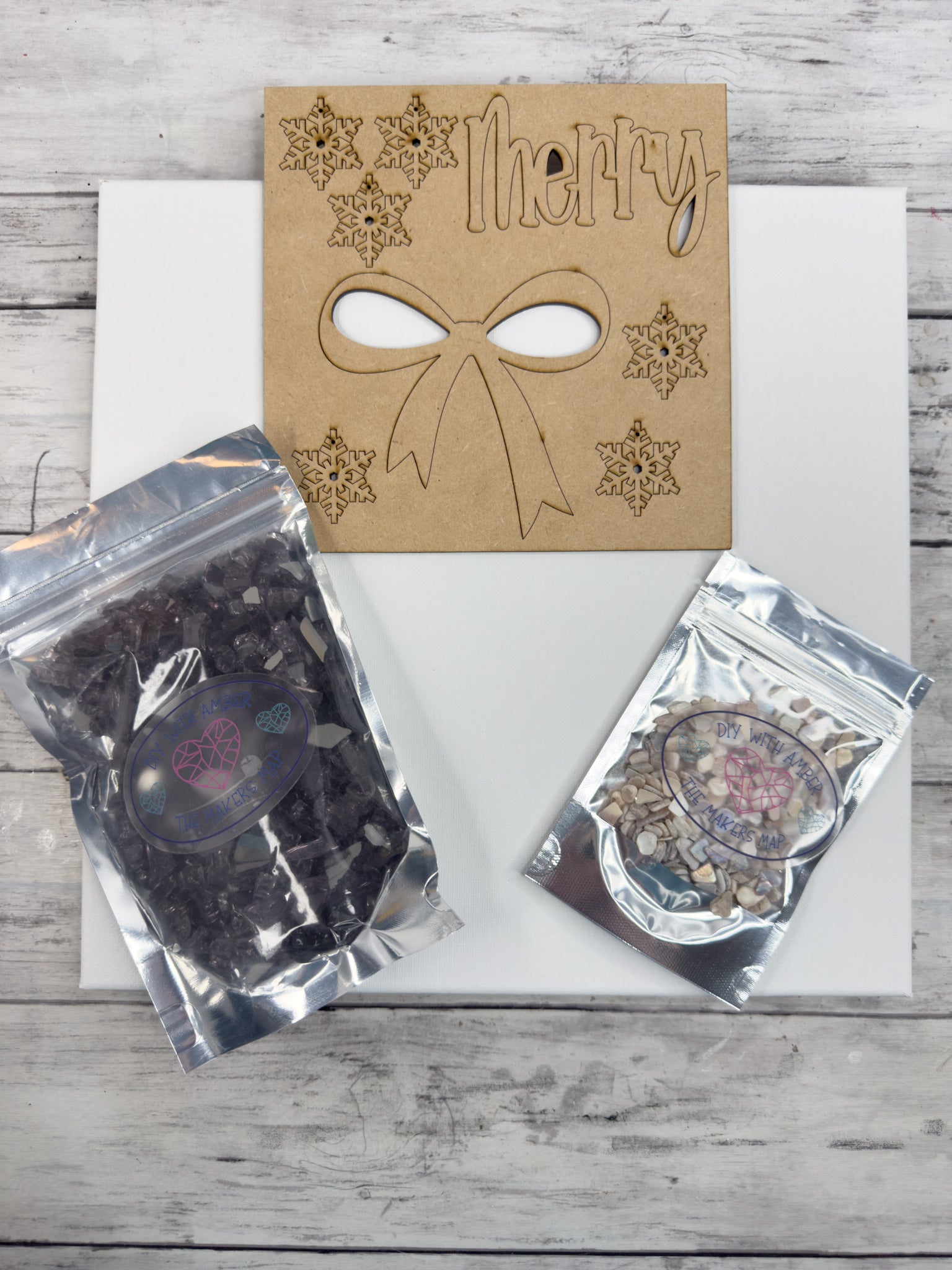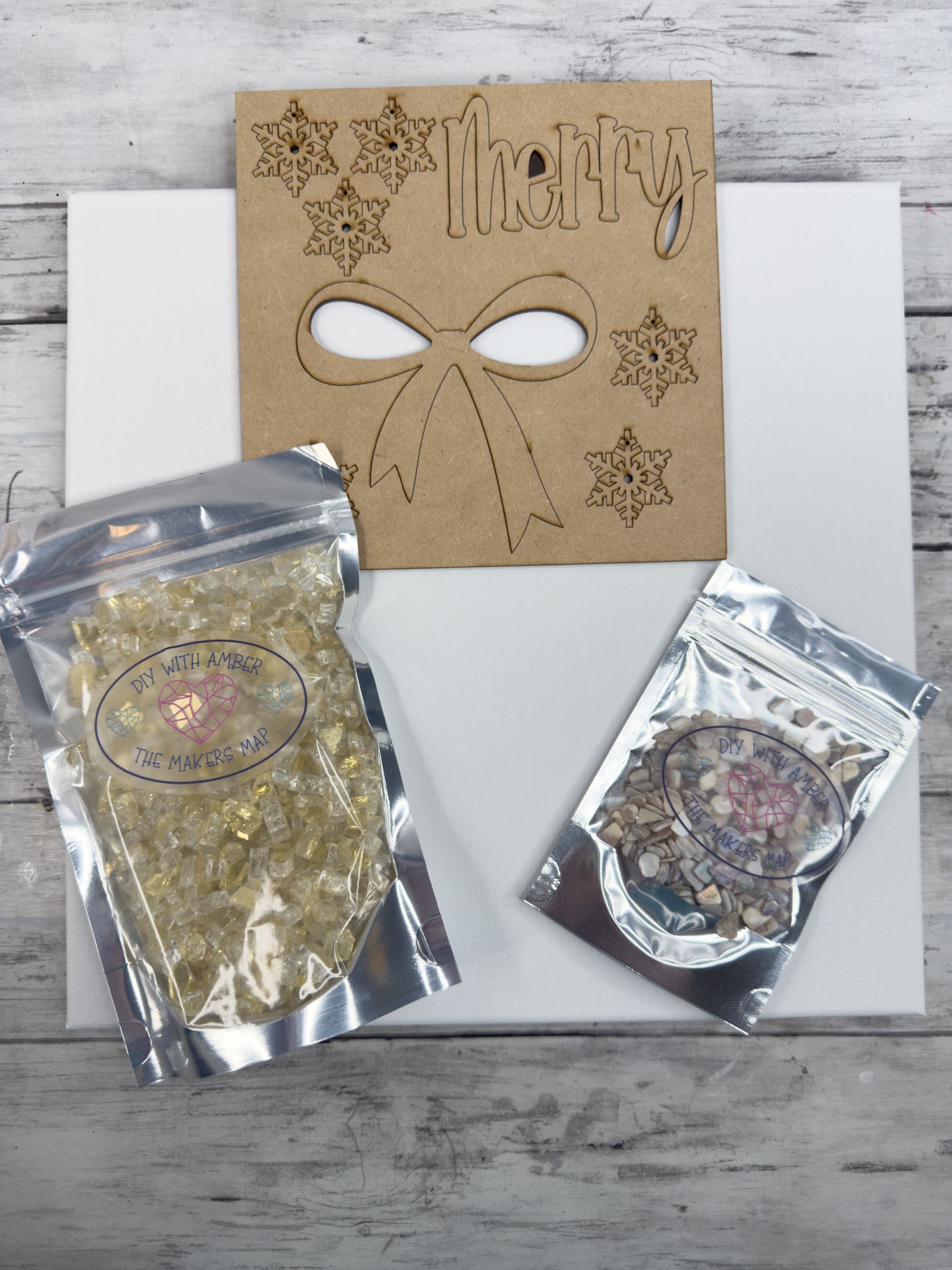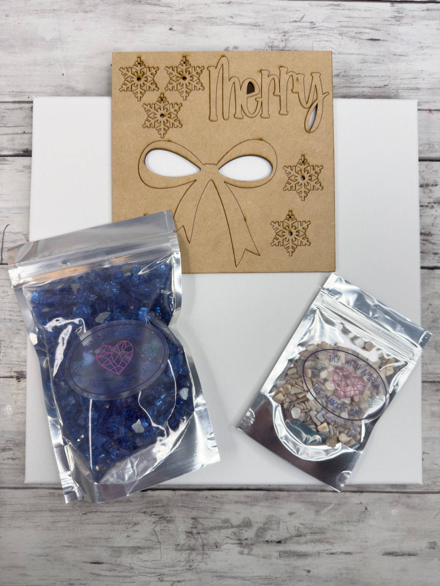 This project kit includes the 12x12 canvas, 16 oz reflective glass (single color of your choice), laser cut out embellishments and 2 oz crushed shell