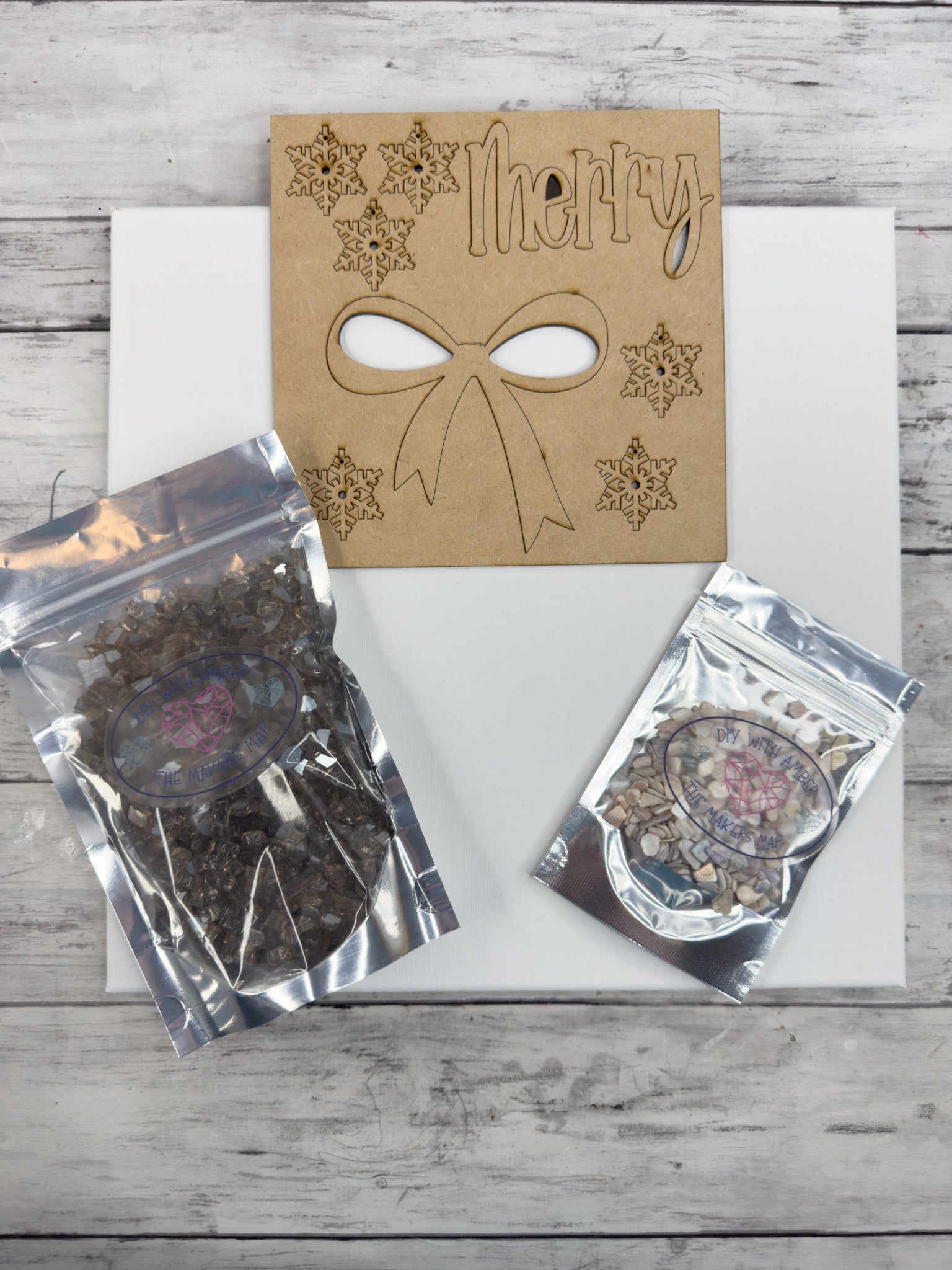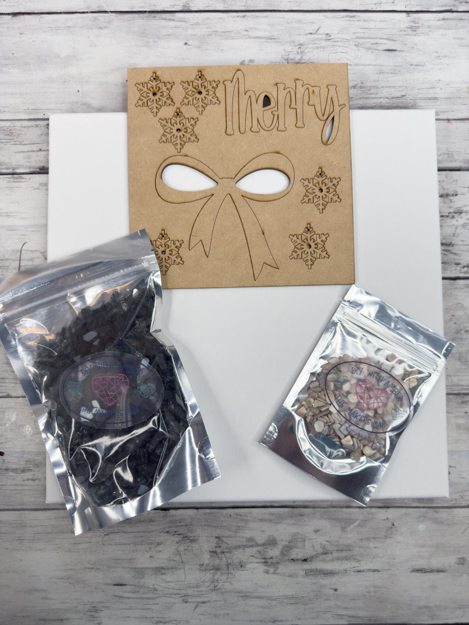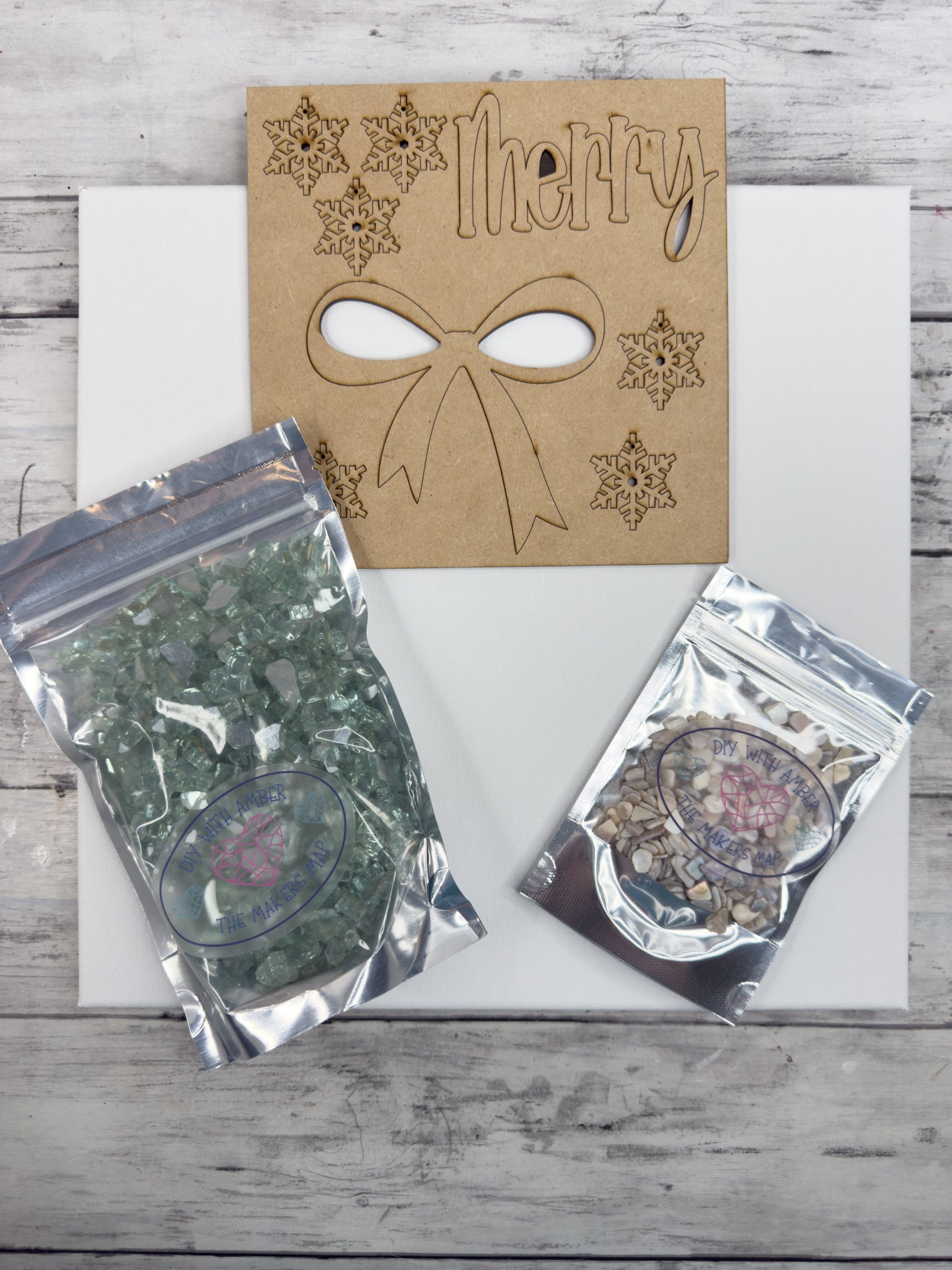 This project kit includes the 12x12 canvas, 16 oz reflective glass (single color of your choice), laser cut out embellishments and 2 oz crushed shell