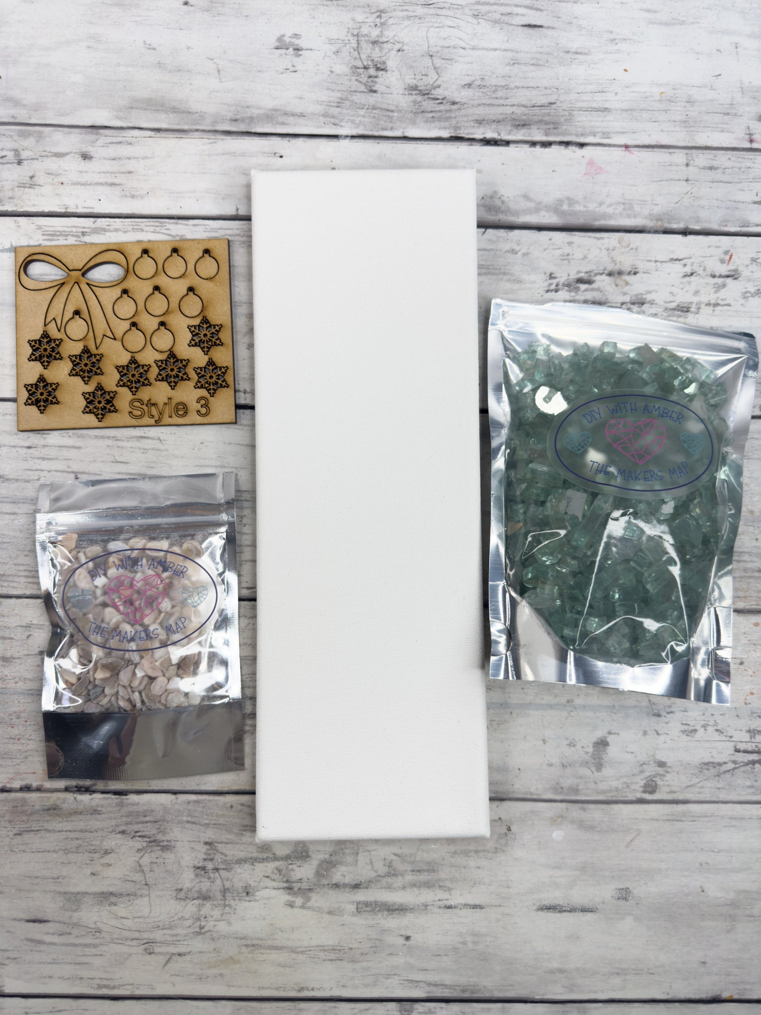 This project kit includes the 4x12 canvas, 16 oz reflective glass (single color of your choice), laser cut out embellishments and 2 oz crushed shell