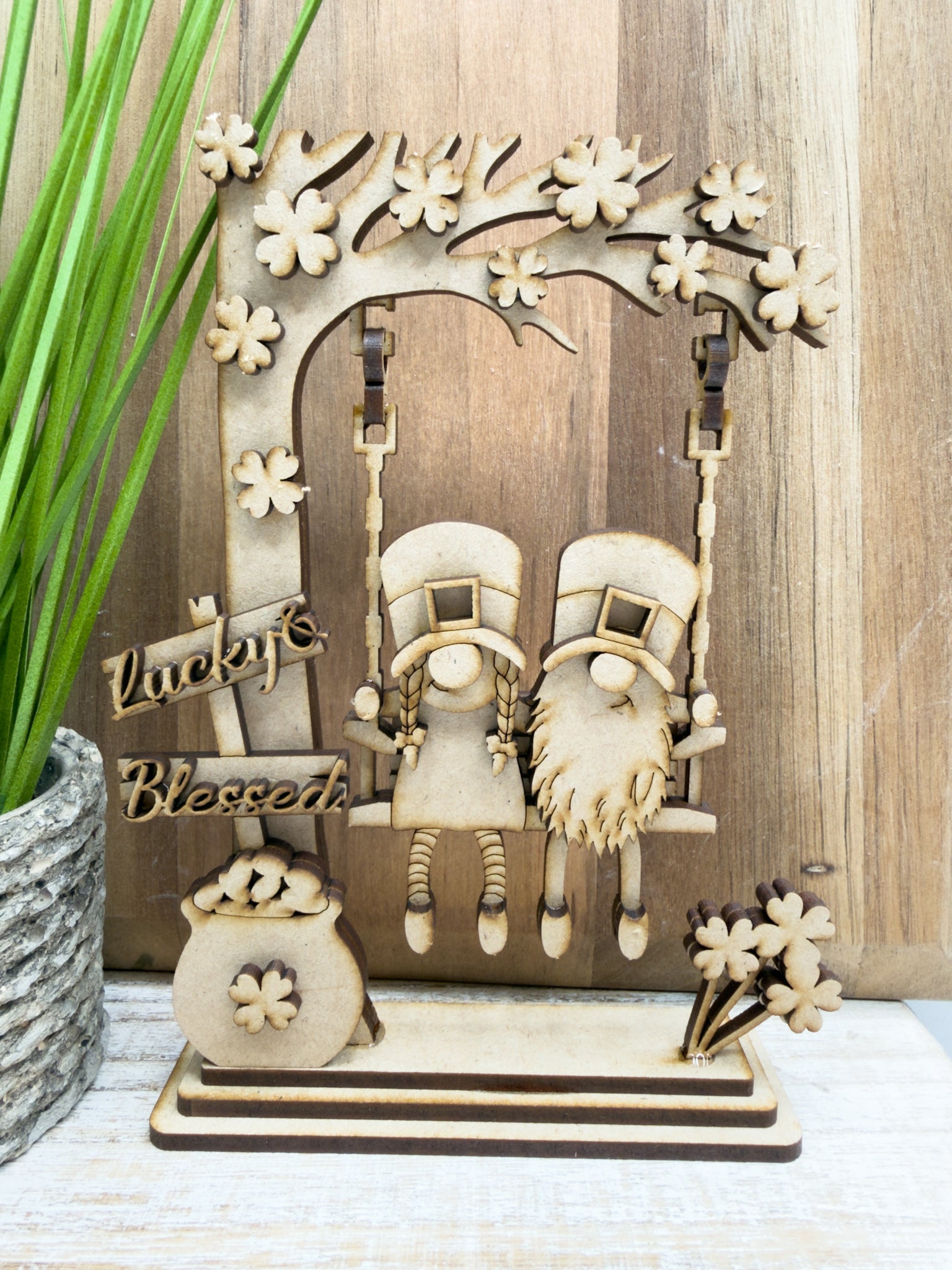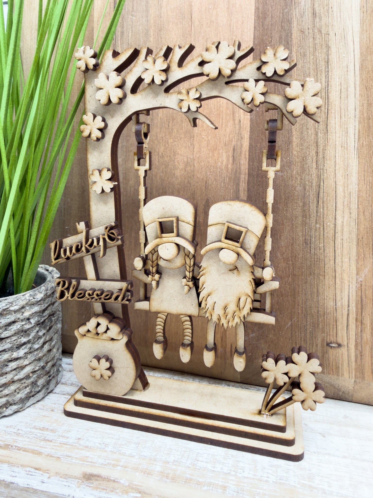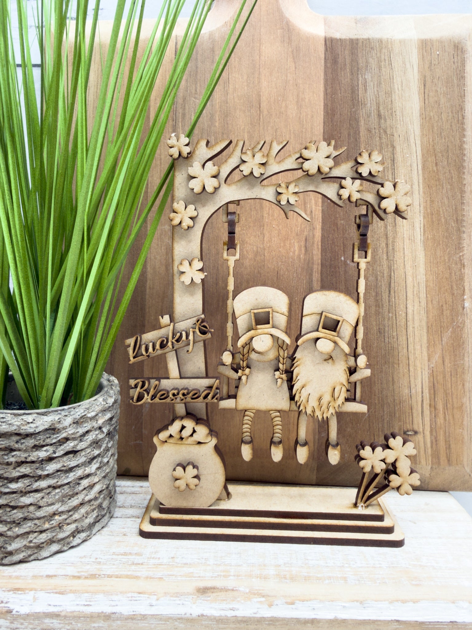 Bring a little lucky vibe to your st Patrick’s day decor with this Swinging leprechaun gnome couple DIY Craft Kit! This unique shelf sitter features a lucky leprechaun swinging — the perfect blend of holiday and cute.