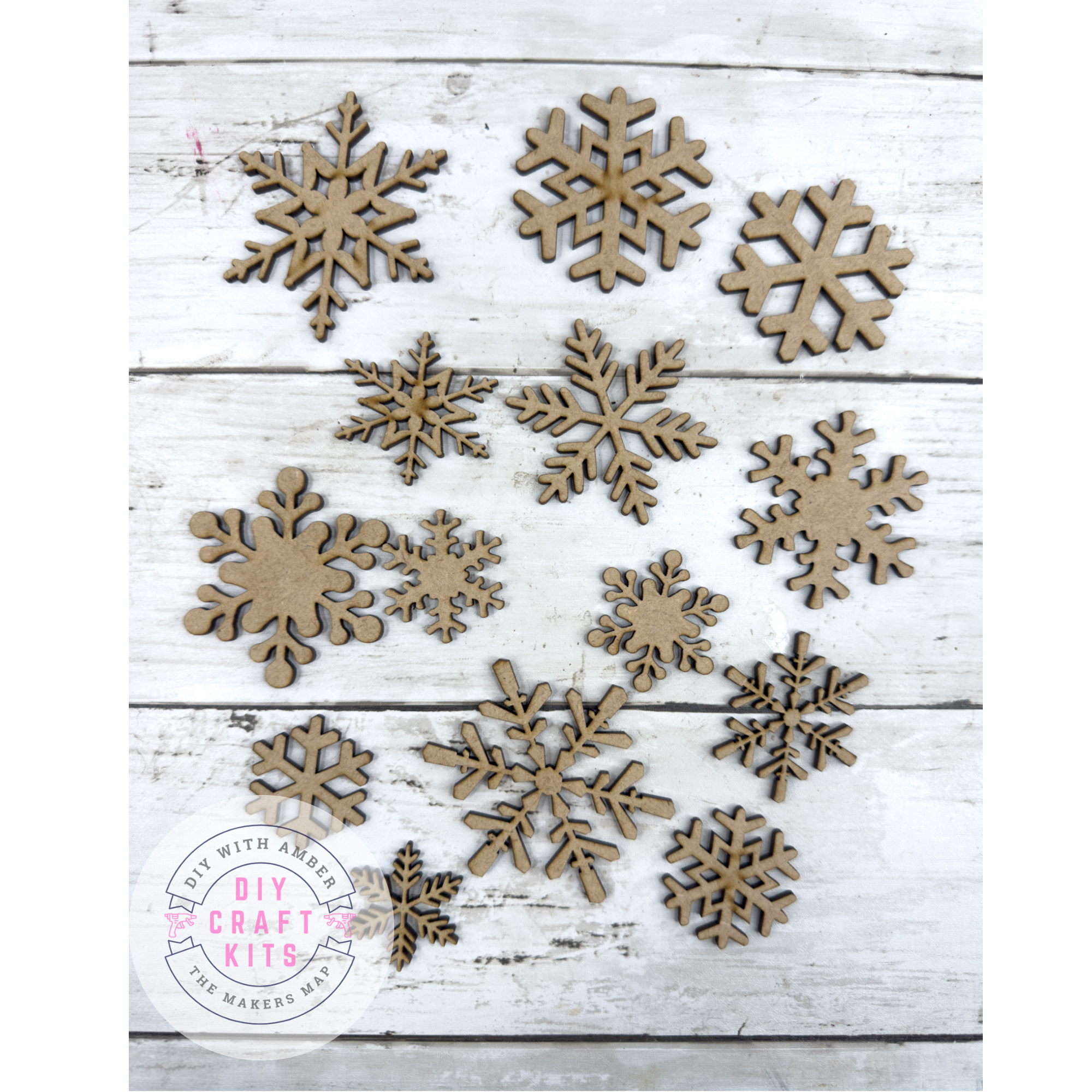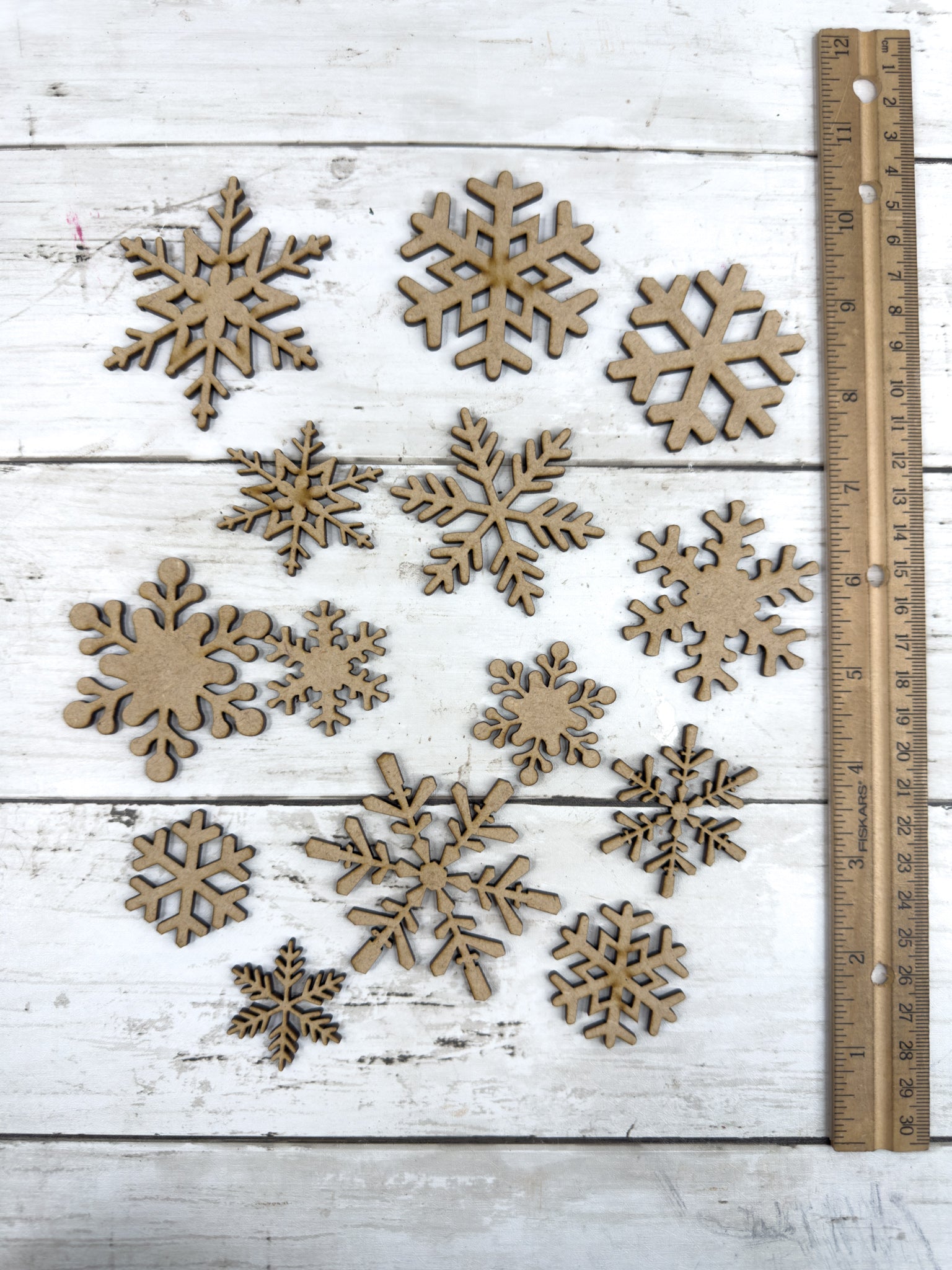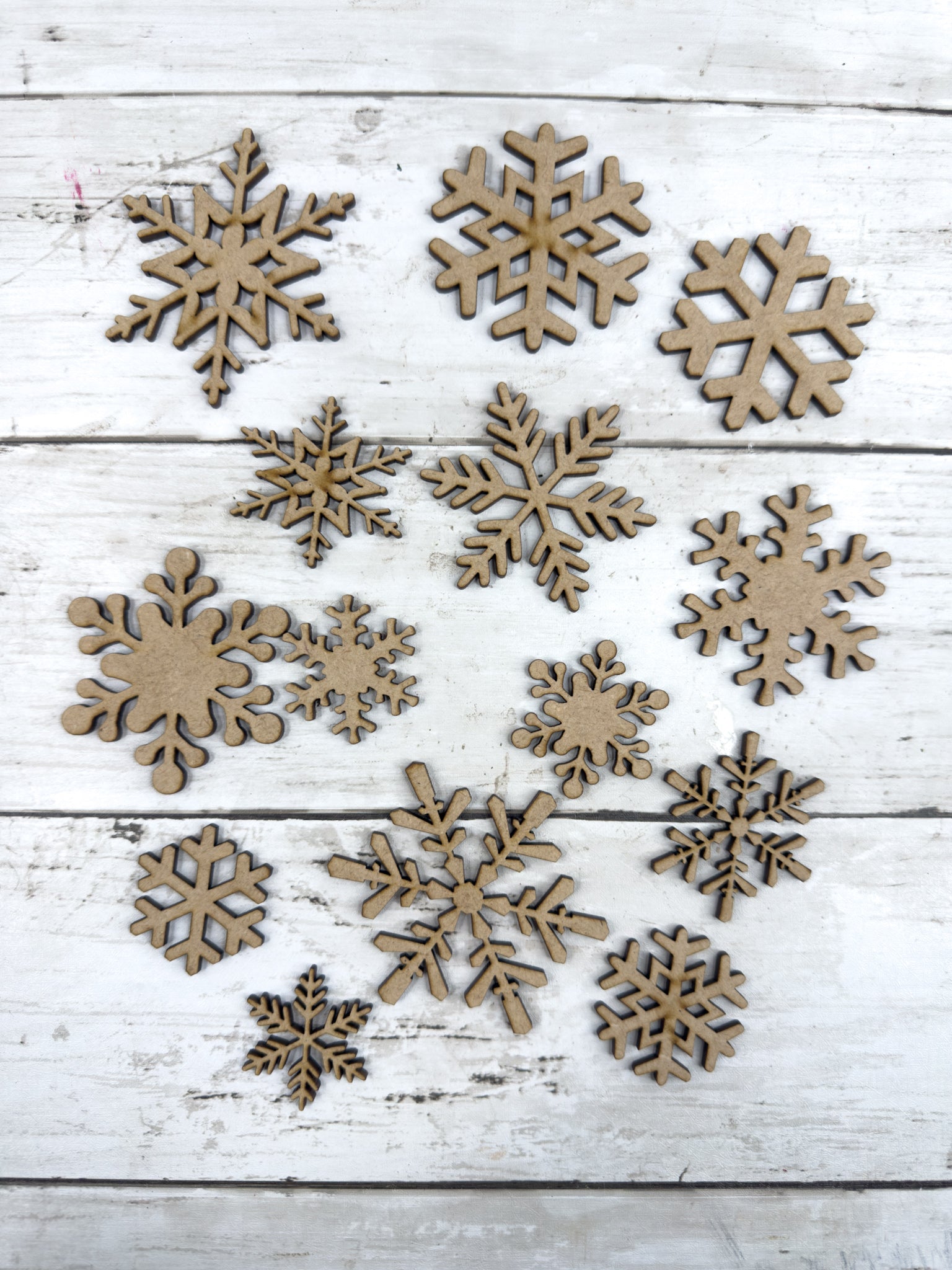 • A variety of unfinished snowflake cutouts in assorted shapes and sizes